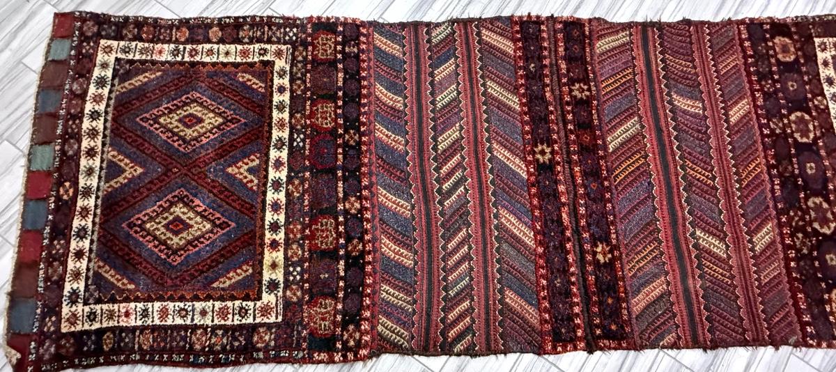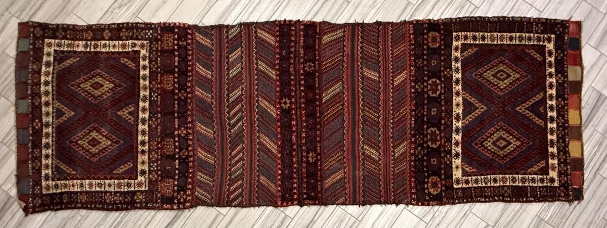 Most likely woven by a nomadic Afghan tribe. This rug features a deep color pallet and does appear to be more than one piece in areas. It is possible this piece was constructed from three pieces. Repeating diamond pattern. 124" Long x 42" Wide. [GF]