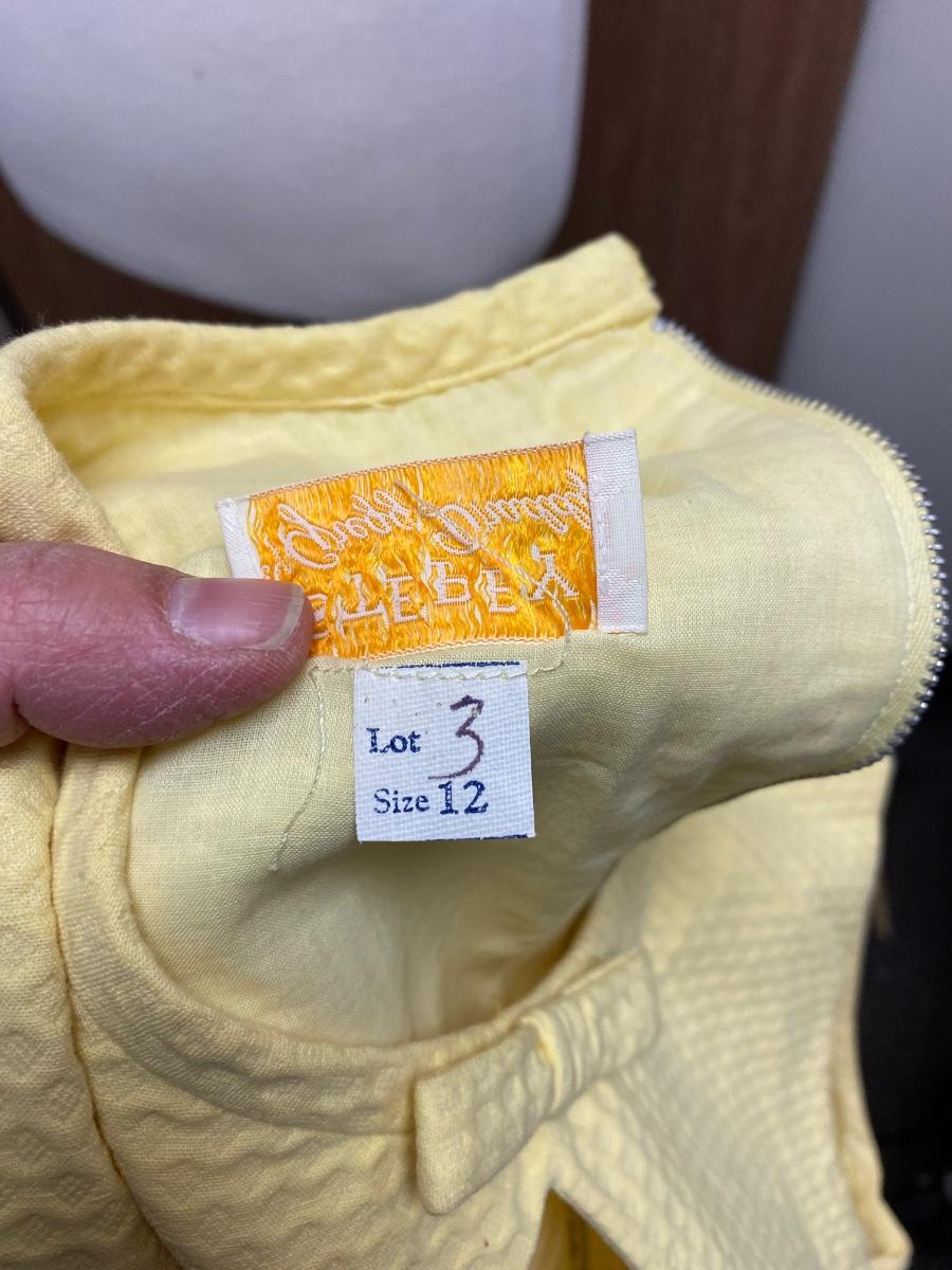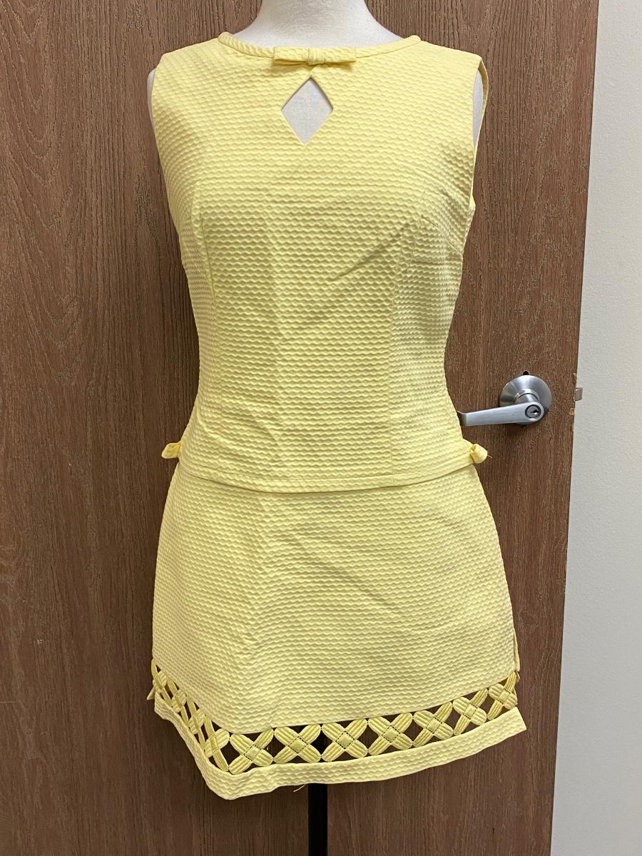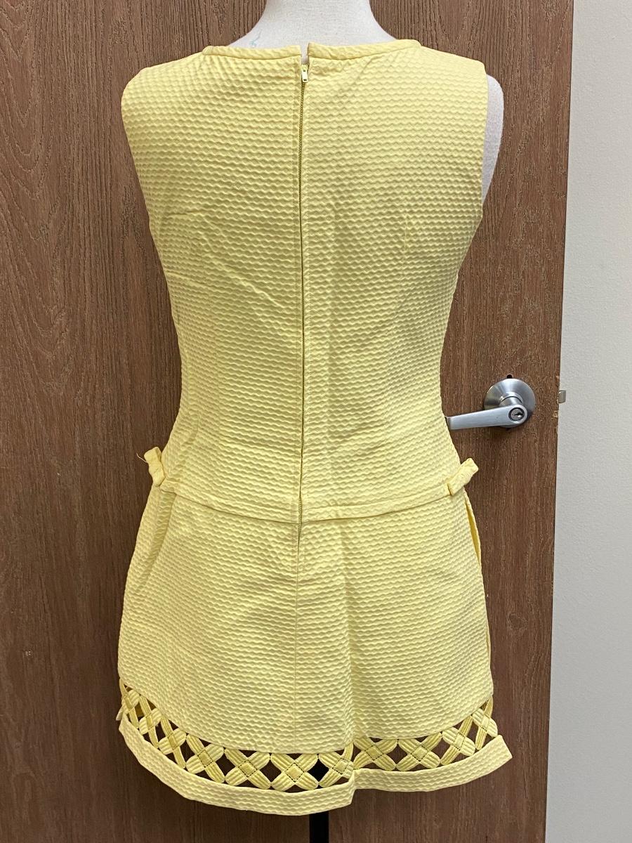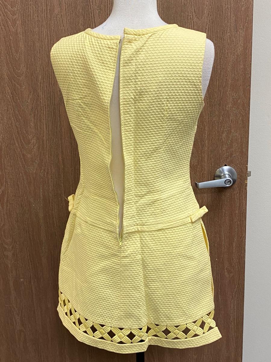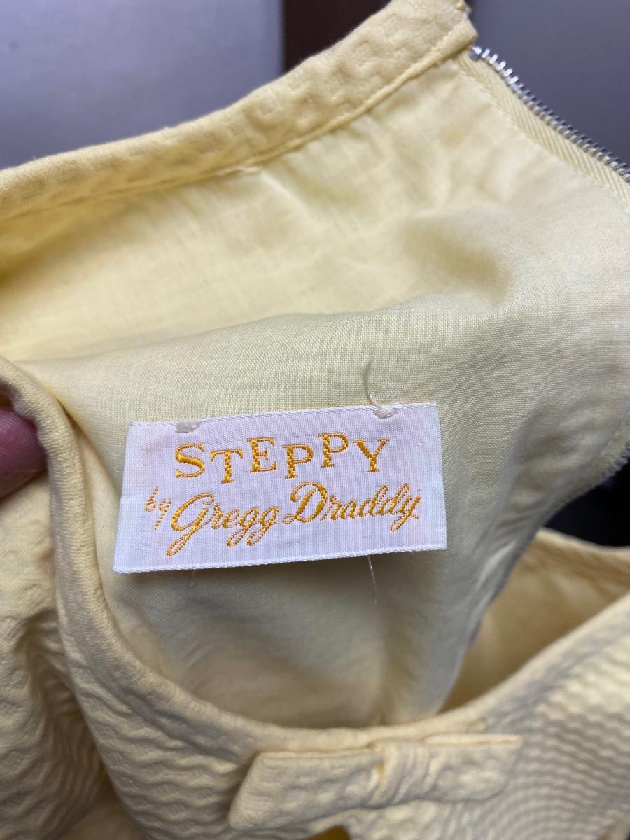 Cute vintage romper dress from Steppy by Gregg Draddy. Banana cream yellow romper looks like a mini dress but has shorts under the skirt. Cut out neckline and flower cut out hem. Textured fabric. Size tag says it is a 12. In very good vintage condition, there is a couple discolor spots, very faint, may come out when cleaned. Zipper back.