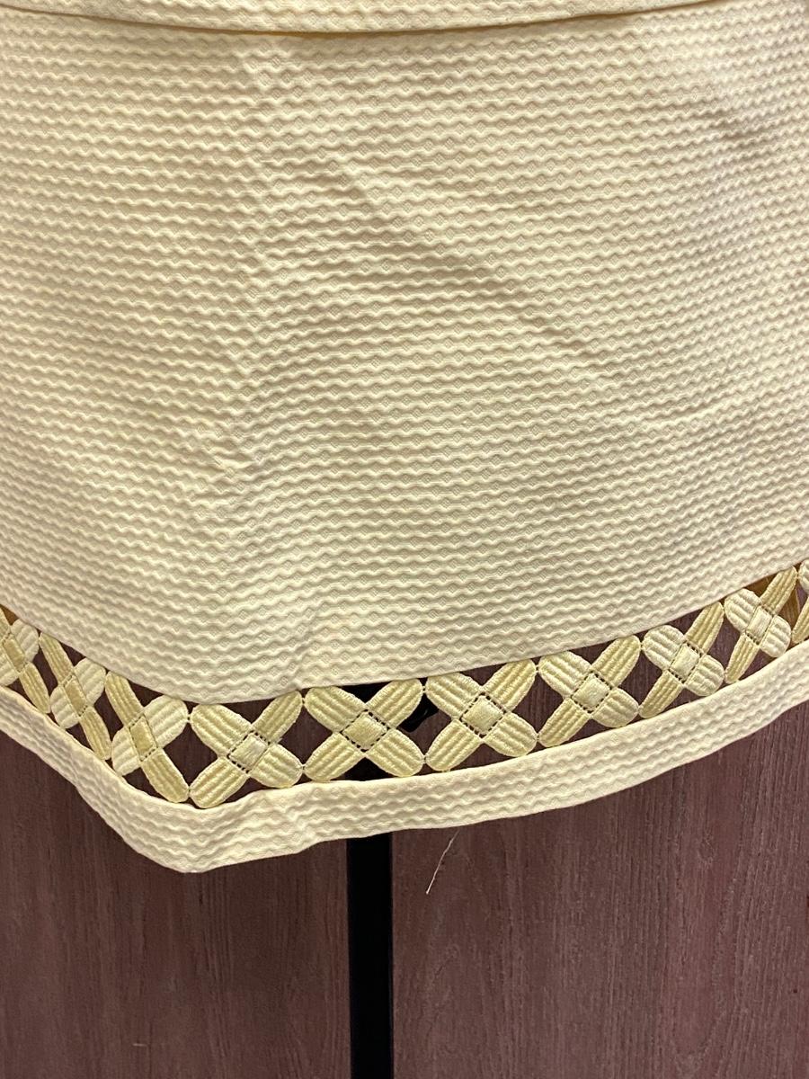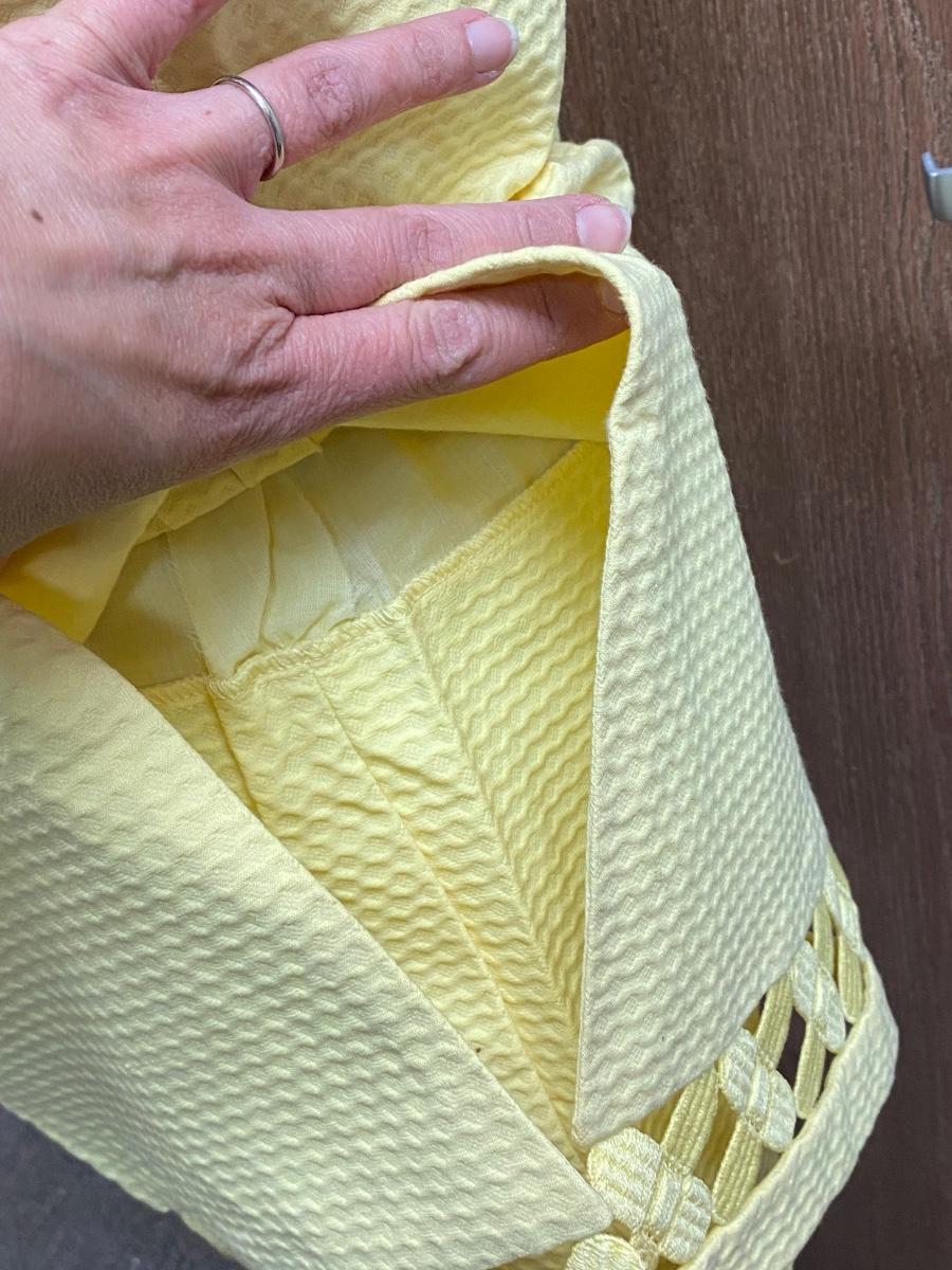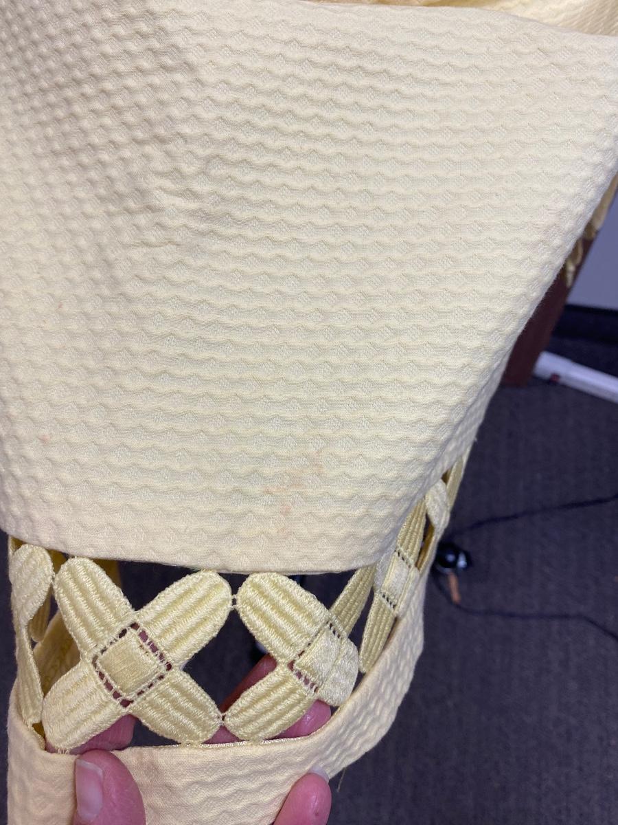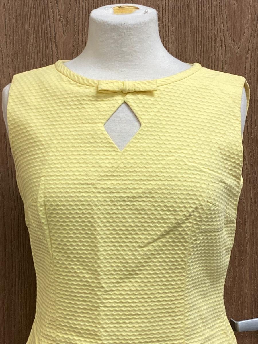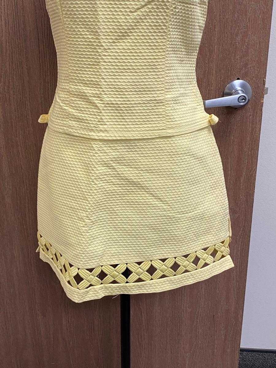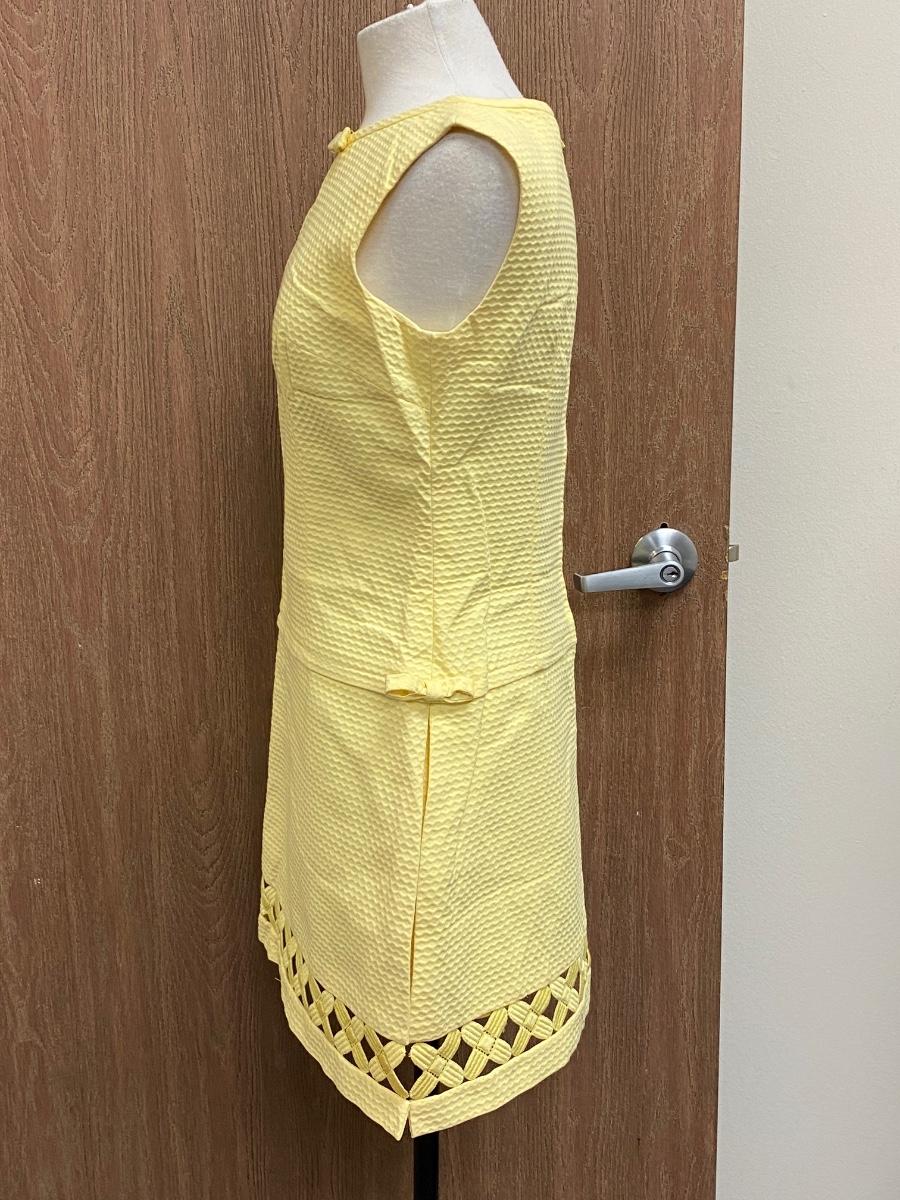 Cute vintage romper dress from Steppy by Gregg Draddy. Banana cream yellow romper looks like a mini dress but has shorts under the skirt. Cut out neckline and flower cut out hem. Textured fabric. Size tag says it is a 12. In very good vintage condition, there is a couple discolor spots, very faint, may come out when cleaned. Zipper back.