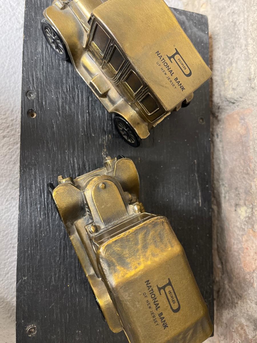 Two Bank of New Jersey coin banks and several cast iron and brass replicas