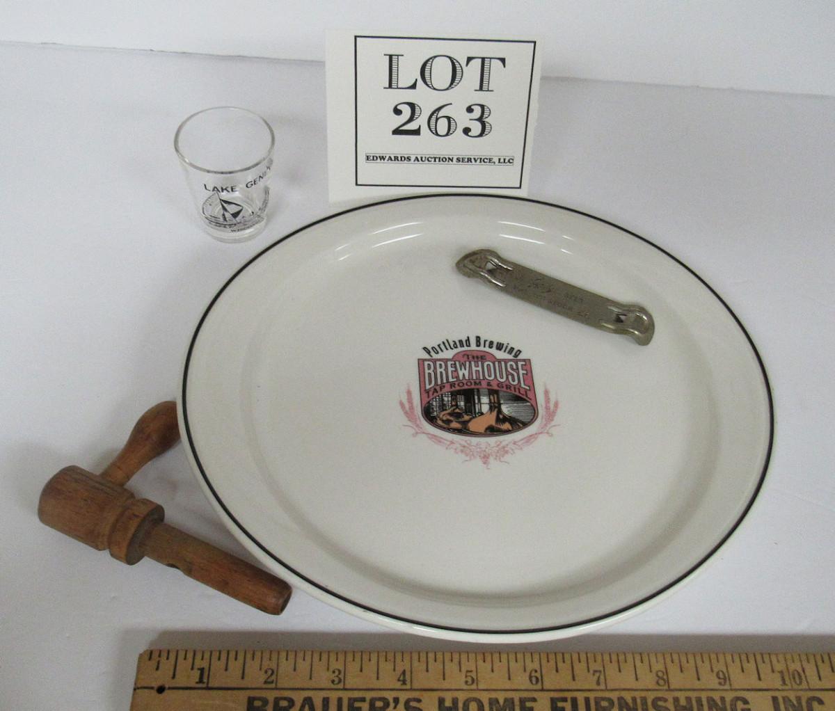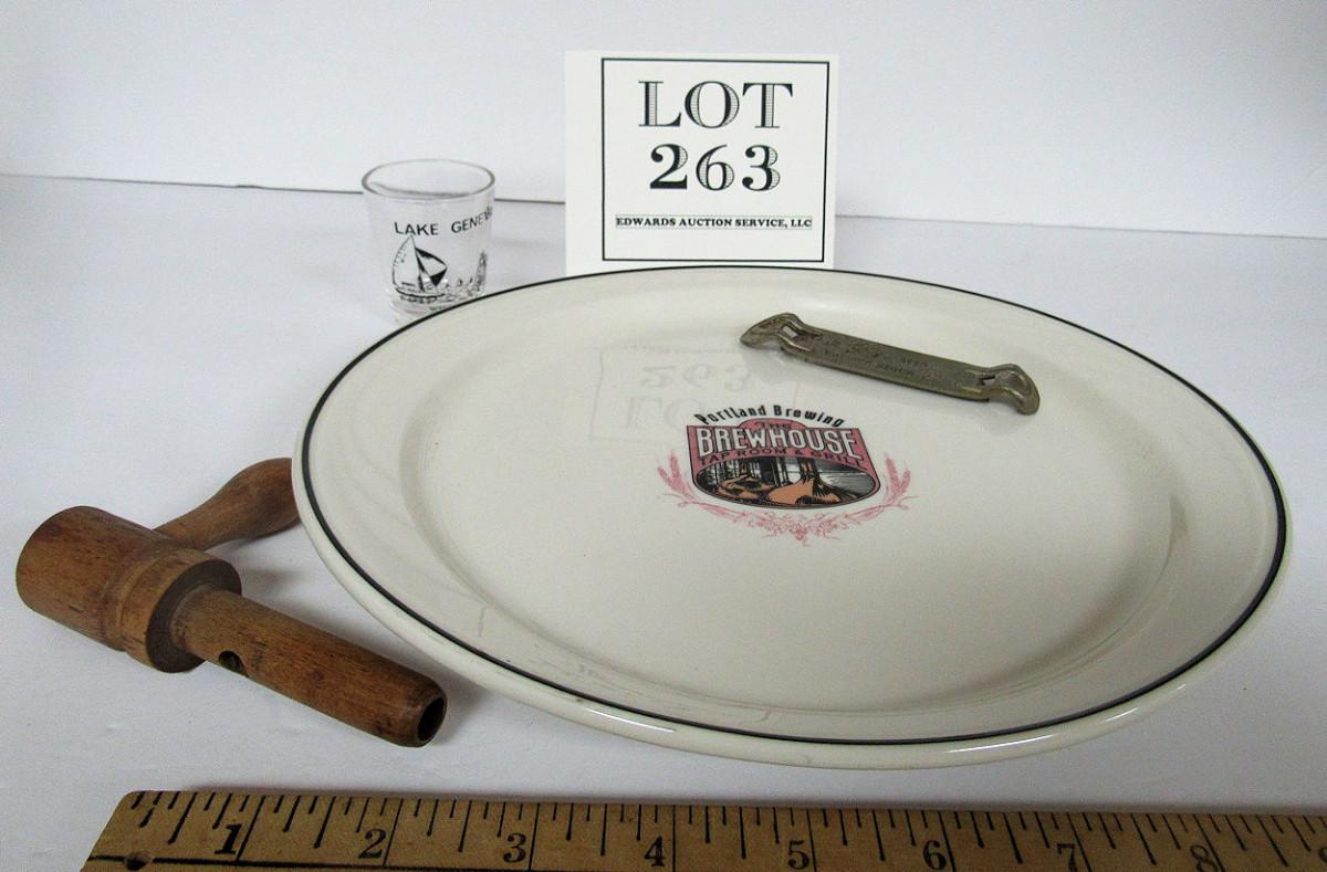 Vintage Bar Related Lot: Lake Geneva Shot Glass, Goebel Bottle Opener, Nice Portland Brewing Brewhouse Tap Room and Grill Platter, Syracuse China