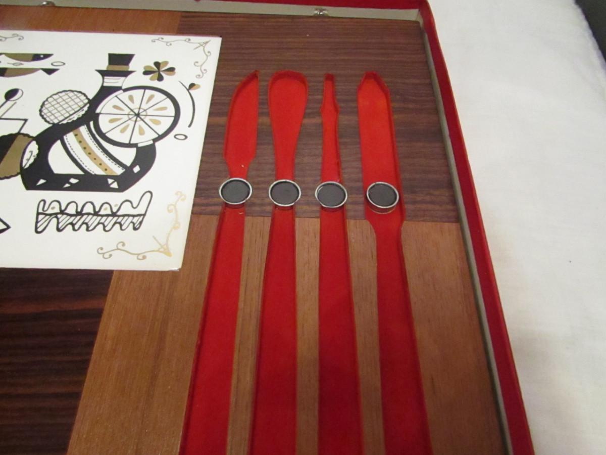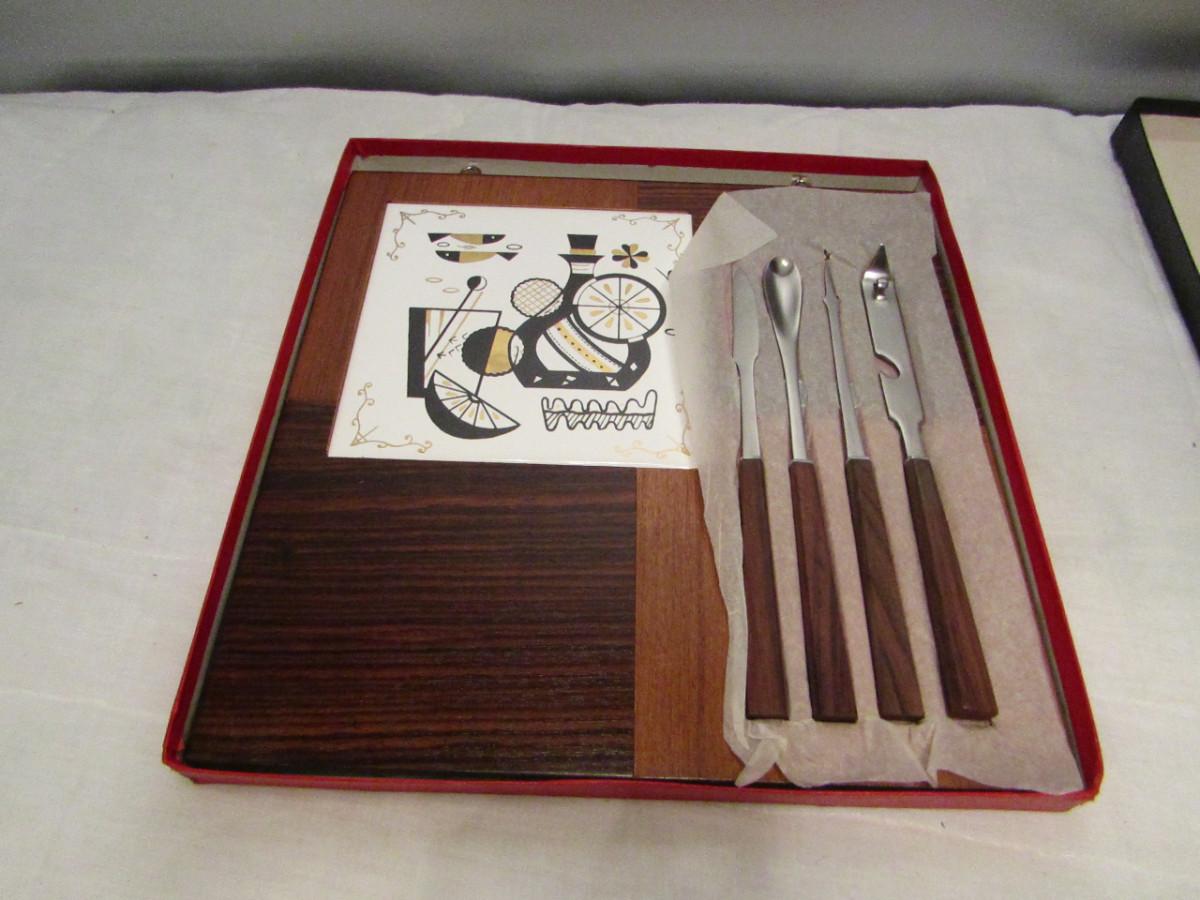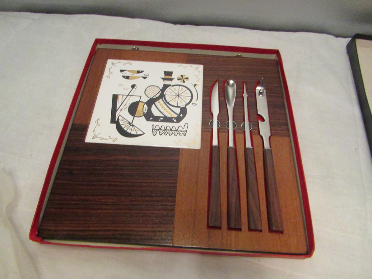Vintage Bar Tool Set with Hanging Wooden Cutting Board with Accent Tile Inlay. Possibly made by Georges Briard.