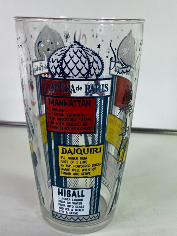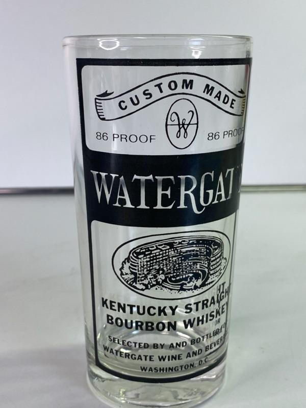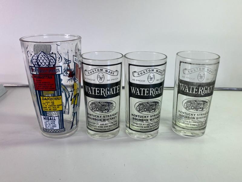 Vintage glass cocktail shaker and three collectable Watergate Kentucky bourbon glasses