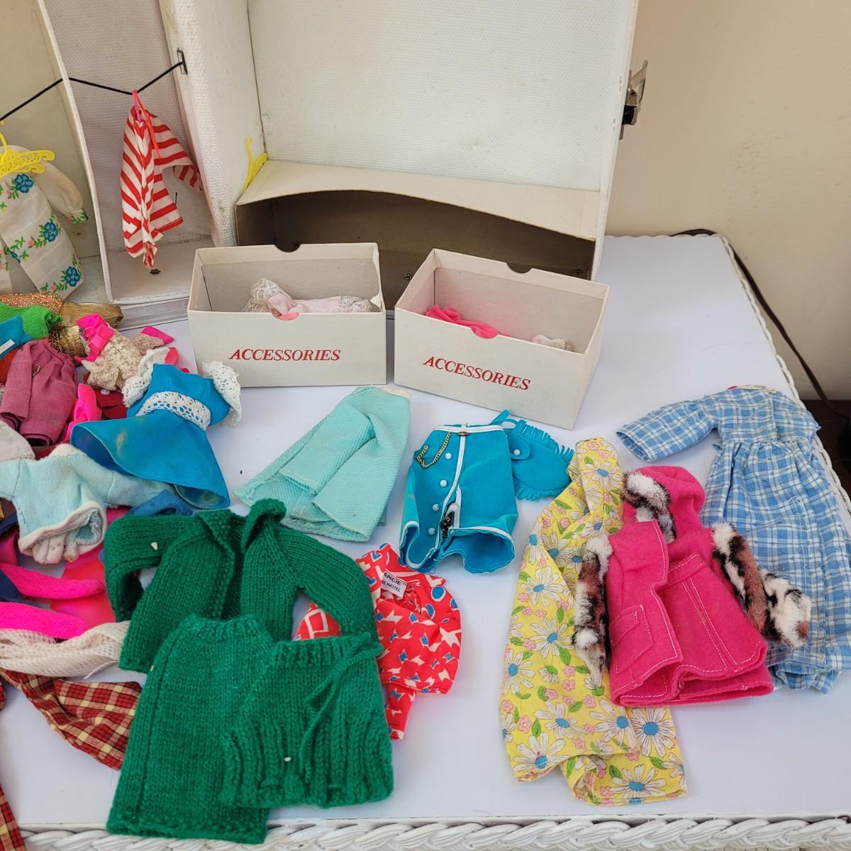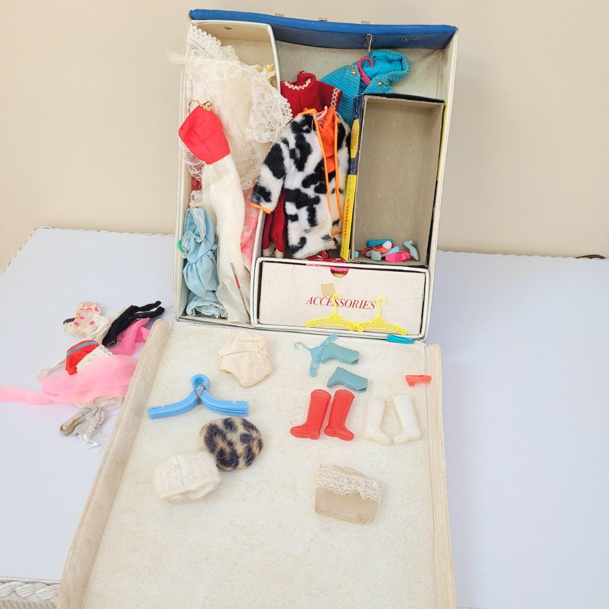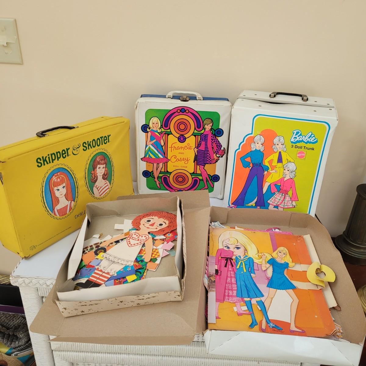 A large assortment of vintage doll accessories, including a Barbie trunk with clothing and accessories, a Frances and Casey trunk with clothing and accessories and a Skipper and Skooter trunk. Barbie and Raggedy Ann paper dolls round out this vintage lot. Note that not every accessory was photographed. Barbie trunk measures approximately 10.5"L x7"W x13"H. Shipping available.