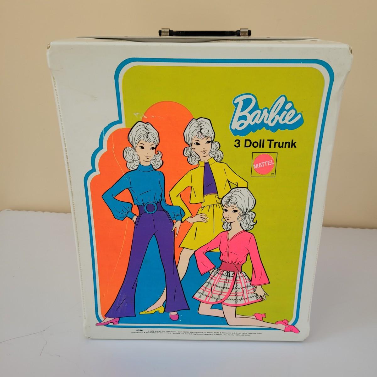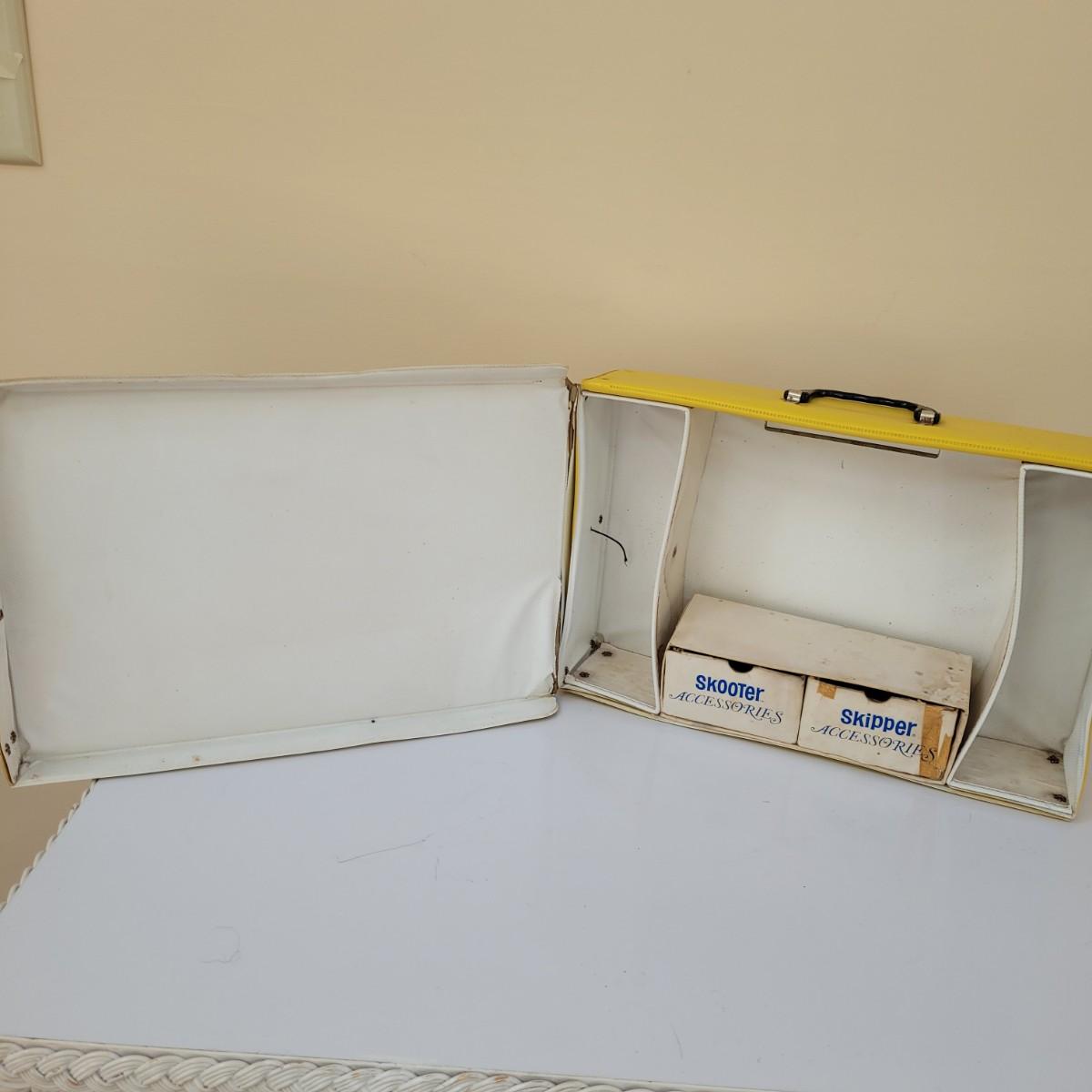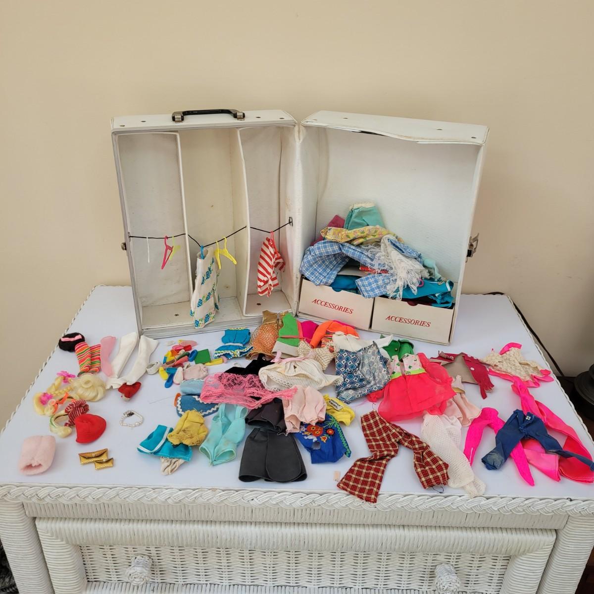 A large assortment of vintage doll accessories, including a Barbie trunk with clothing and accessories, a Frances and Casey trunk with clothing and accessories and a Skipper and Skooter trunk. Barbie and Raggedy Ann paper dolls round out this vintage lot. Note that not every accessory was photographed. Barbie trunk measures approximately 10.5"L x7"W x13"H. Shipping available.