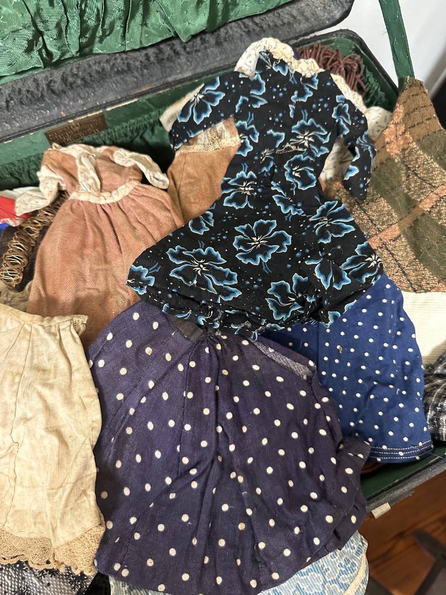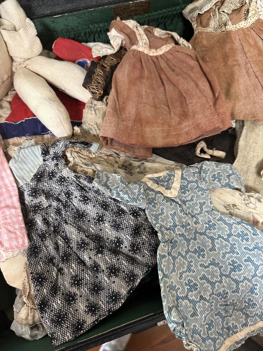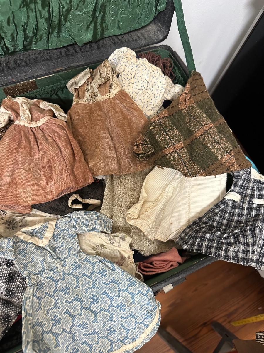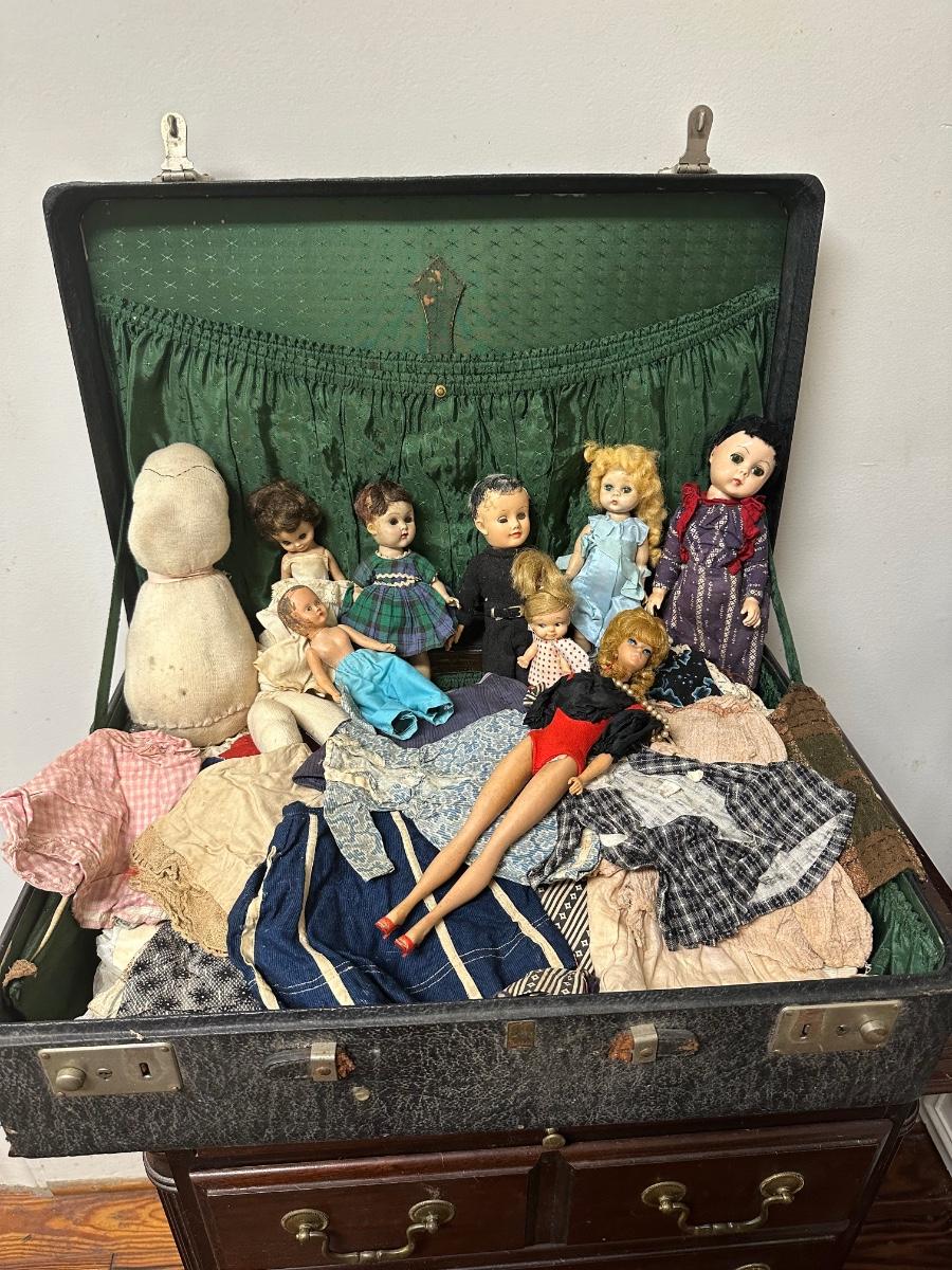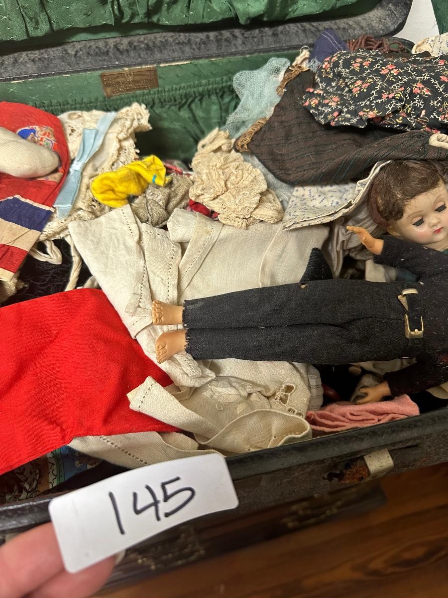 VINTAGE BARBIE, ANTIQUE DOLLS INCLUDING ONE SOCK DOLL & MISC ANTIQUE DOLL CLOTHES IN TRUNK AS PICTURED