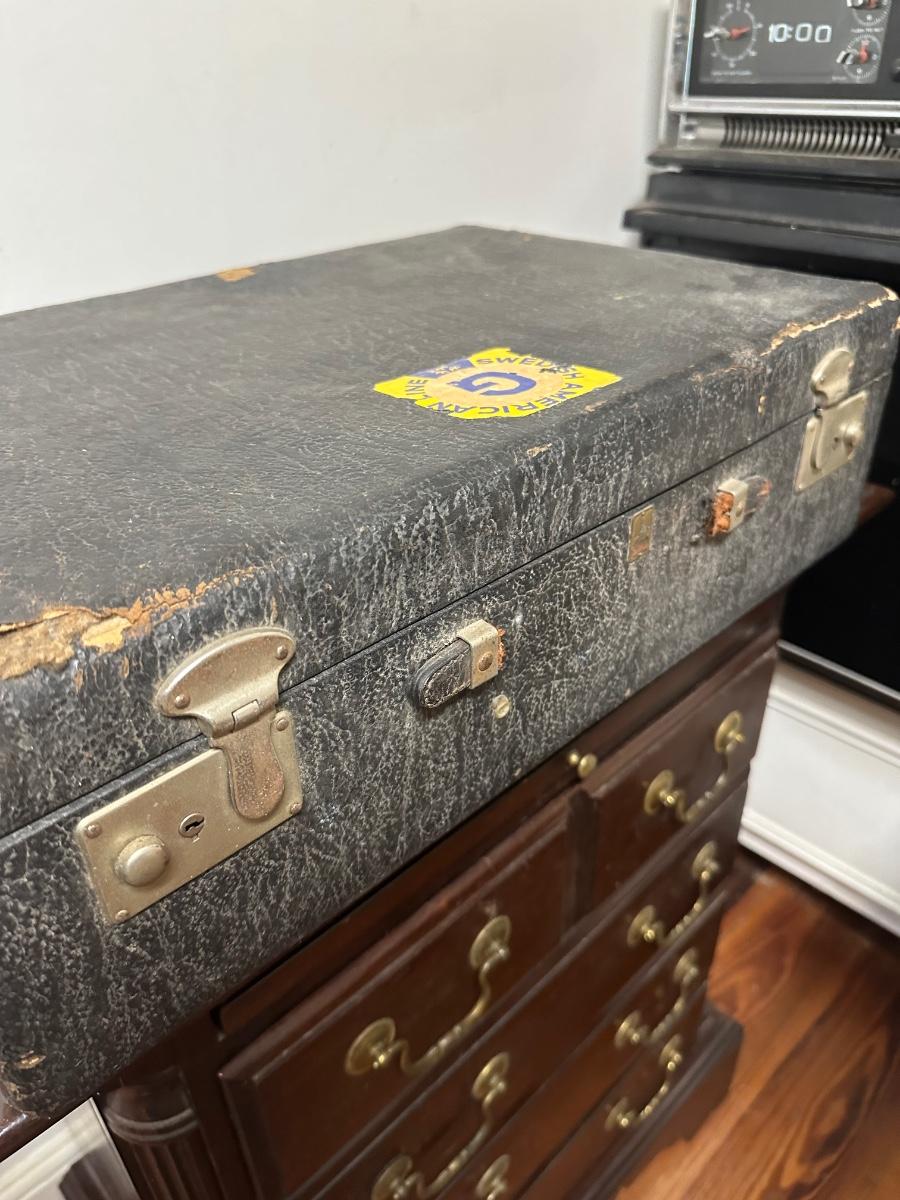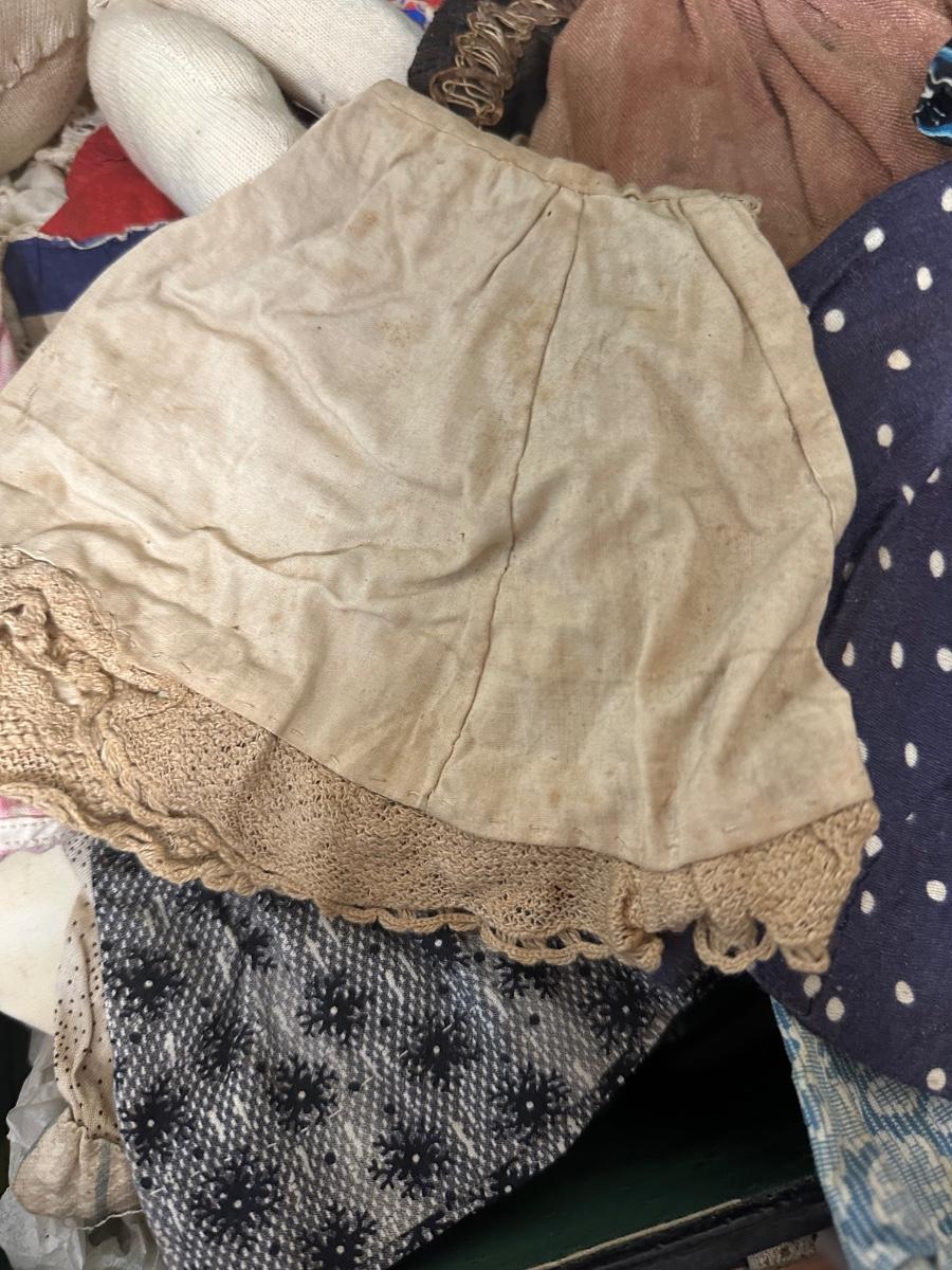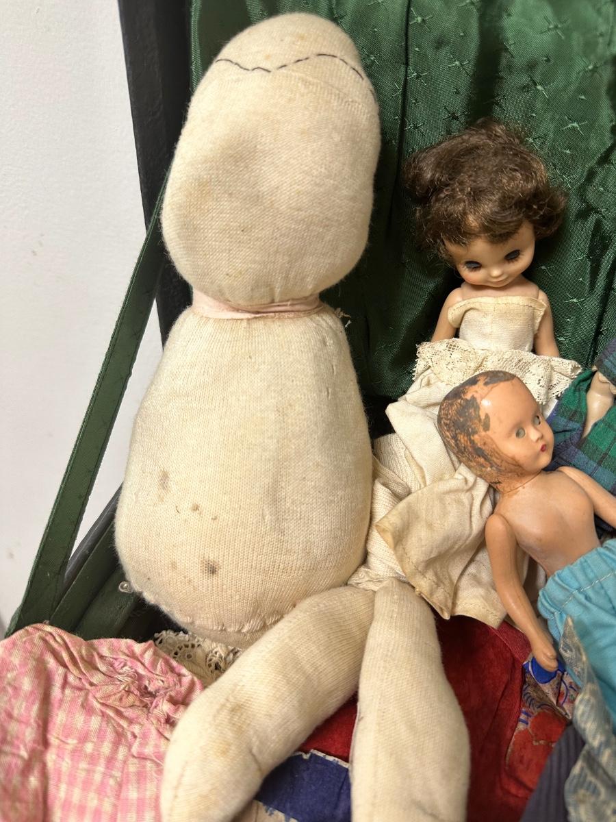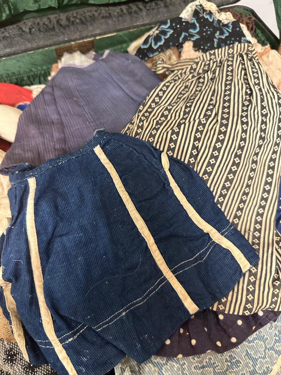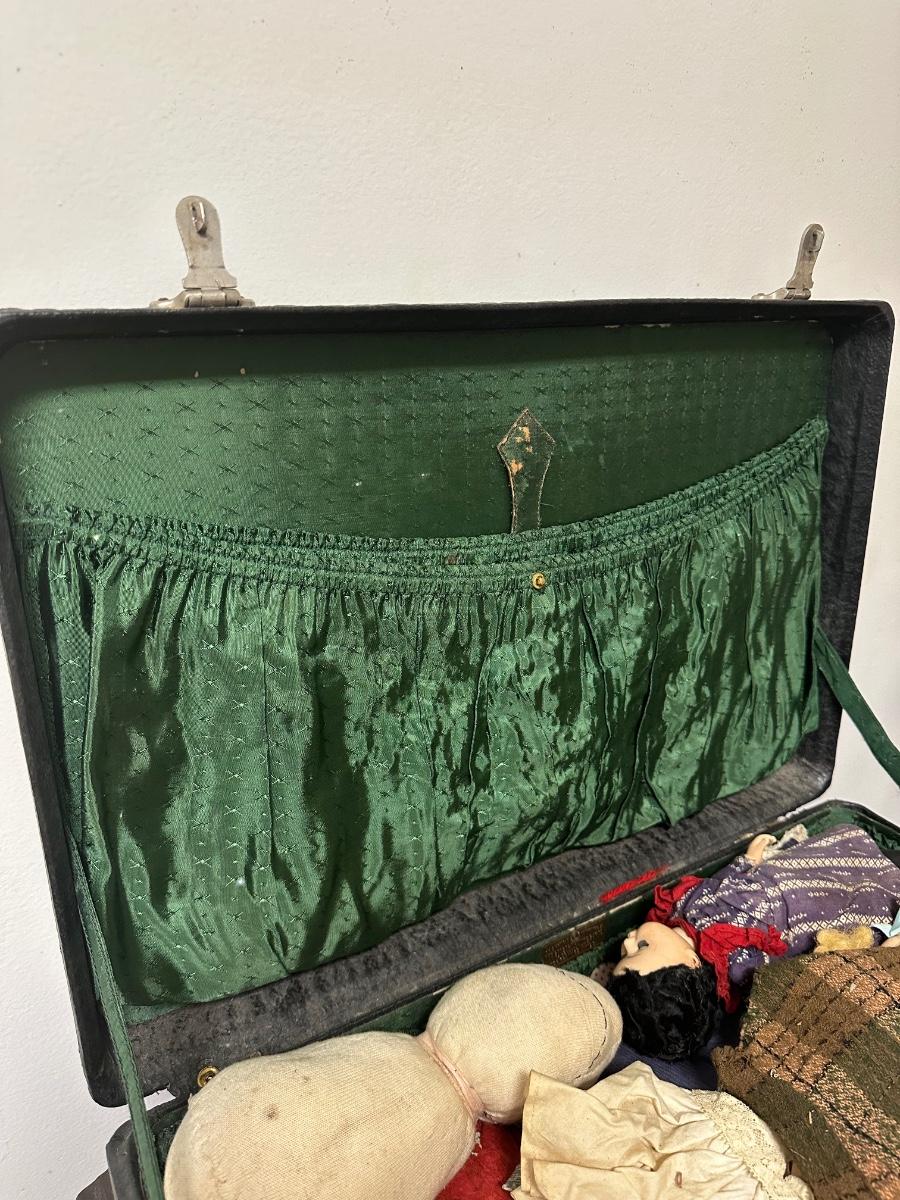 VINTAGE BARBIE, ANTIQUE DOLLS INCLUDING ONE SOCK DOLL & MISC ANTIQUE DOLL CLOTHES IN TRUNK AS PICTURED