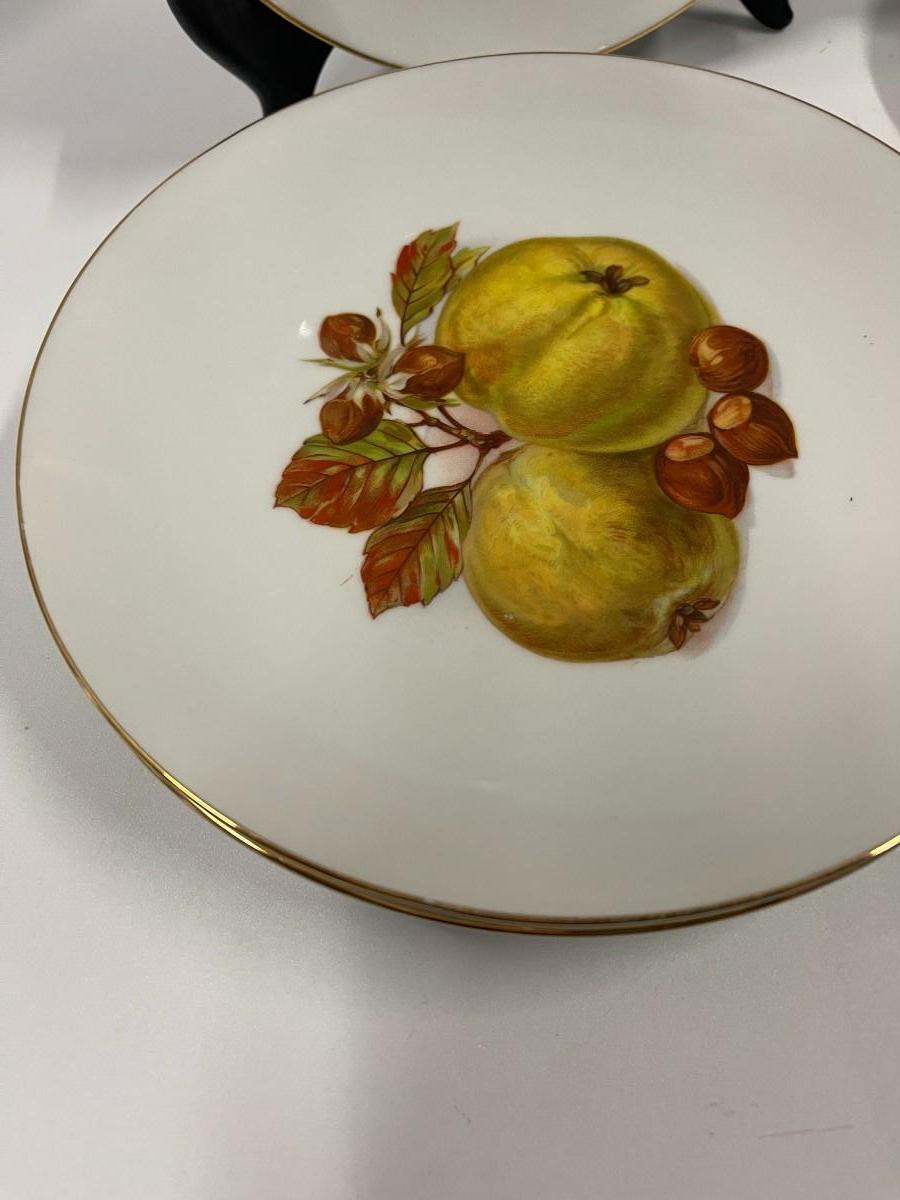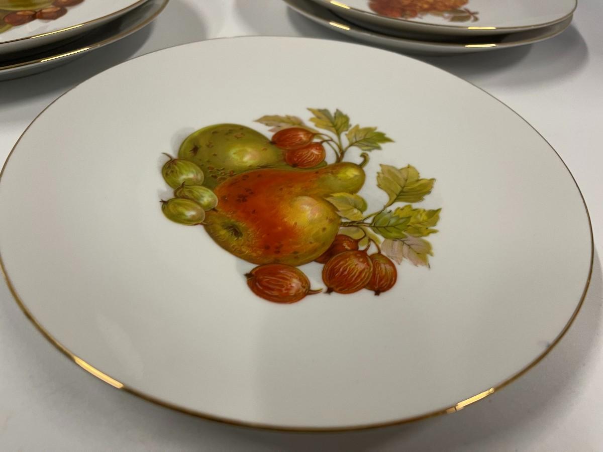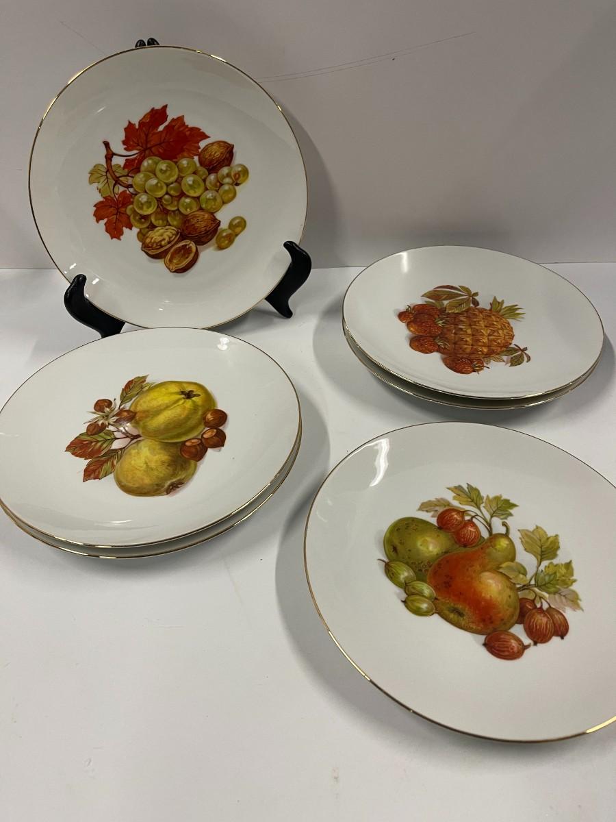 Vintage Bareuther Waldsassen Bavarian porcelain plates with fruit pattern. There are 6 plates in total. 2 each of one pattern and one each of two other patterns making it an incomplete set. some of the gold rims show some wear. 7 3/4".
