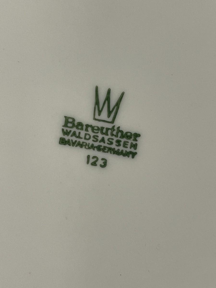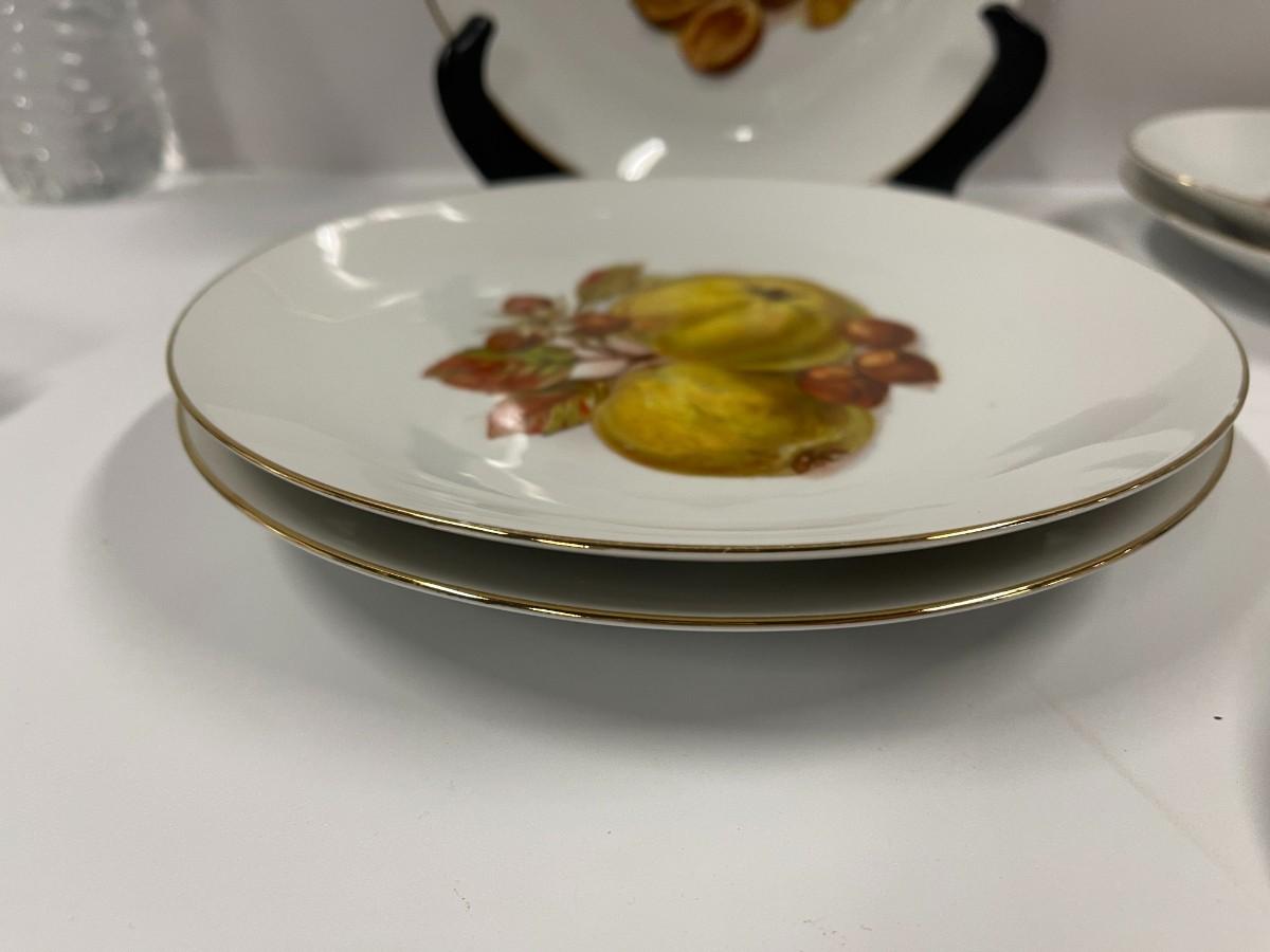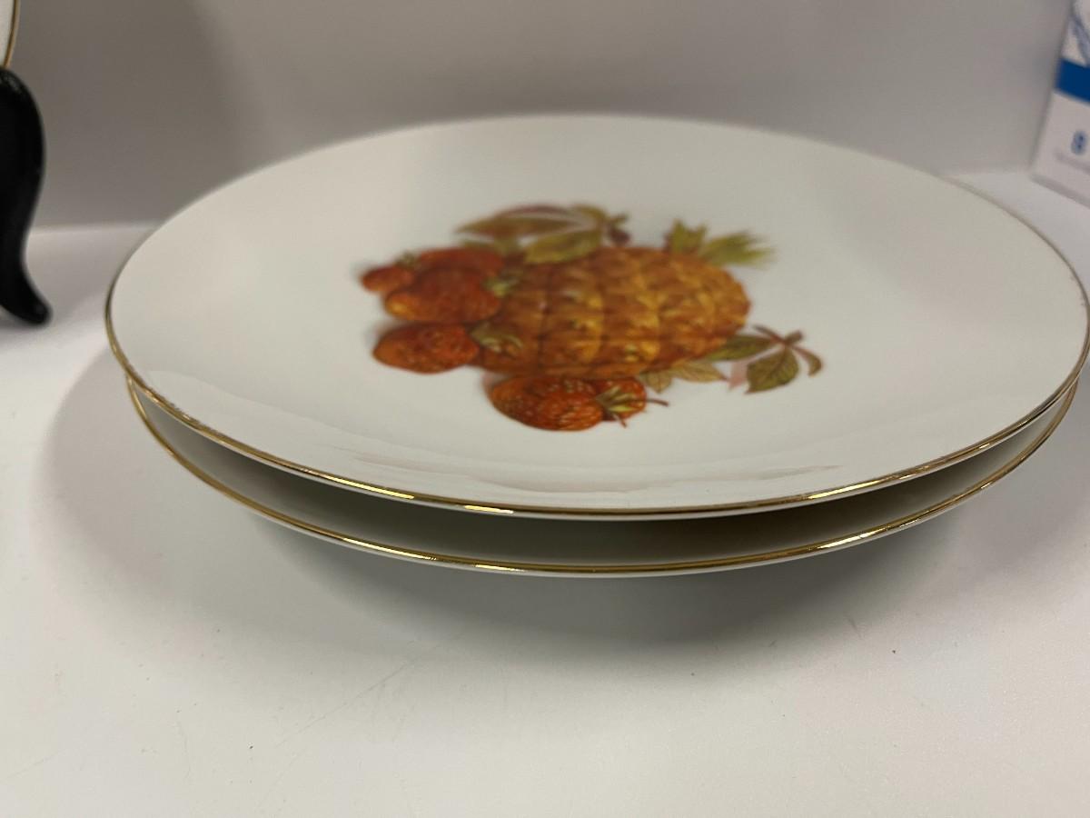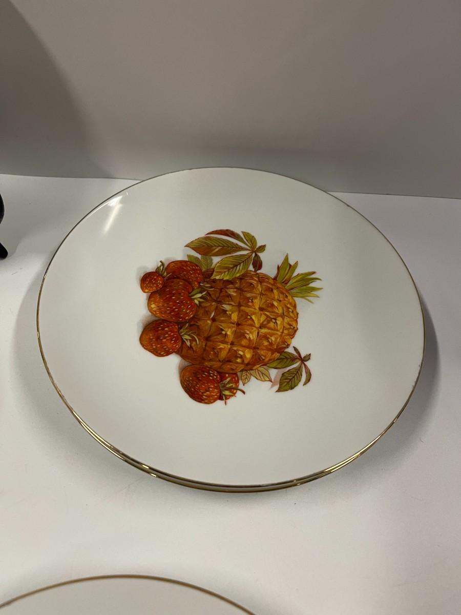 Vintage Bareuther Waldsassen Bavarian porcelain plates with fruit pattern. There are 6 plates in total. 2 each of one pattern and one each of two other patterns making it an incomplete set. some of the gold rims show some wear. 7 3/4".