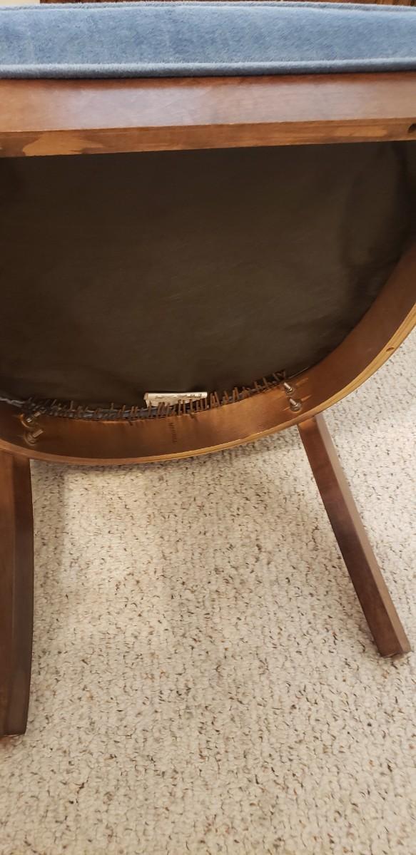 Vintage blue upholstered wood barrel chair.