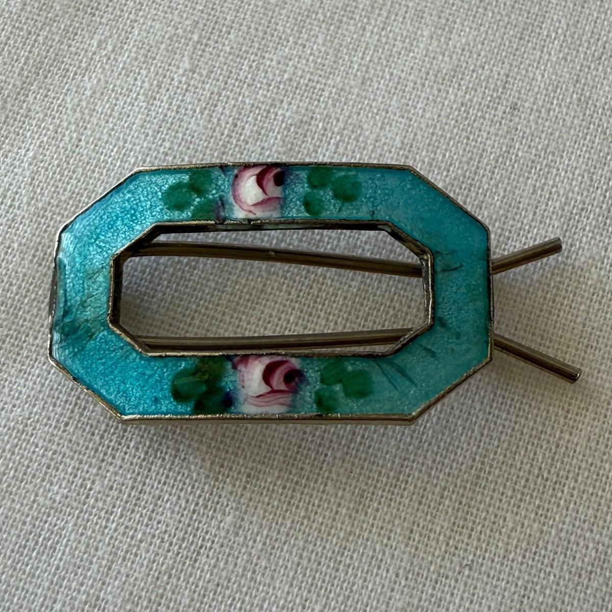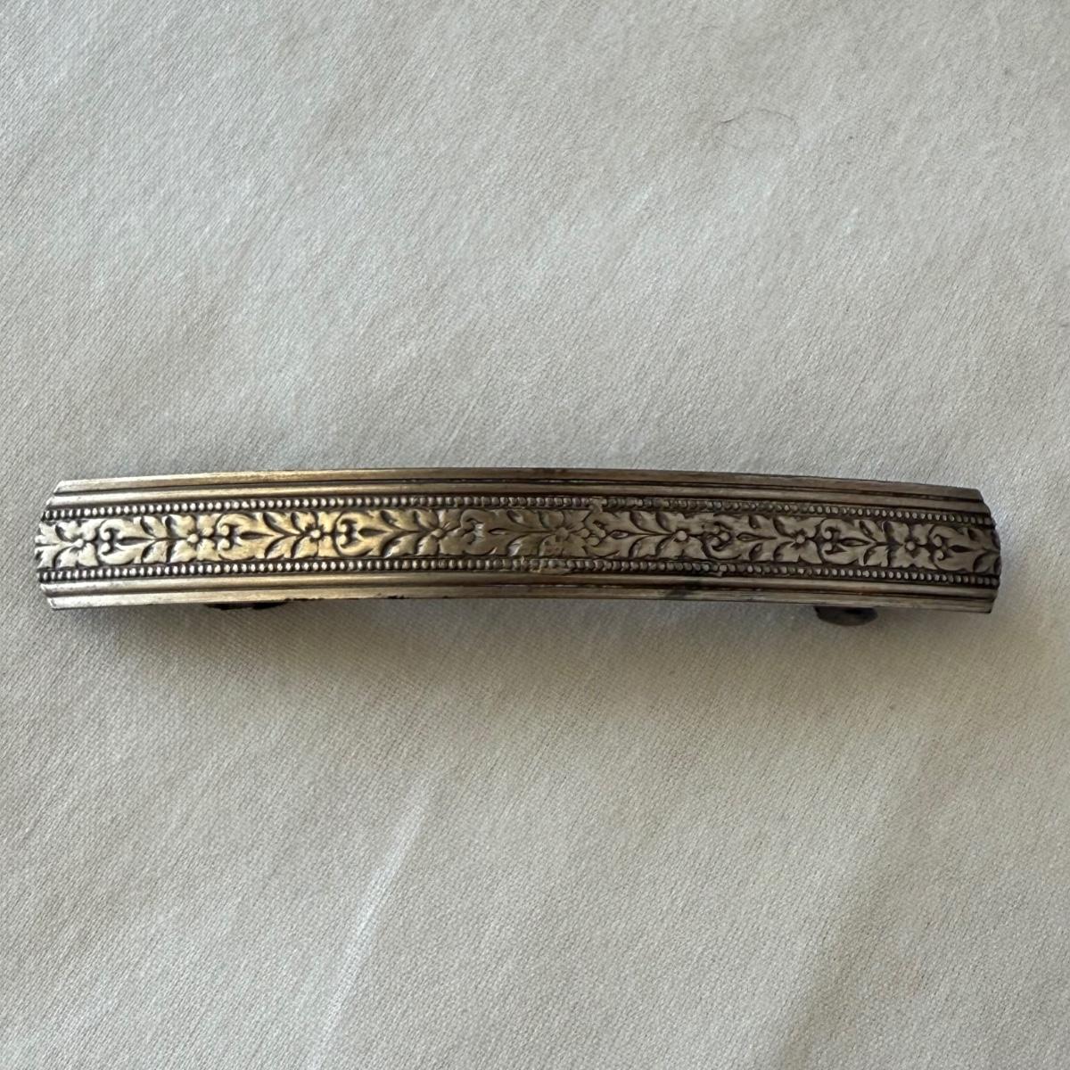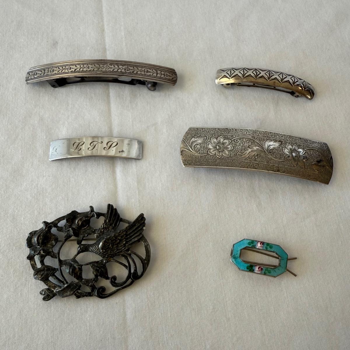 Five silver barrettes/hair clips plus one brooch. The monogrammed barrette is stamped Sterling. The colorful hair clip is enameled. The largest barrette is 3.25” x 1”.
