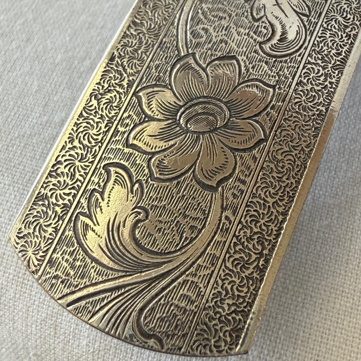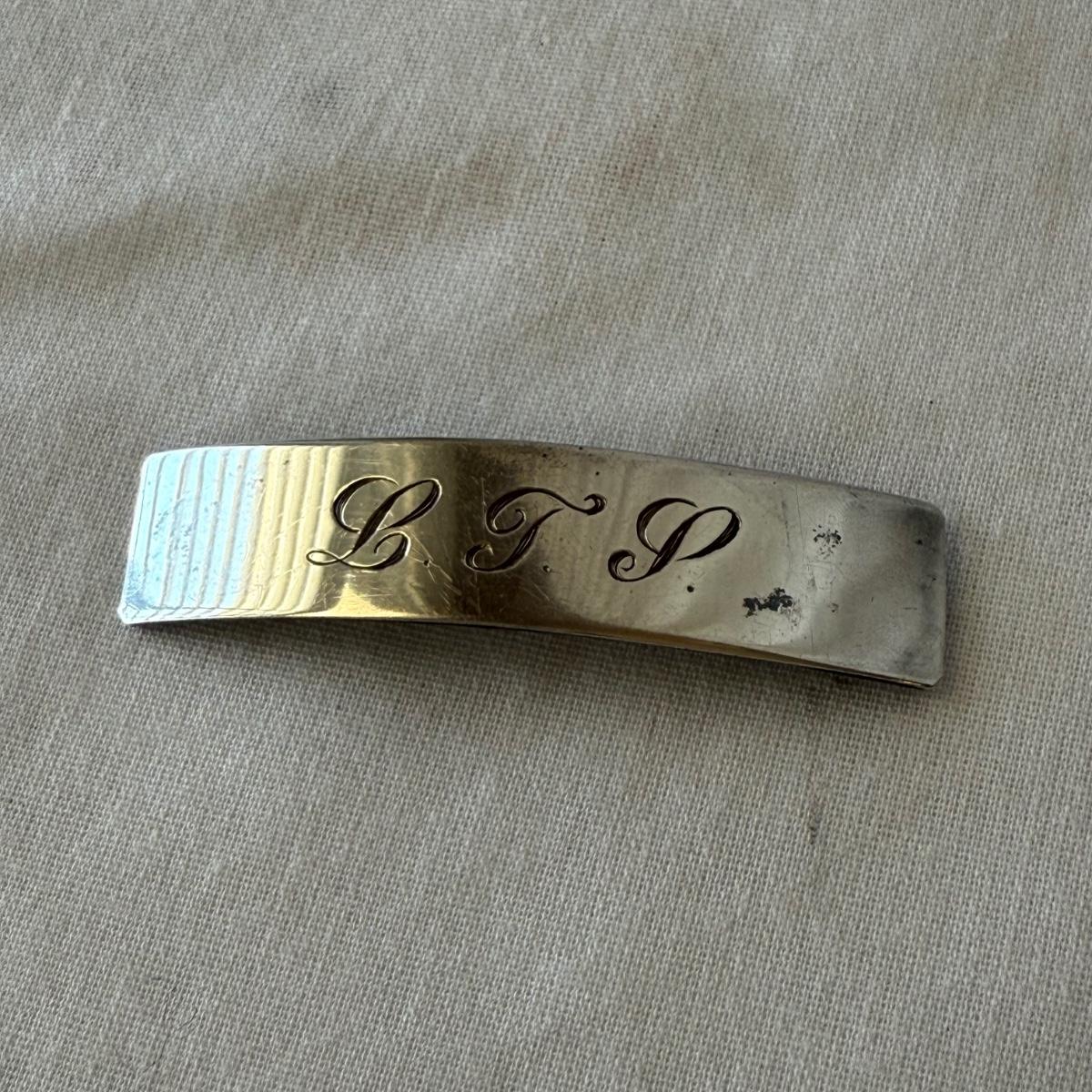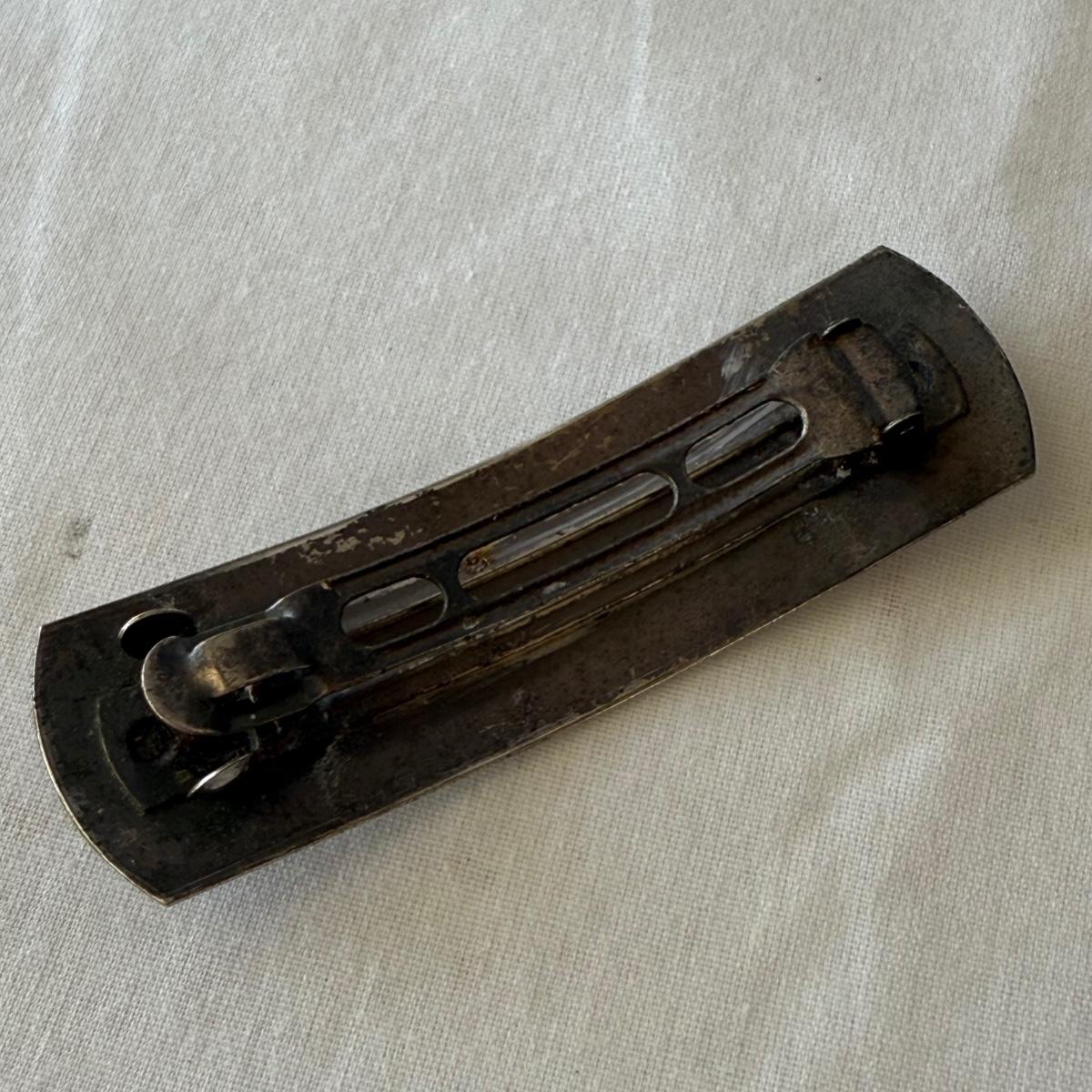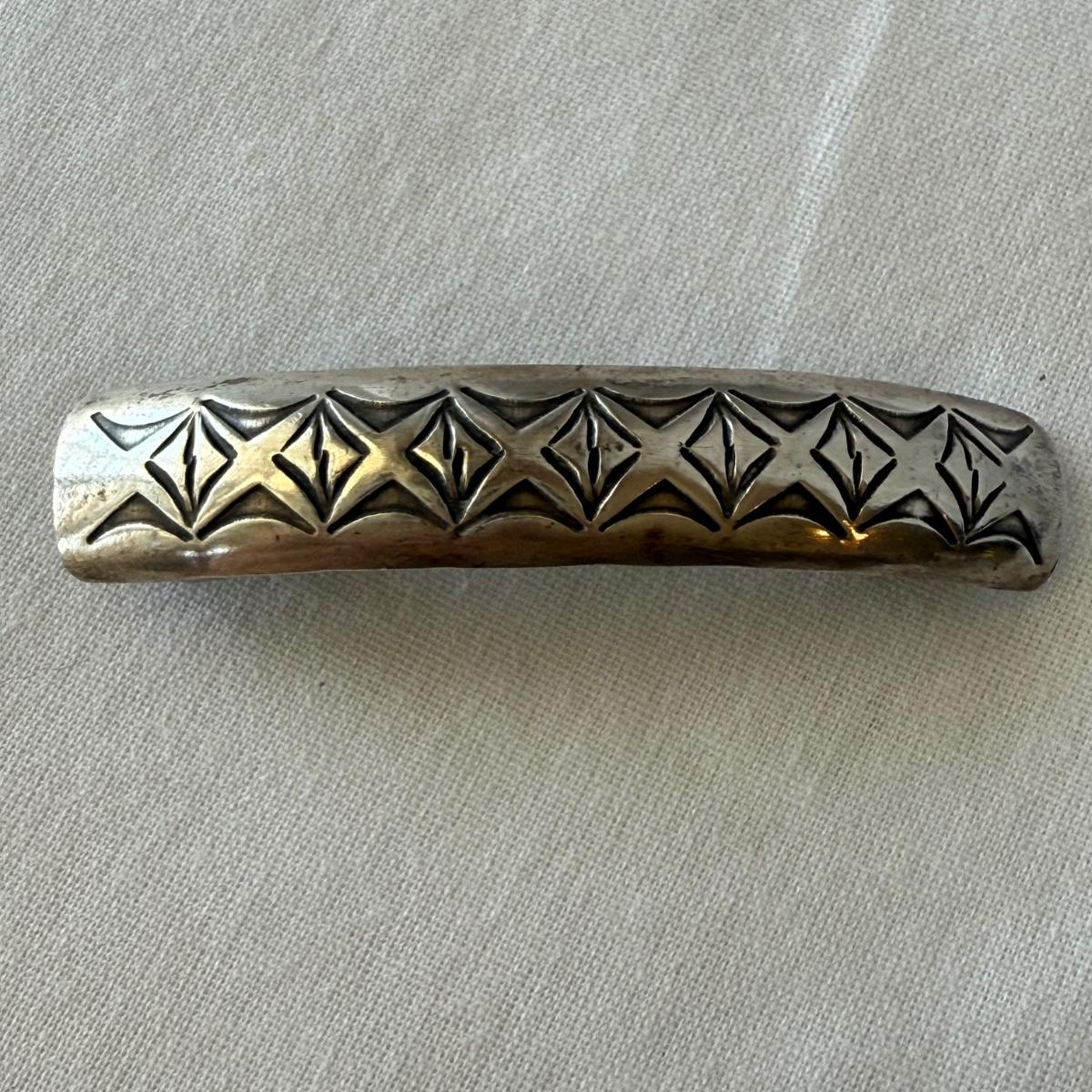 Five silver barrettes/hair clips plus one brooch. The monogrammed barrette is stamped Sterling. The colorful hair clip is enameled. The largest barrette is 3.25” x 1”.