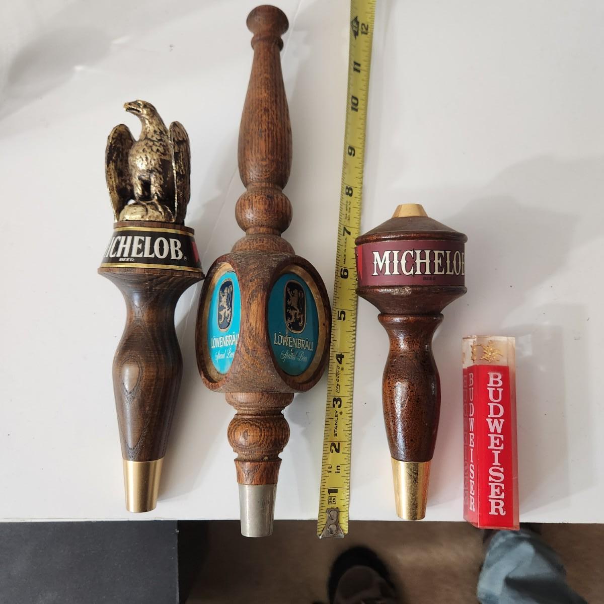 Vintage Barware I Bet You Can't Beer Mug + 4 Beer Taps Handles Shift Knobs Budweiser Michelob, Lowenbrau