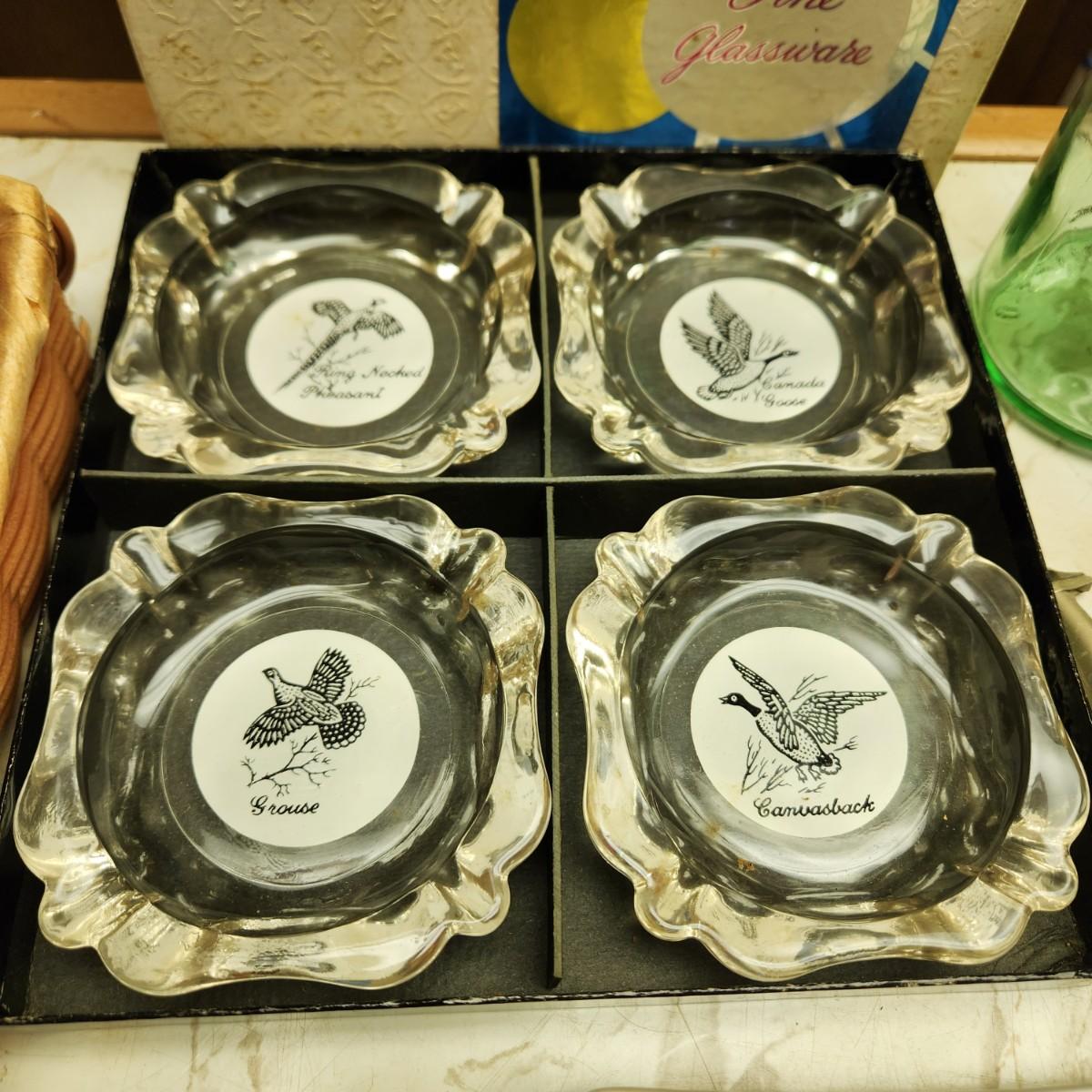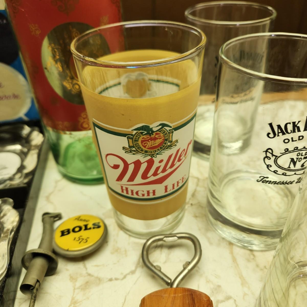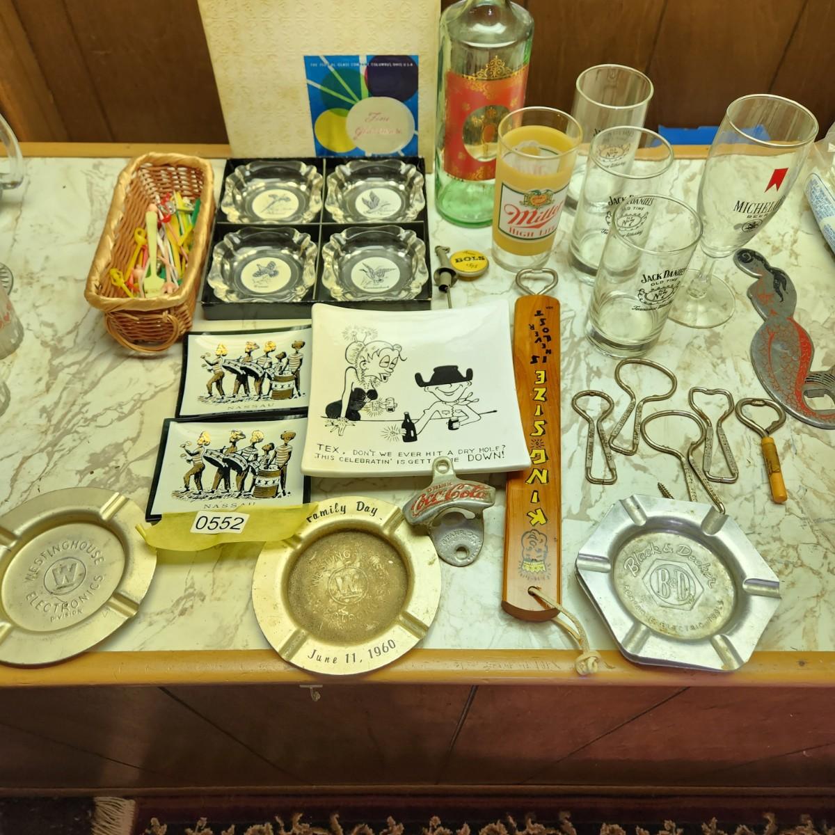 Westinghouse, Black n Decker, Federal Fowl Glass Ashtrays, Miller High Life Galss, Jack Daniel's No.7 , Drink Stirs.