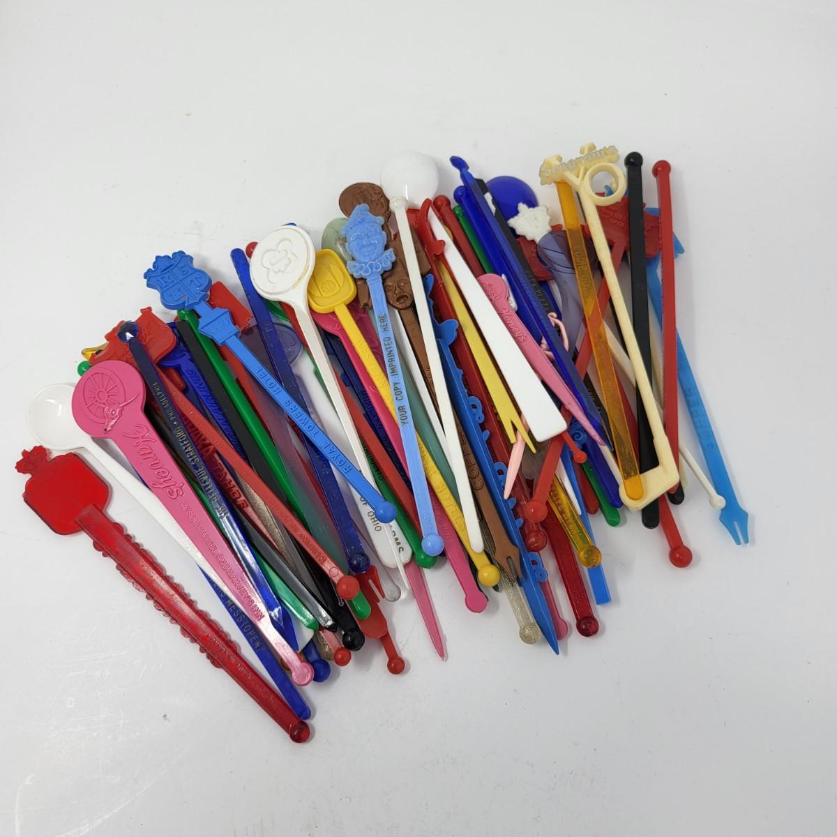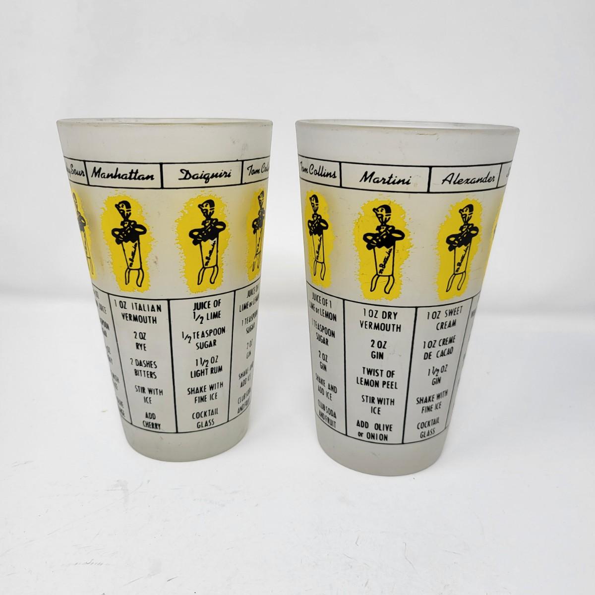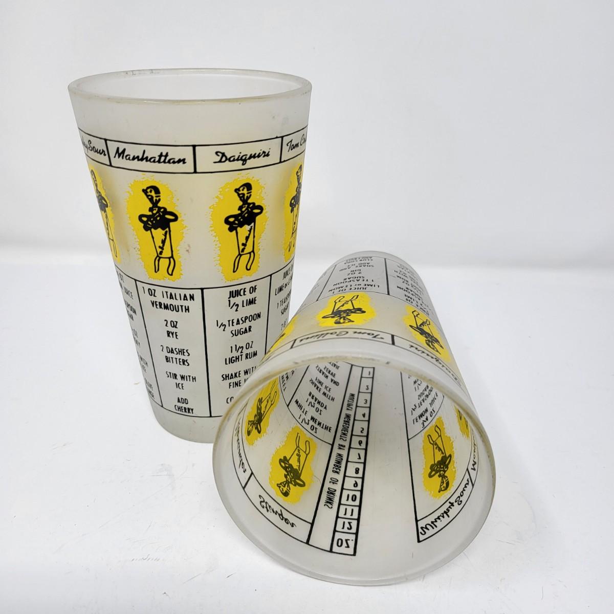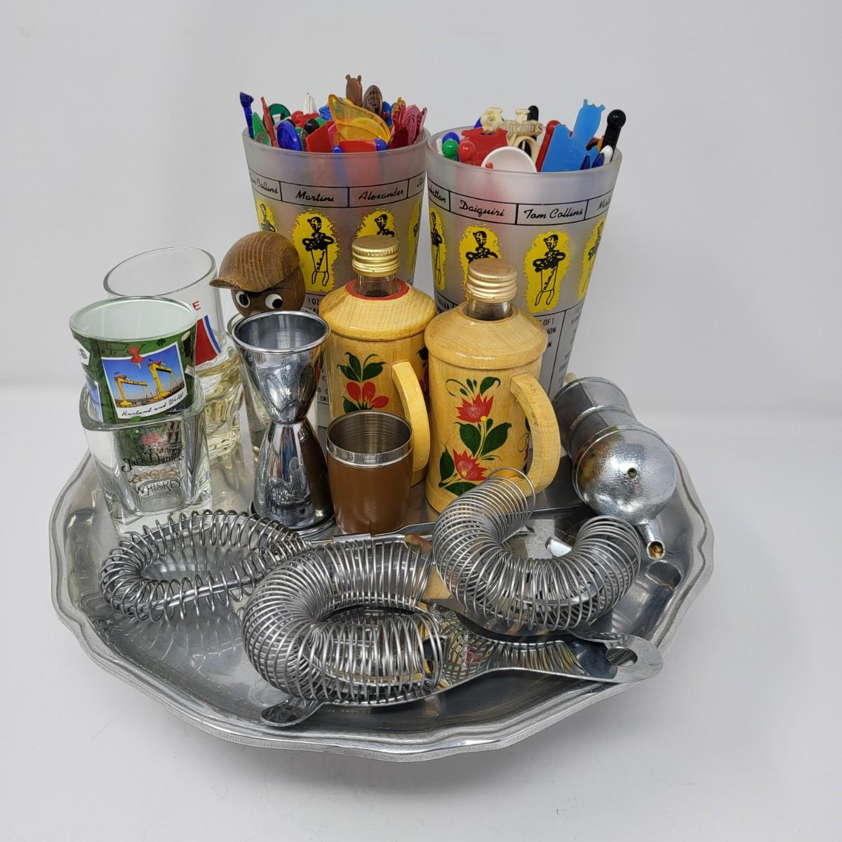 Wilton 12" footed aluminum platter. Various vintage advertisement plastic swivel sticks, cocktail strainers, shot glasses, two vintage Libby frosted glass cocktail recipe tumblers and more.