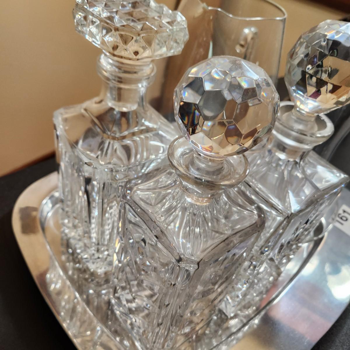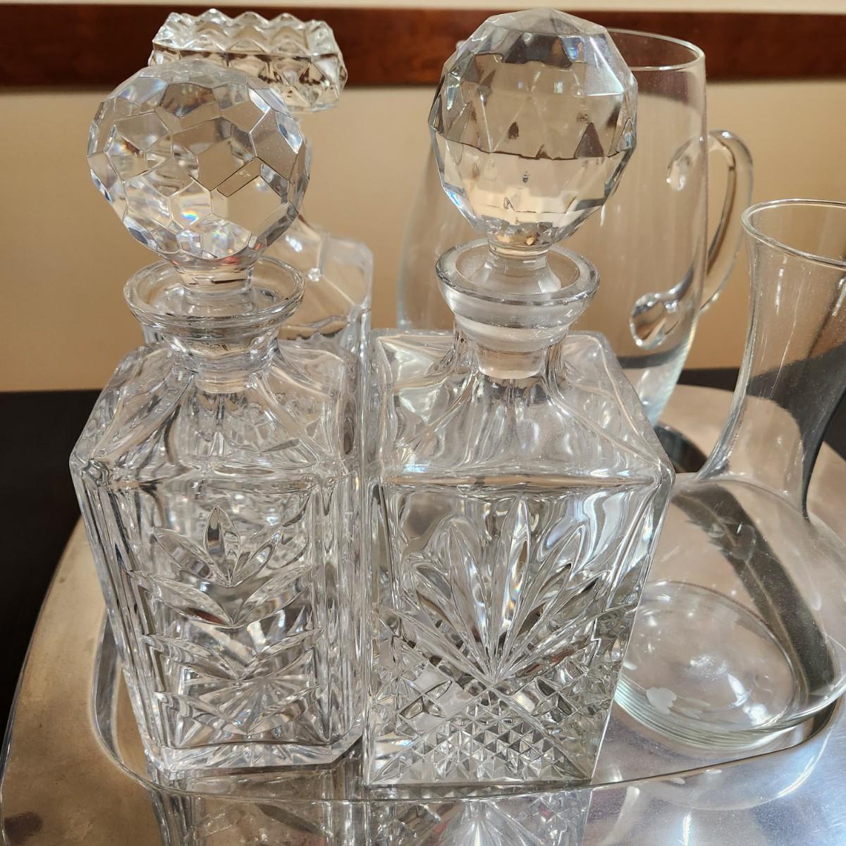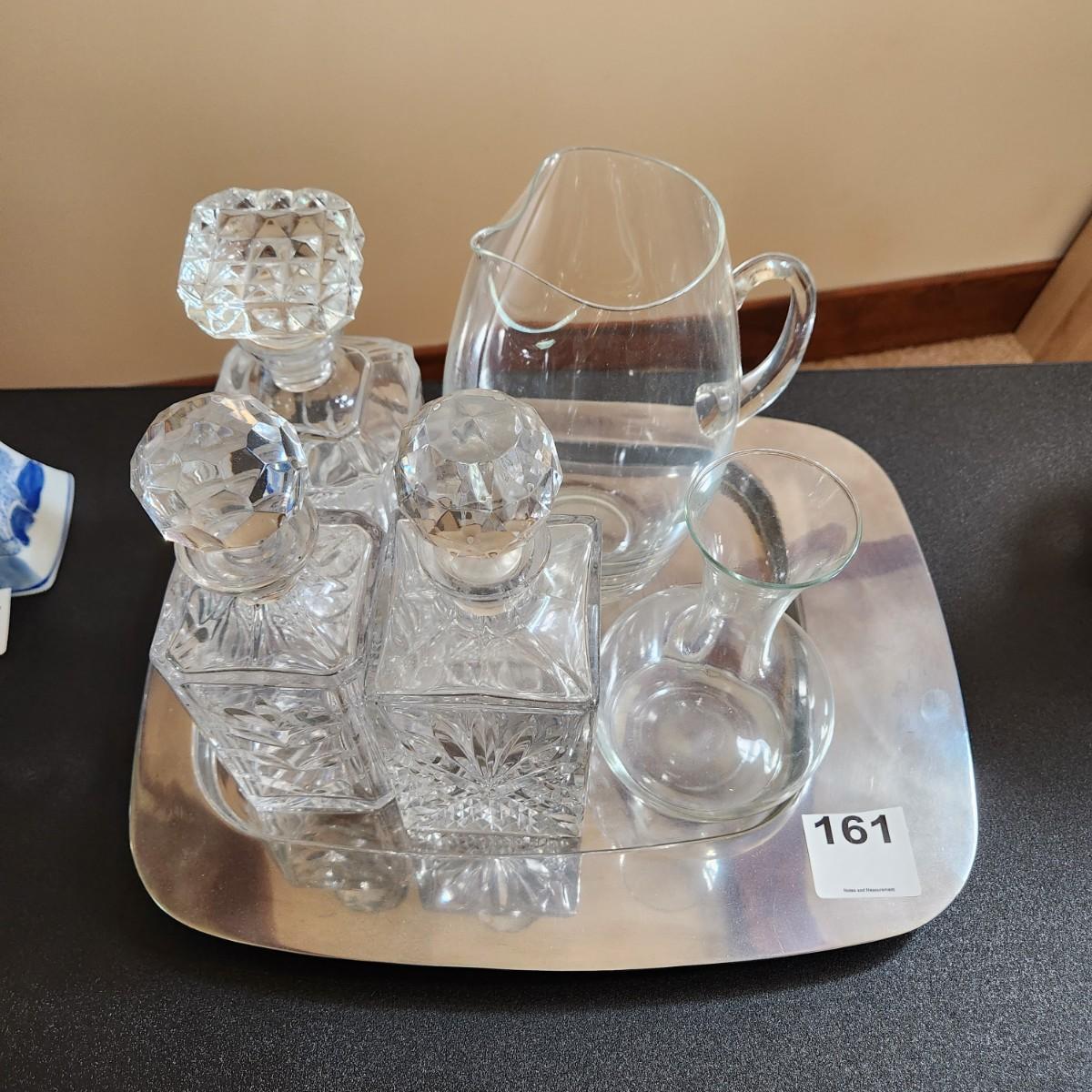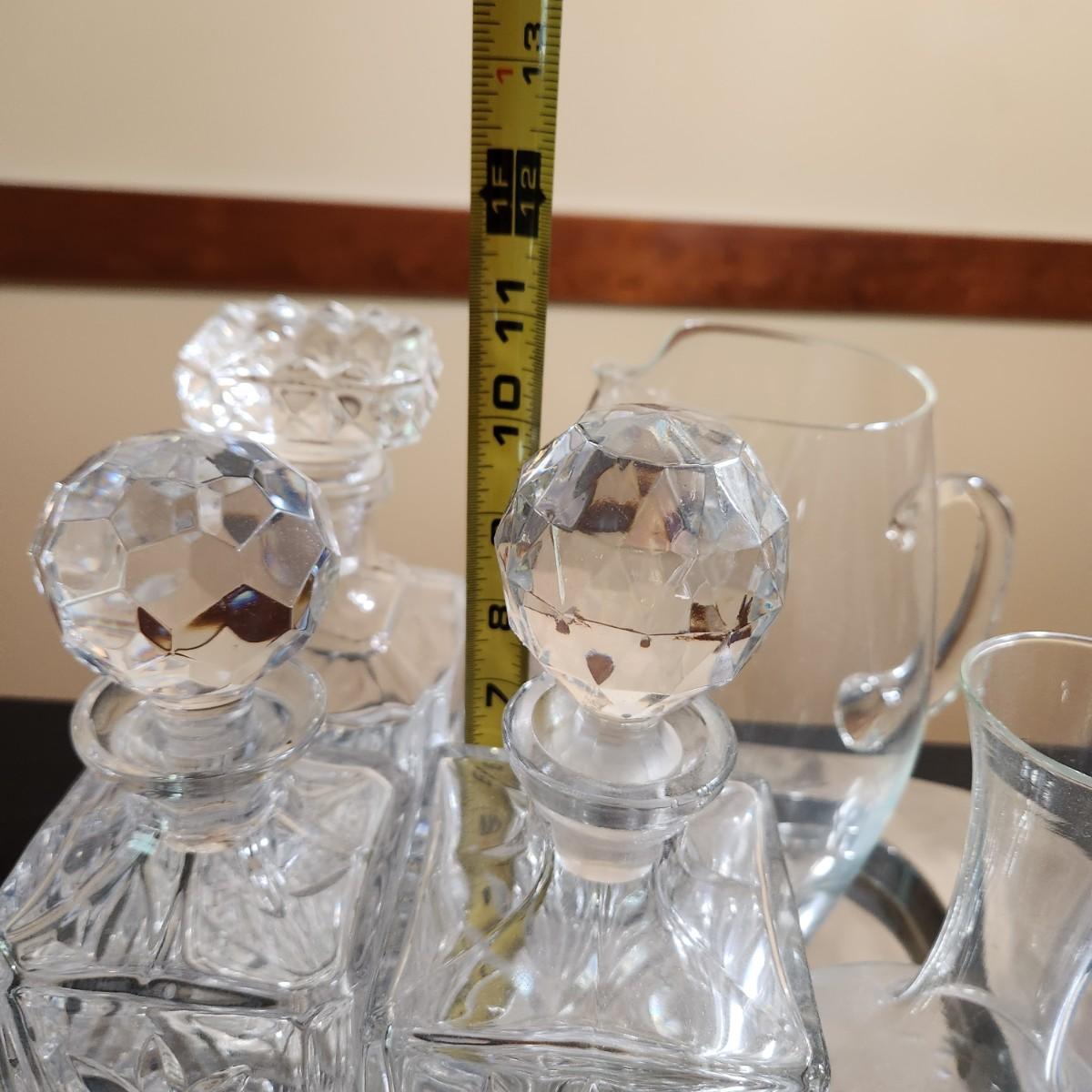 Vintage Barware Set of Decanters with Stoppers cut Design Glass Pitcher Chrome Tray