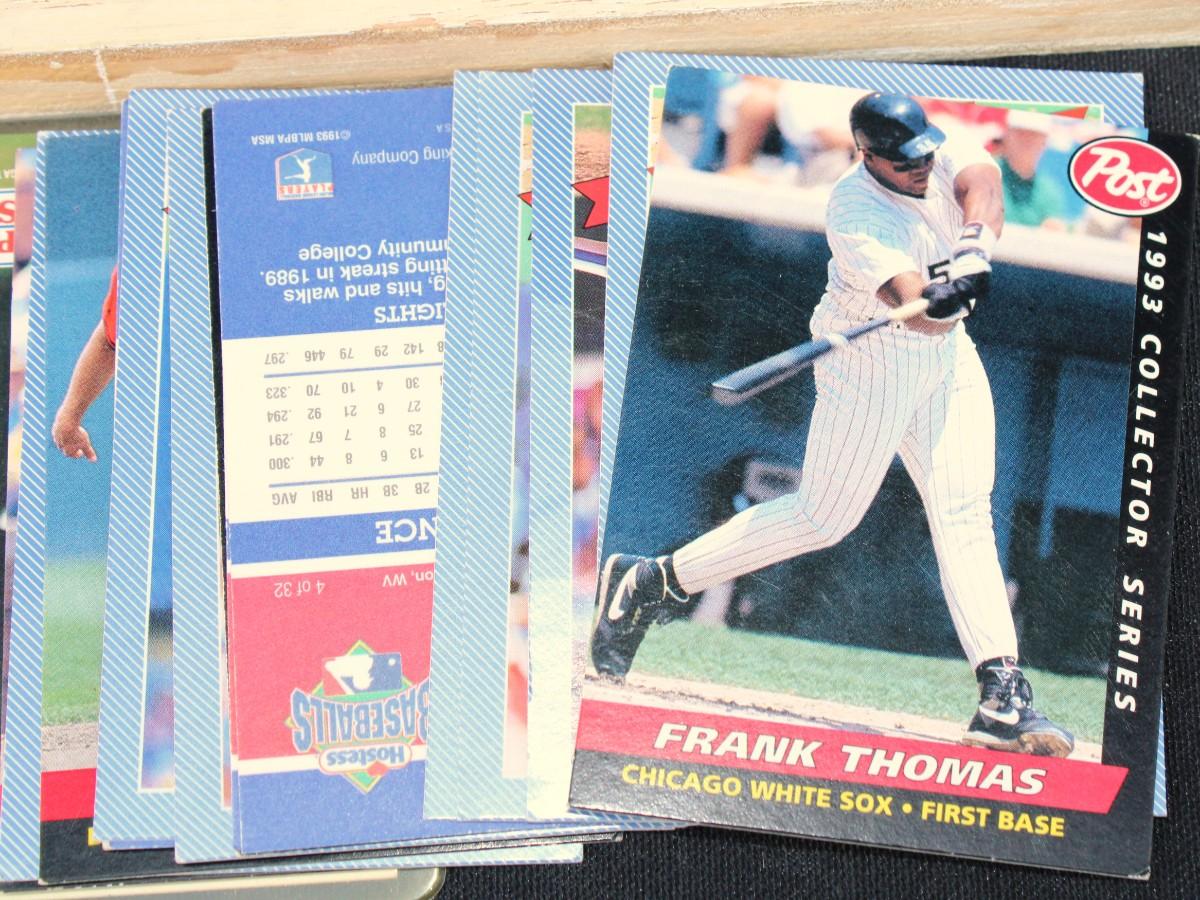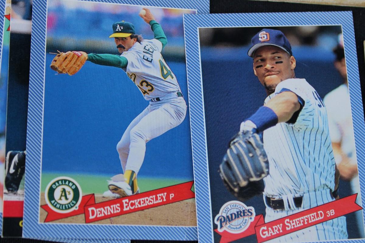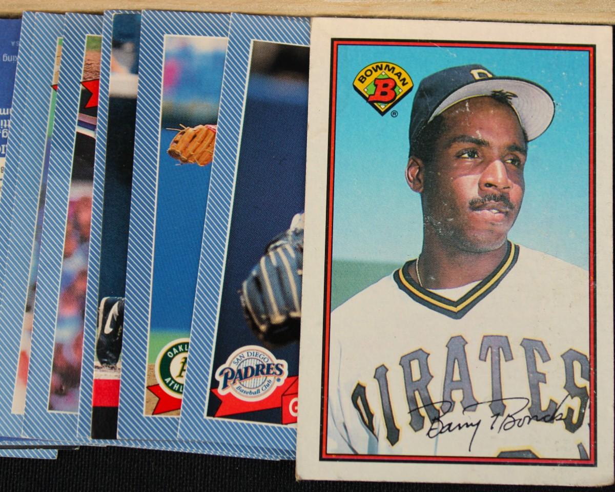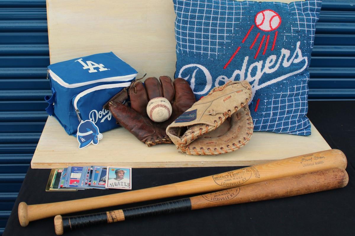 Vintage baseball bats, good condition, vintage baseball mitts, Dodgers throw pillow, Dodgers lunch box, Vintage baseball cards: Barry Bonds
