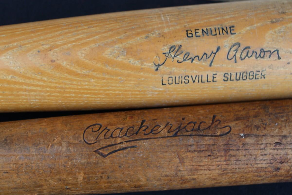 Vintage baseball bats, good condition, vintage baseball mitts, Dodgers throw pillow, Dodgers lunch box, Vintage baseball cards:  Barry Bonds