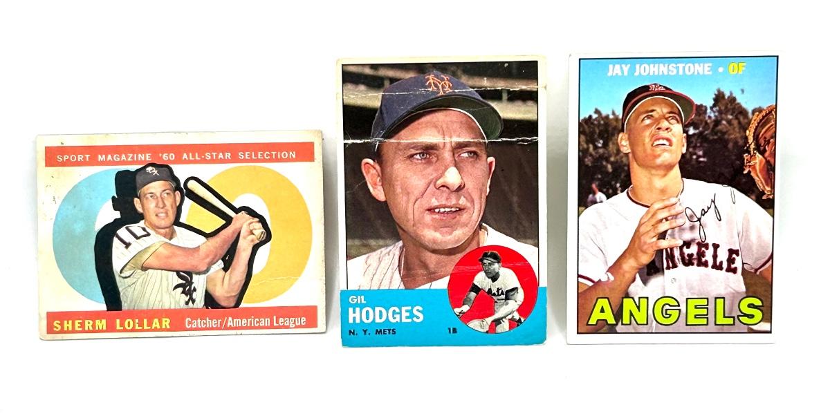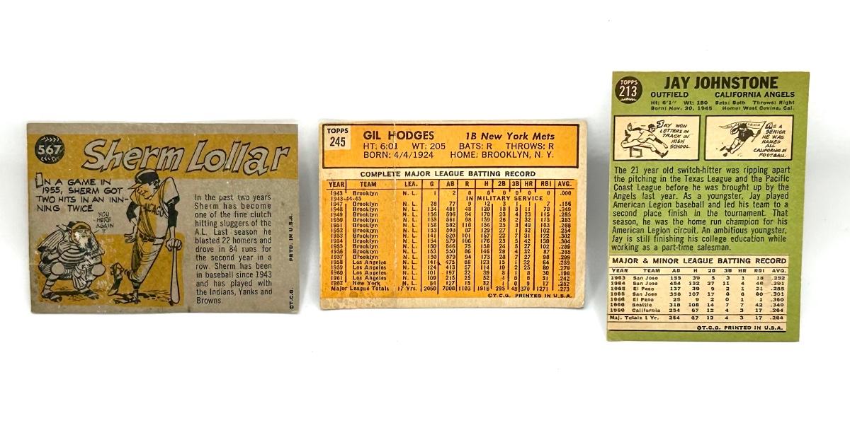 Lot includes 1967 Jay Johnstone (Los Angeles Angels OF), 1963 Sherm Loller (American League C) and a 1960 Gil Hodges (New York Mets 1B). The Hodges card has a fold as seen in the pics.