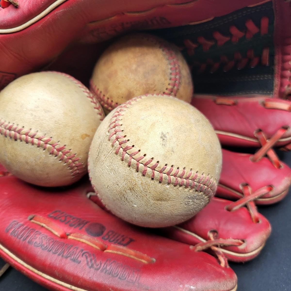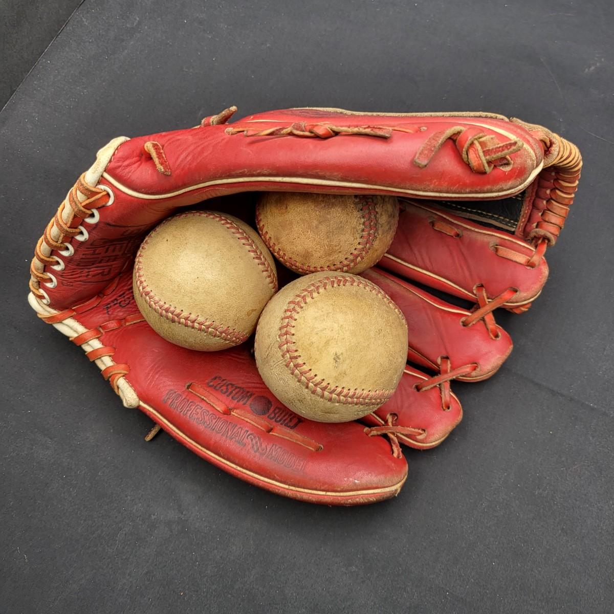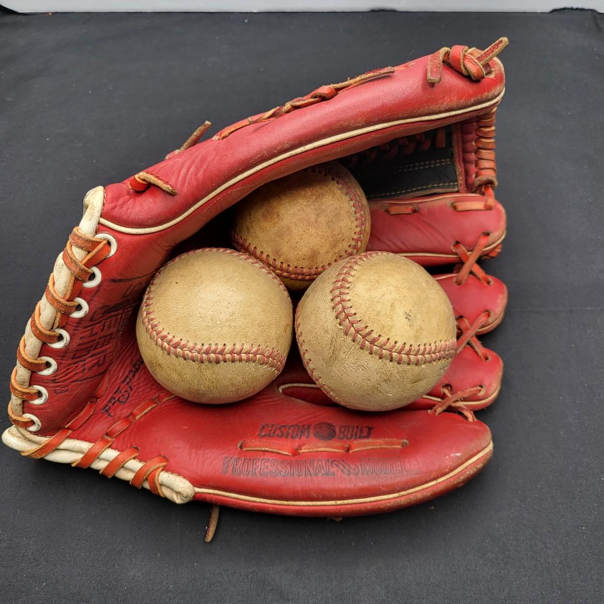 Custom Built Professional Model, red baseball mit and 3 vintage baseballs.