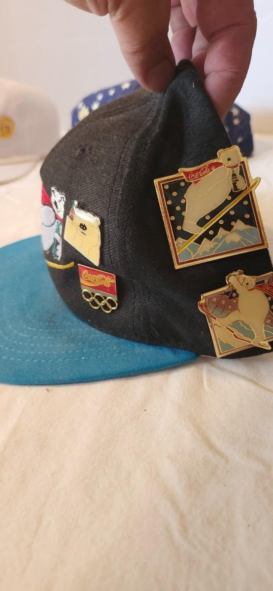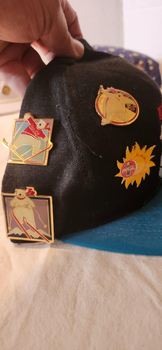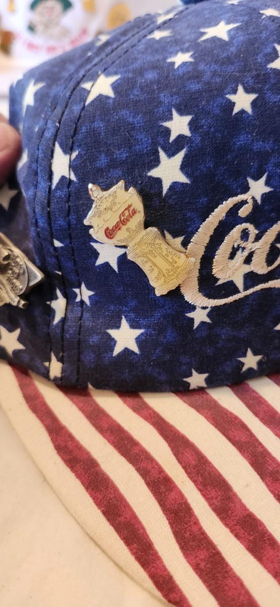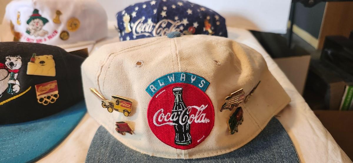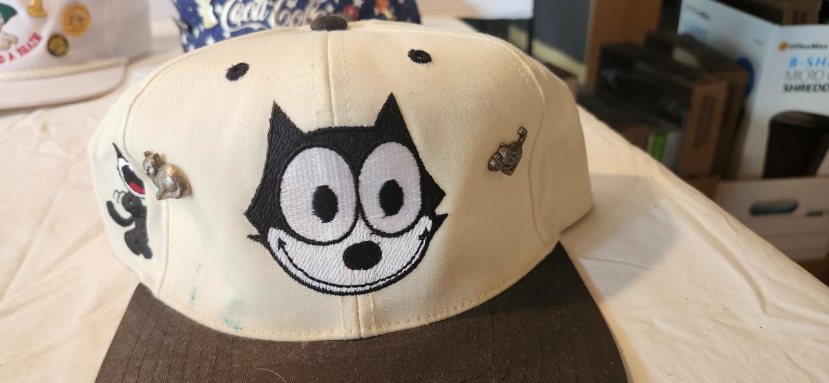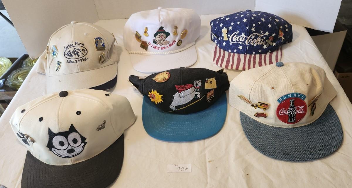 Vintage Baseballs Caps and Vintage Enamel Pins, including Coca-Cola and Felix the cat