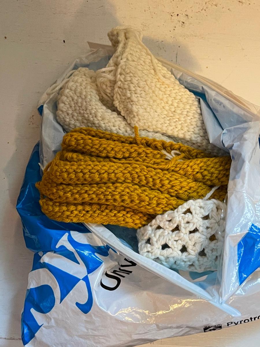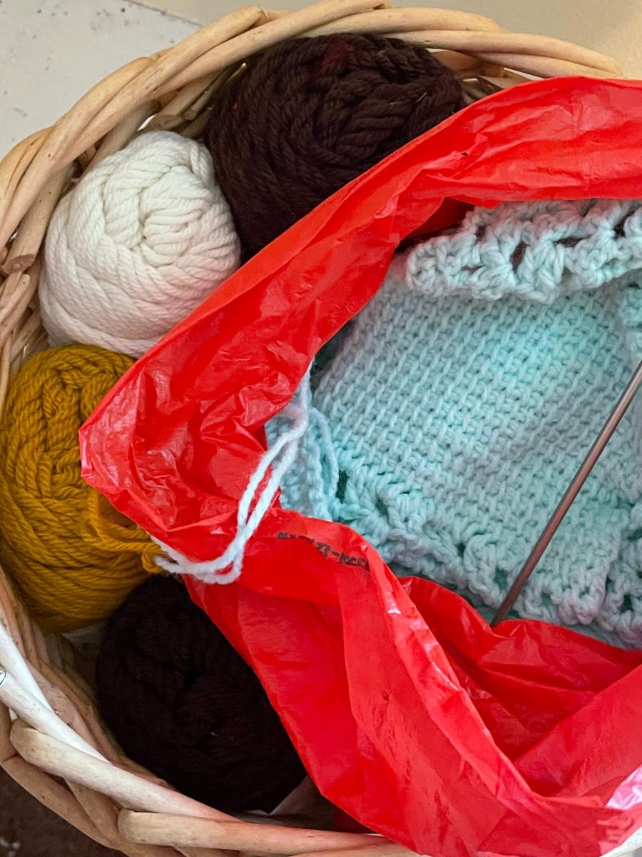 Vintage Basket of Crochet Yarn with Needle and Wood Loom