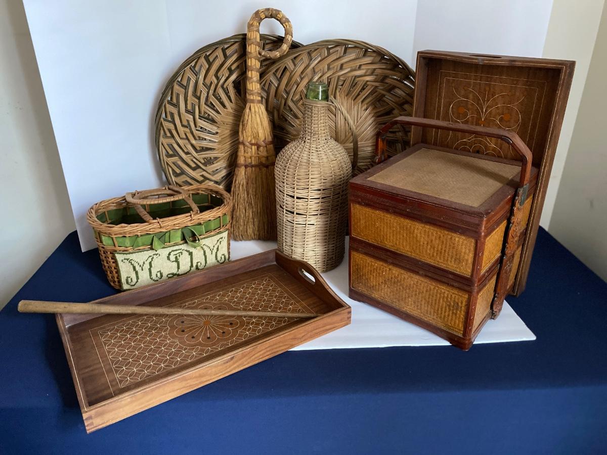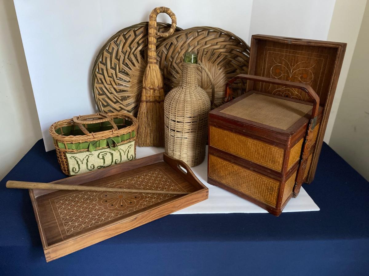 Vintage Basket, Tray, and Demijohn Lot As Pictured