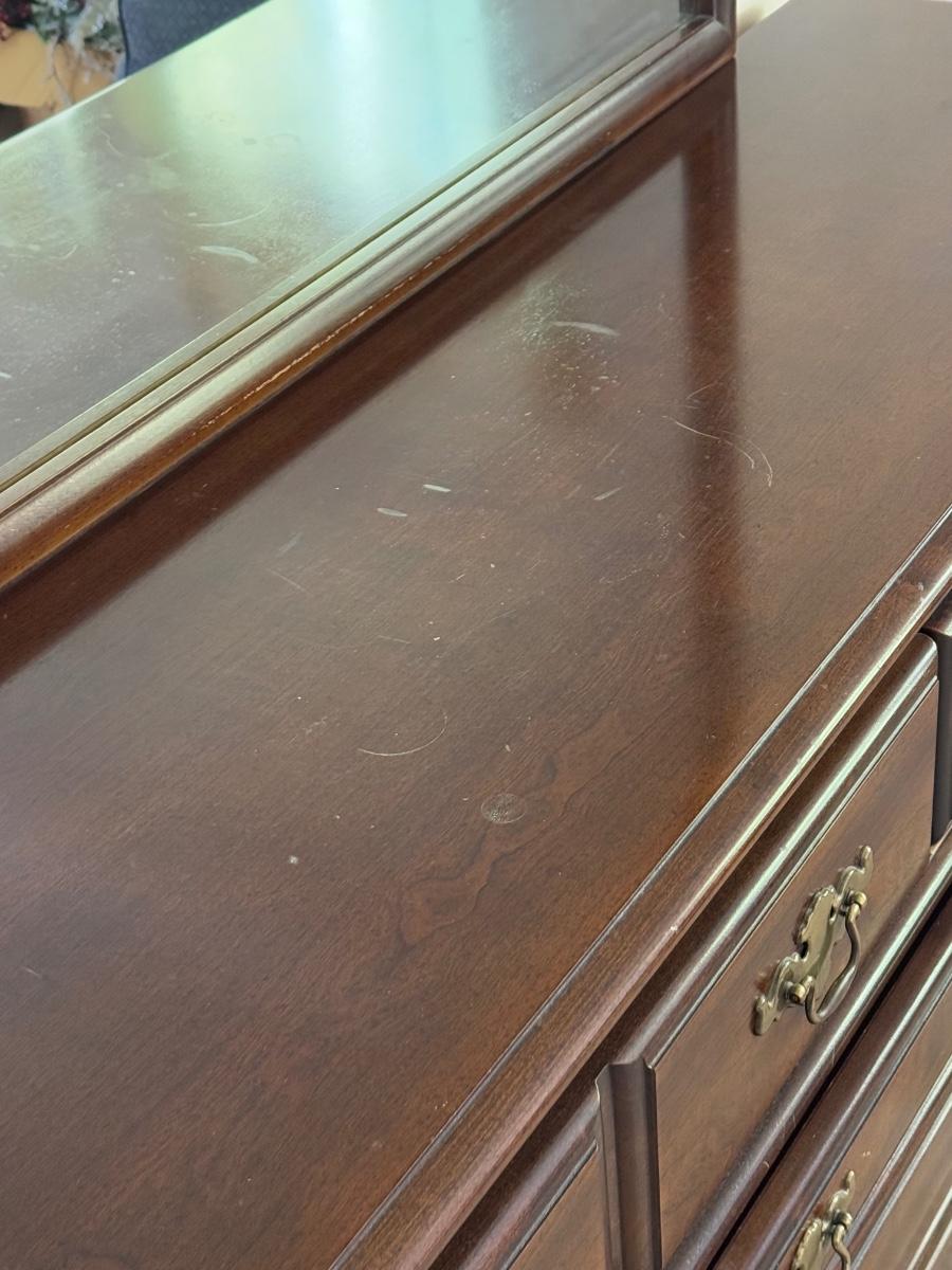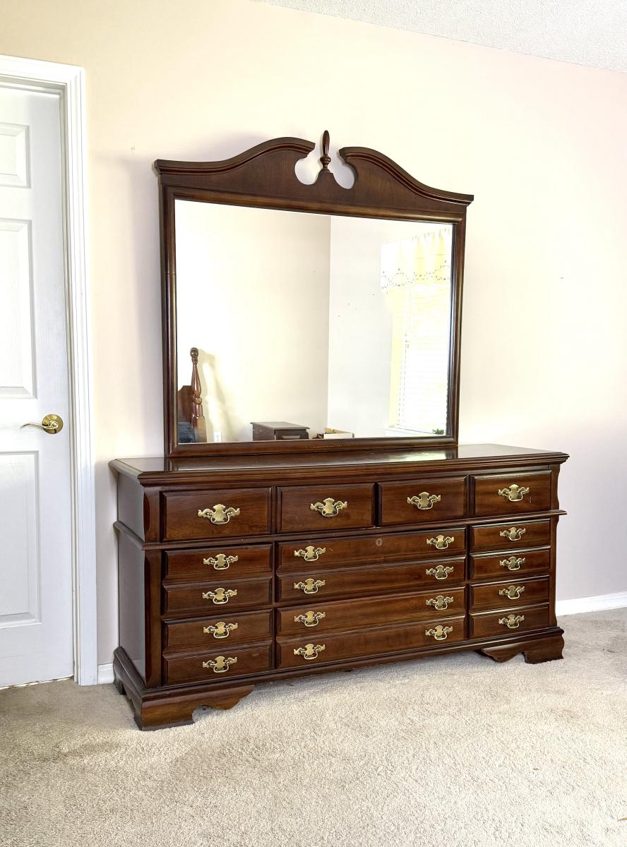 31” tall to tabletop x 64” wide x 18” deep. Mirror is 48-3/4” tall x 46-3/4” wide.