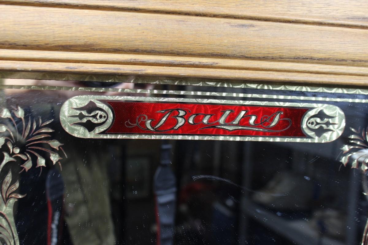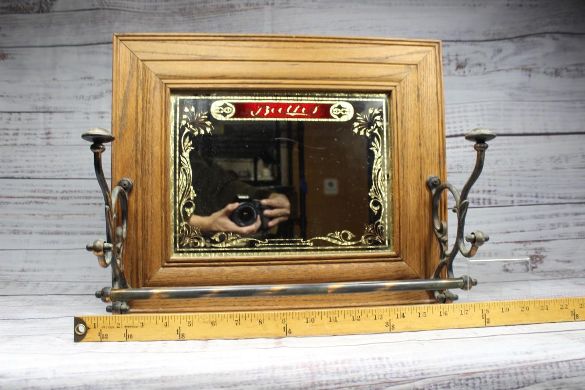 Vintage Baths Mountable Wall Mirror Hat Rack, there are no significant cracks or chips to the piece and is in good vintage condition. Check pictures for more details and for sizing.