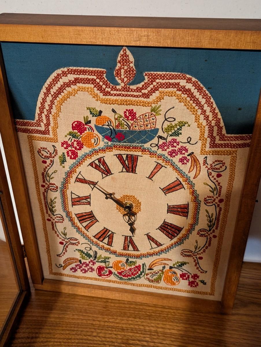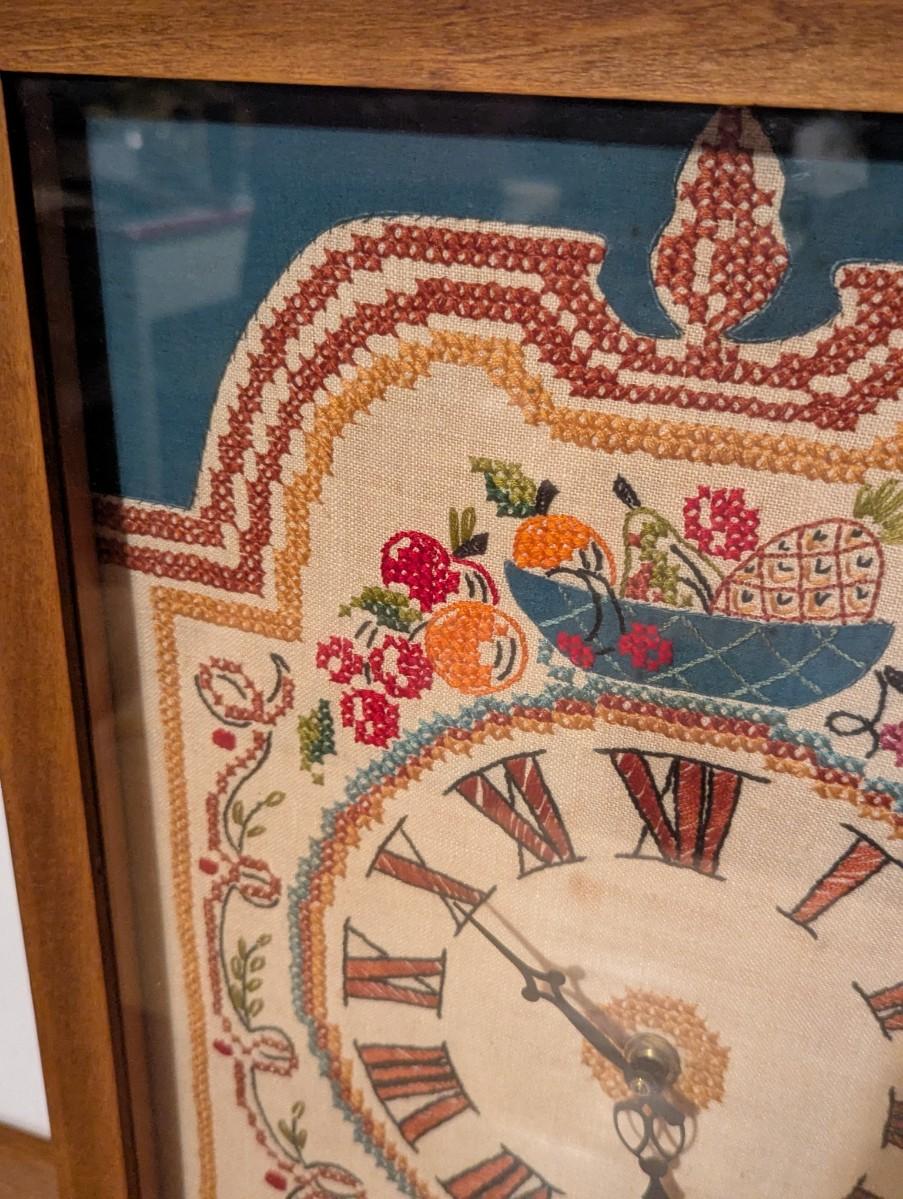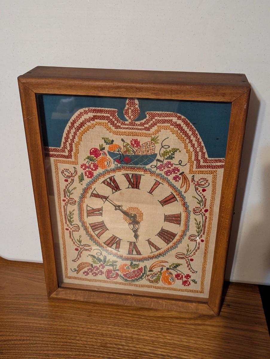 Vintage Battery Operated Mantle Clock Cross Stitch Face Shadow Box Fruit Sampler