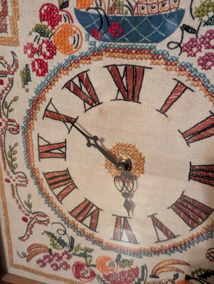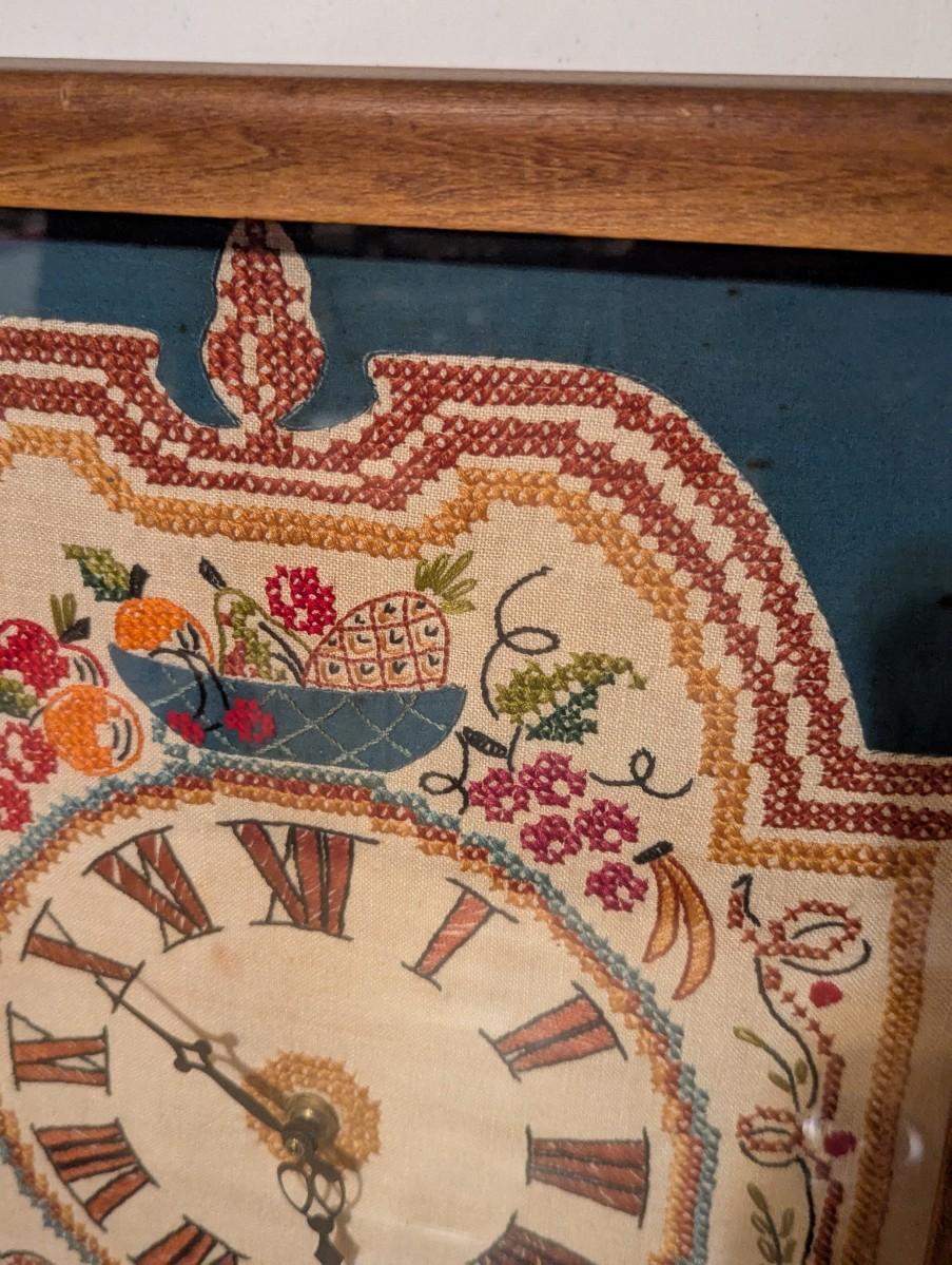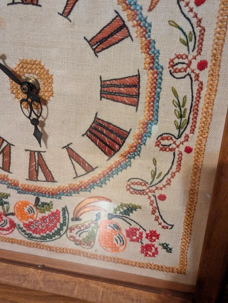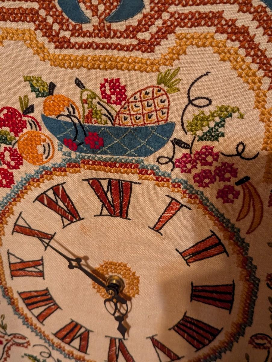 Vintage Battery Operated Mantle Clock Cross Stitch Face Shadow Box Fruit Sampler