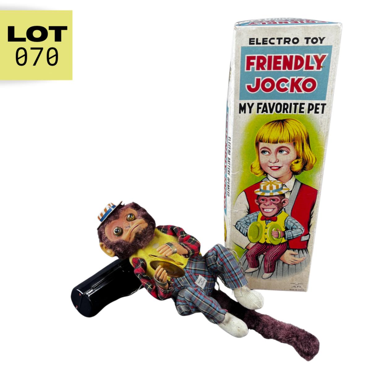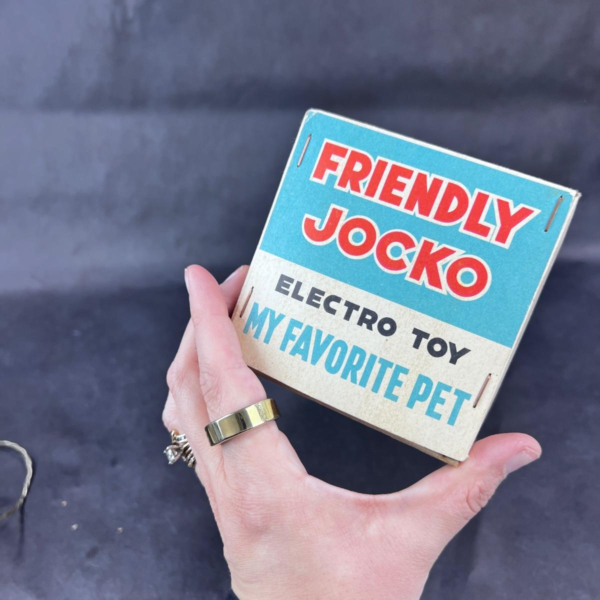 This Friendly Jocko is a monkey that loves to perform. This monkey was tested and does not work. However his box is immaculate and probably just needs a simple fix. Please see photos for details and condition. **|** ::: Shipping is available on this lot. If you require shipping you must let us know at the close of the auction. We will coordinate with you after the item has been won. Shipping fees will include insurance up to or exceeding the value of all items being mailed. If you have any questions regarding this lot please contact the auctioneer either via this website, by direct email or by phone. PICK UP TIMES and other important information can be found in the TERMS and DESCRIPTION of the auction. Please take a look for pertinent information. Thanks!