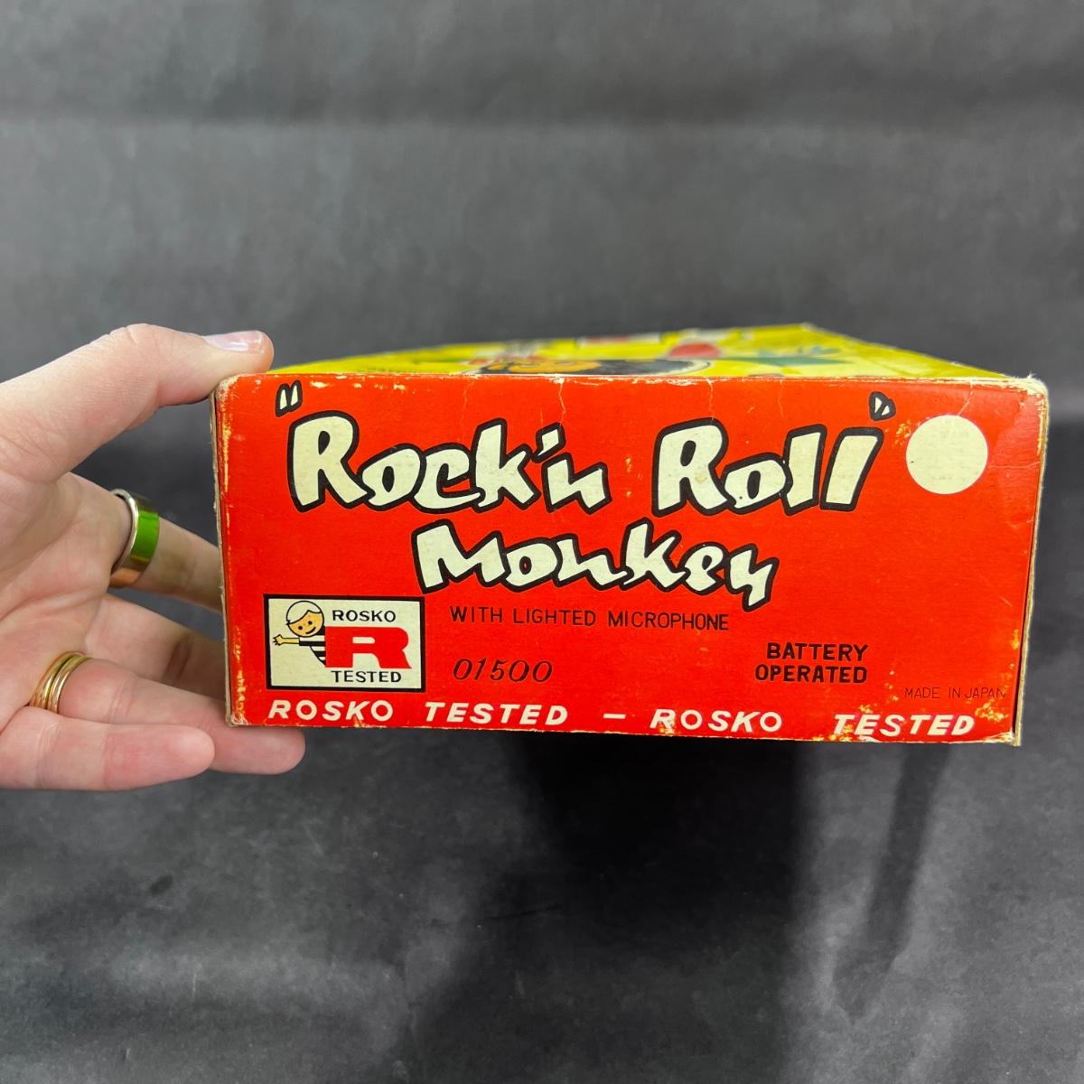 A great lookin' Rock 'n Roll Monkey from Rosko Toys. This great guy still works and looks great! Has original box too! **Works, Video of Function on YouTube Video, Clean - Uses Standard Batteries** Please see photos for details and condition. **|** ::: Shipping is available on this lot. If you require shipping you must let us know at the close of the auction. We will coordinate with you after the item has been won. Shipping fees will include insurance up to or exceeding the value of all items being mailed. If you have any questions regarding this lot please contact the auctioneer either via this website, by direct email or by phone. PICK UP TIMES and other important information can be found in the TERMS and DESCRIPTION of the auction. Please take a look for pertinent information. Thanks!