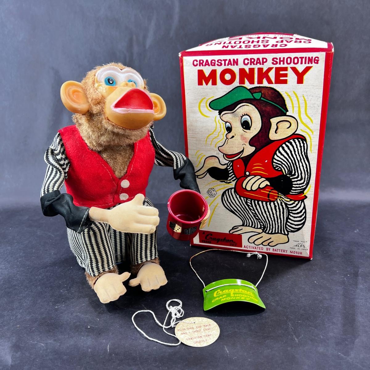 Crafted by ALPS for Cragstan. Here is the Crap Shooting Monkey. Only the box TOP is included - the bottom went missing I suppose. This monkey works well. The elastic on his visor needs to be replaced. And he only comes with one dice. **Works, Video of Function on YouTube Video, Clean - Uses Standard Batteries** You'll need this guy for the next casino night at work! **|** Please see photos for details and condition. ::: Shipping is available on this lot. If you require shipping you must let us know at the close of the auction. We will coordinate with you after the item has been won. Shipping fees will include insurance up to or exceeding the value of all items being mailed. If you have any questions regarding this lot please contact the auctioneer either via this website, by direct email or by phone. PICK UP TIMES and other important information can be found in the TERMS and DESCRIPTION of the auction. Please take a look for pertinent information. Thanks!