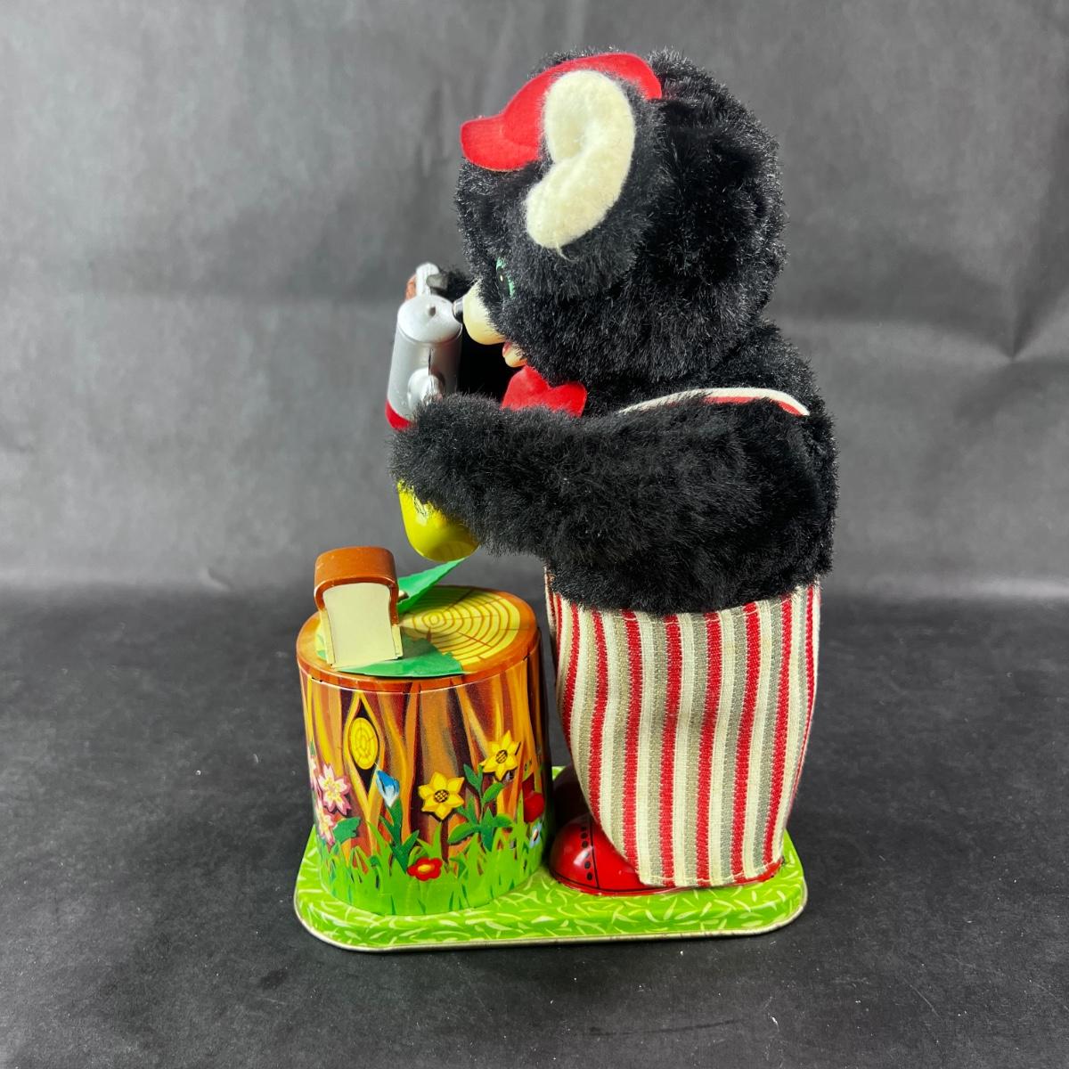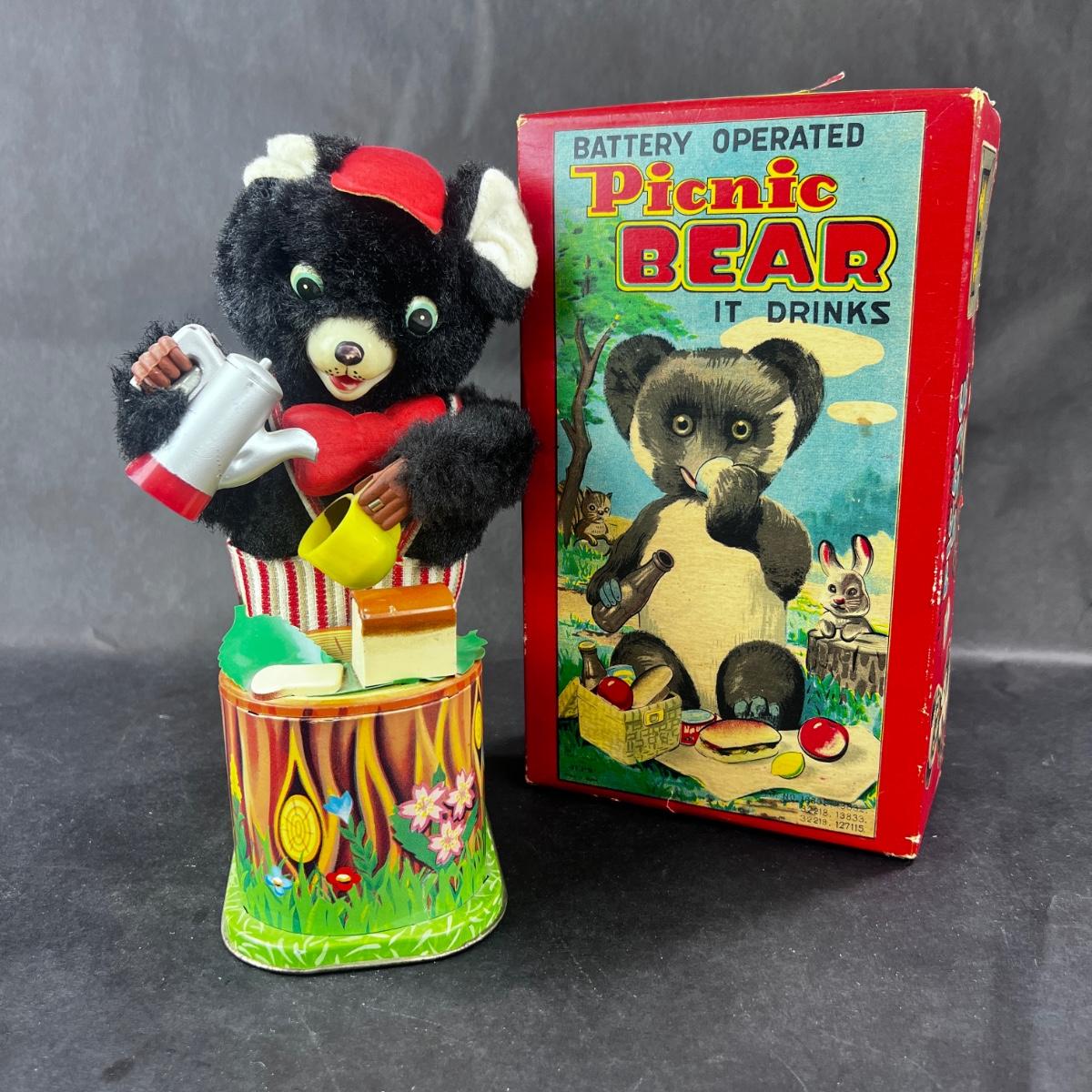 This Battery Operated Picnic Bear is supposed to drink. He is non-functional. This toy comes with the original box. Please see photos for details and condition. **|** ::: Shipping is available on this lot. If you require shipping you must let us know at the close of the auction. We will coordinate with you after the item has been won. Shipping fees will include insurance up to or exceeding the value of all items being mailed. If you have any questions regarding this lot please contact the auctioneer either via this website, by direct email or by phone. PICK UP TIMES and other important information can be found in the TERMS and DESCRIPTION of the auction. Please take a look for pertinent information. Thanks!