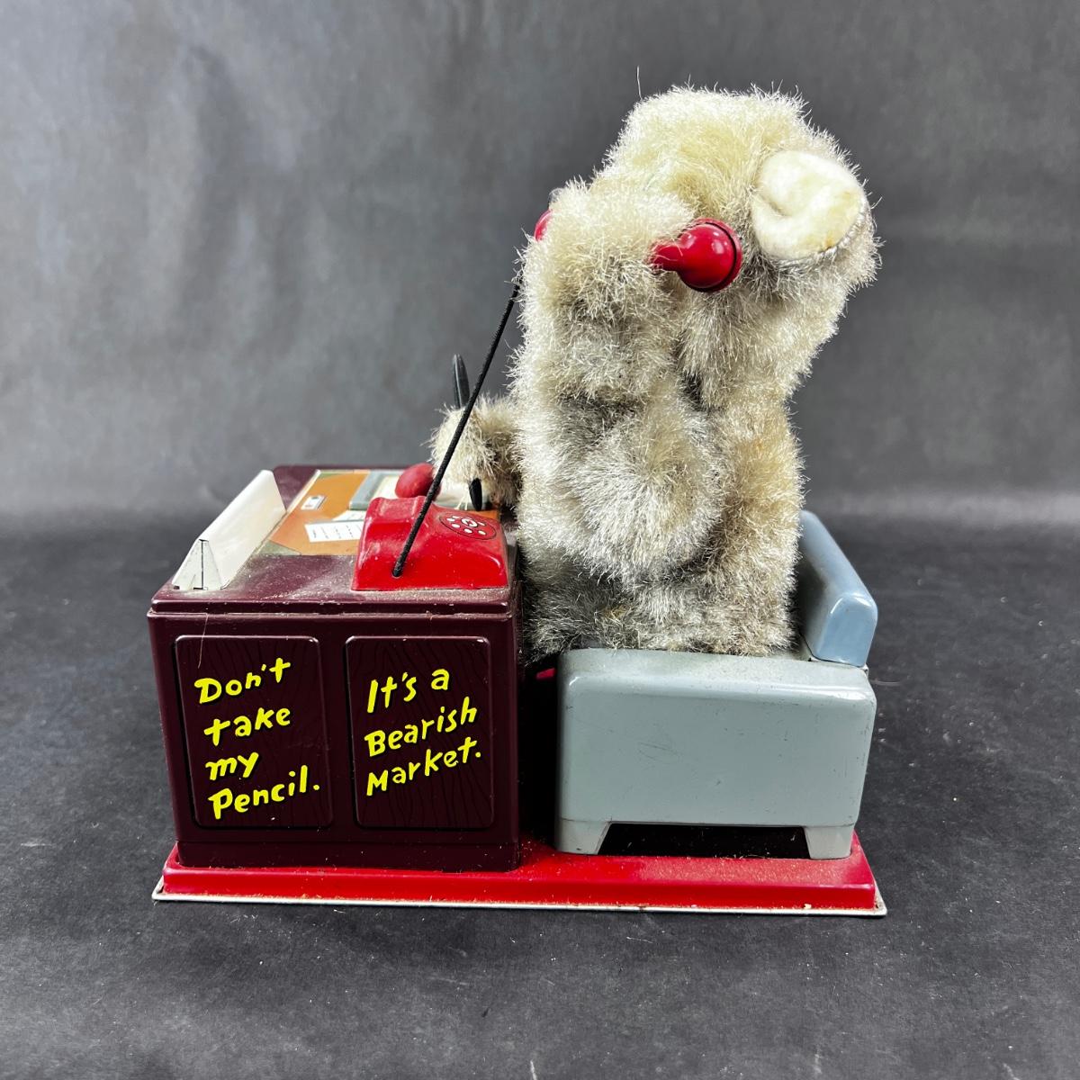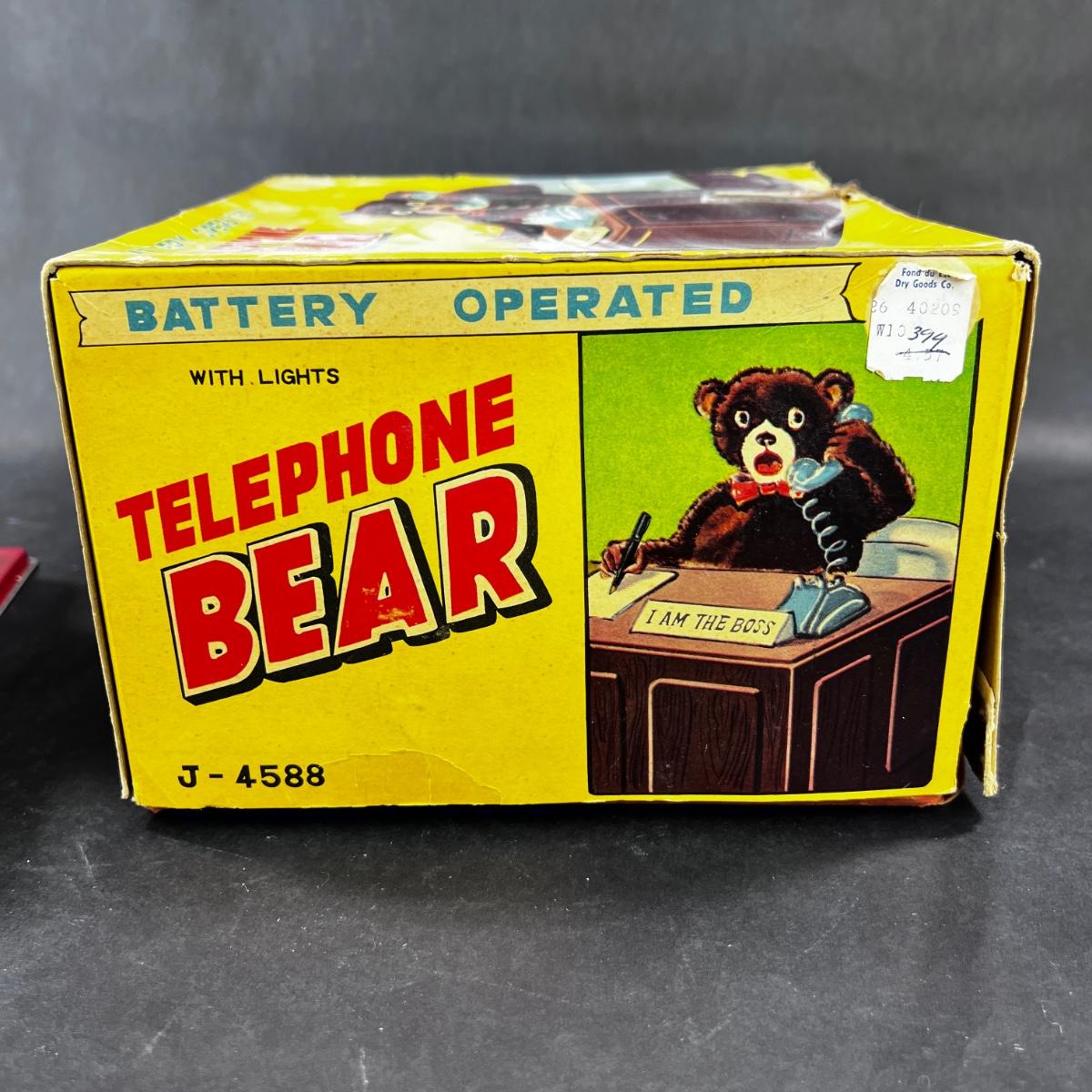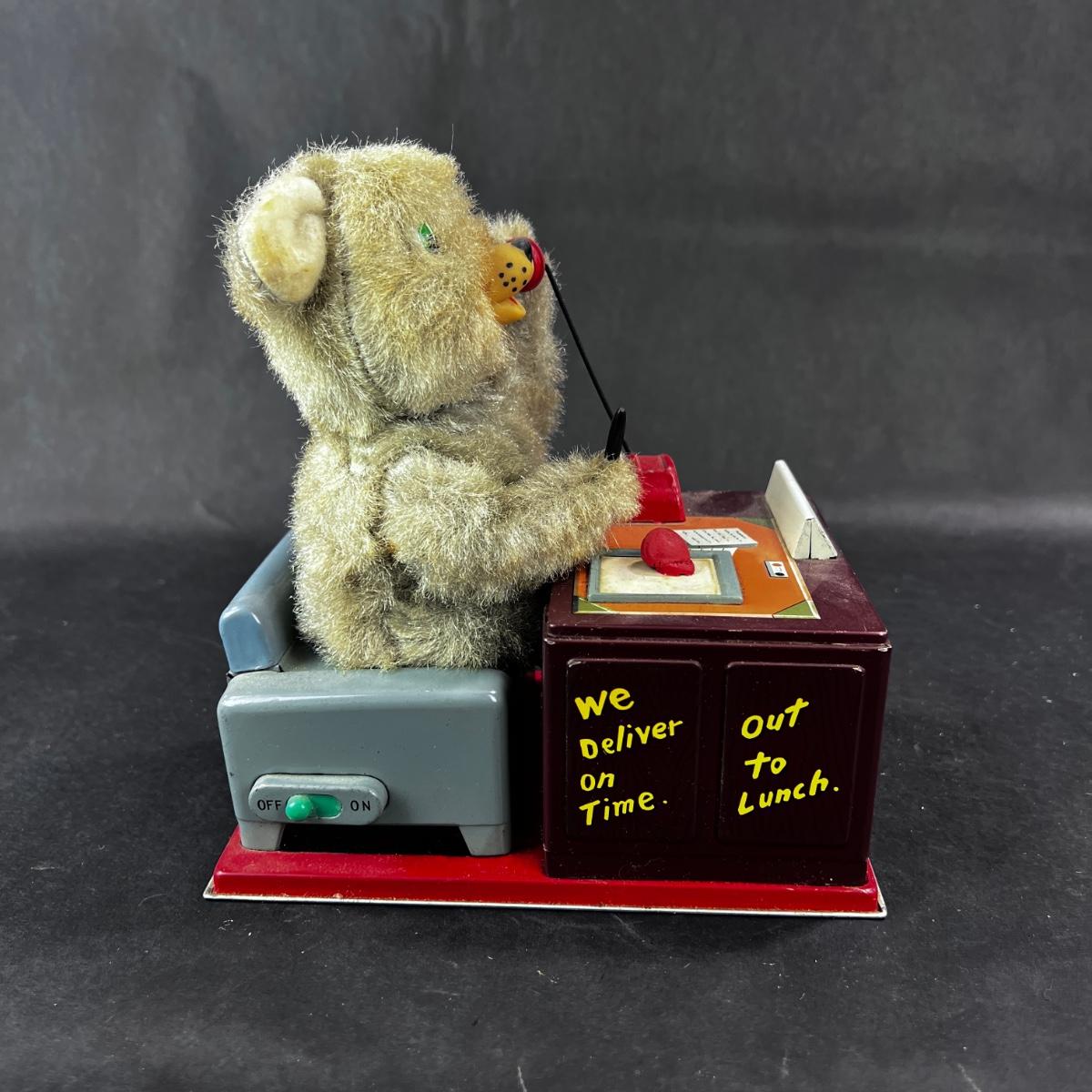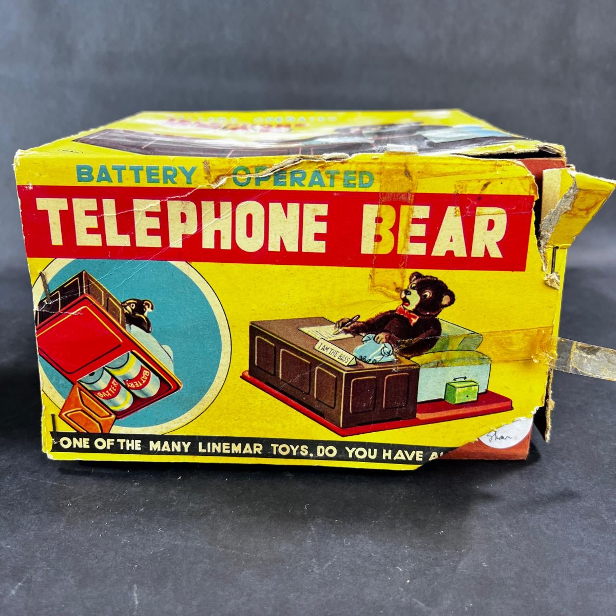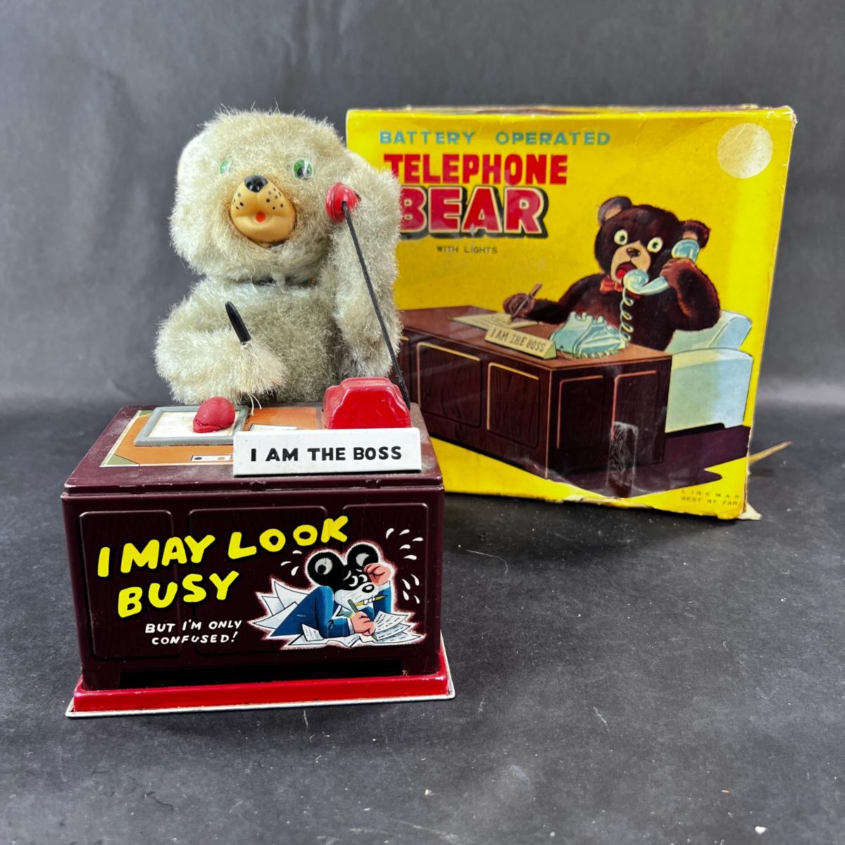 This Telephone Bear is a MUST HAVE. He works diligently, making notes, and when the phone rings, he answers, and laughs/talks while nodding - all while taking notes. If you haven't a telephone bear in your collection, you ought. This Linemar toy was produced in the 1950s. **Works, Video of Function on YouTube Video, Clean - Uses Standard Batteries** Who knew that the buck would stop with a bear? **|** Please see photos for details and condition. ::: Shipping is available on this lot. If you require shipping you must let us know at the close of the auction. We will coordinate with you after the item has been won. Shipping fees will include insurance up to or exceeding the value of all items being mailed. If you have any questions regarding this lot please contact the auctioneer either via this website, by direct email or by phone. PICK UP TIMES and other important information can be found in the TERMS and DESCRIPTION of the auction. Please take a look for pertinent information. Thanks!