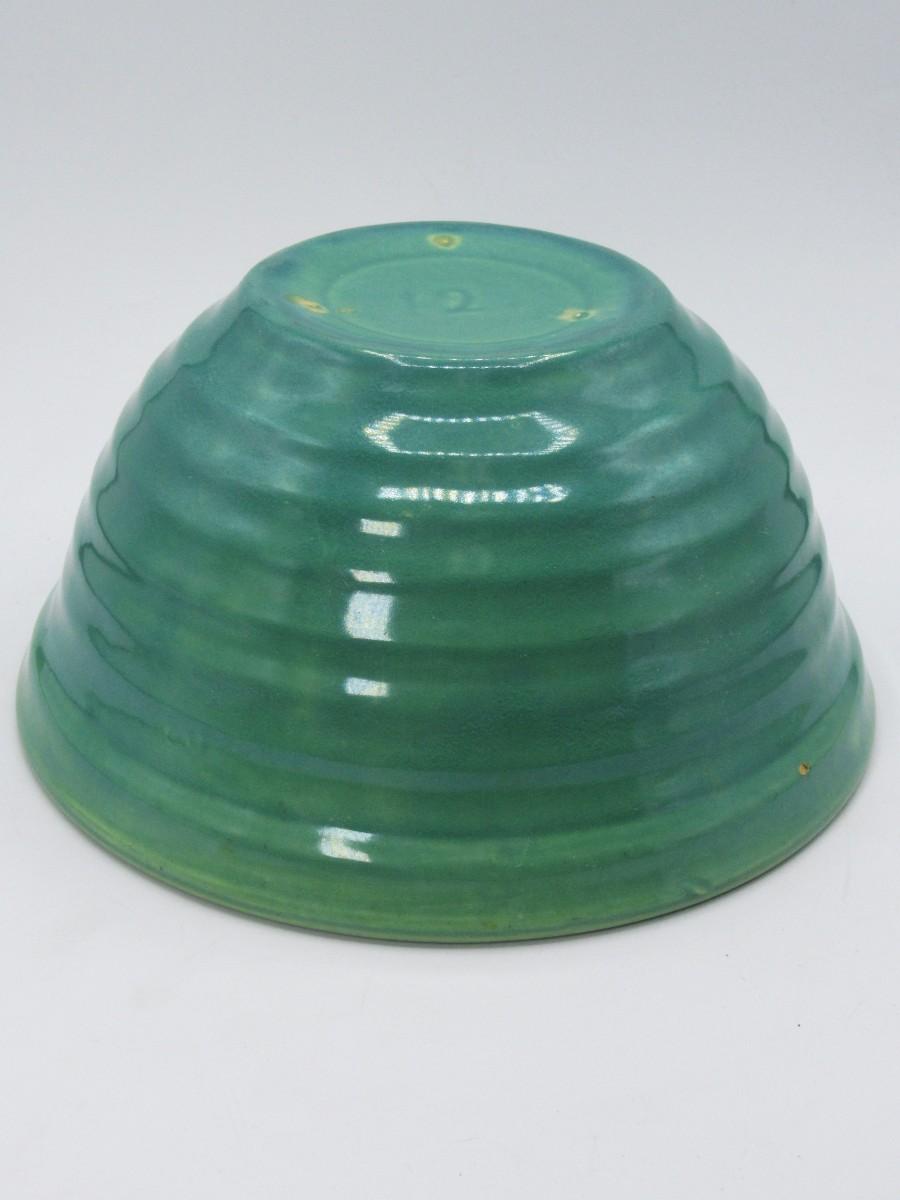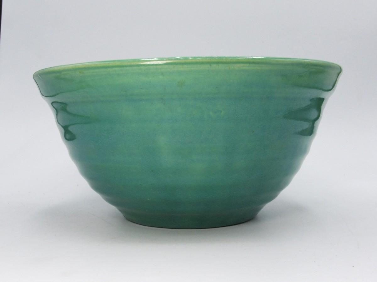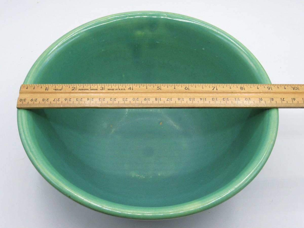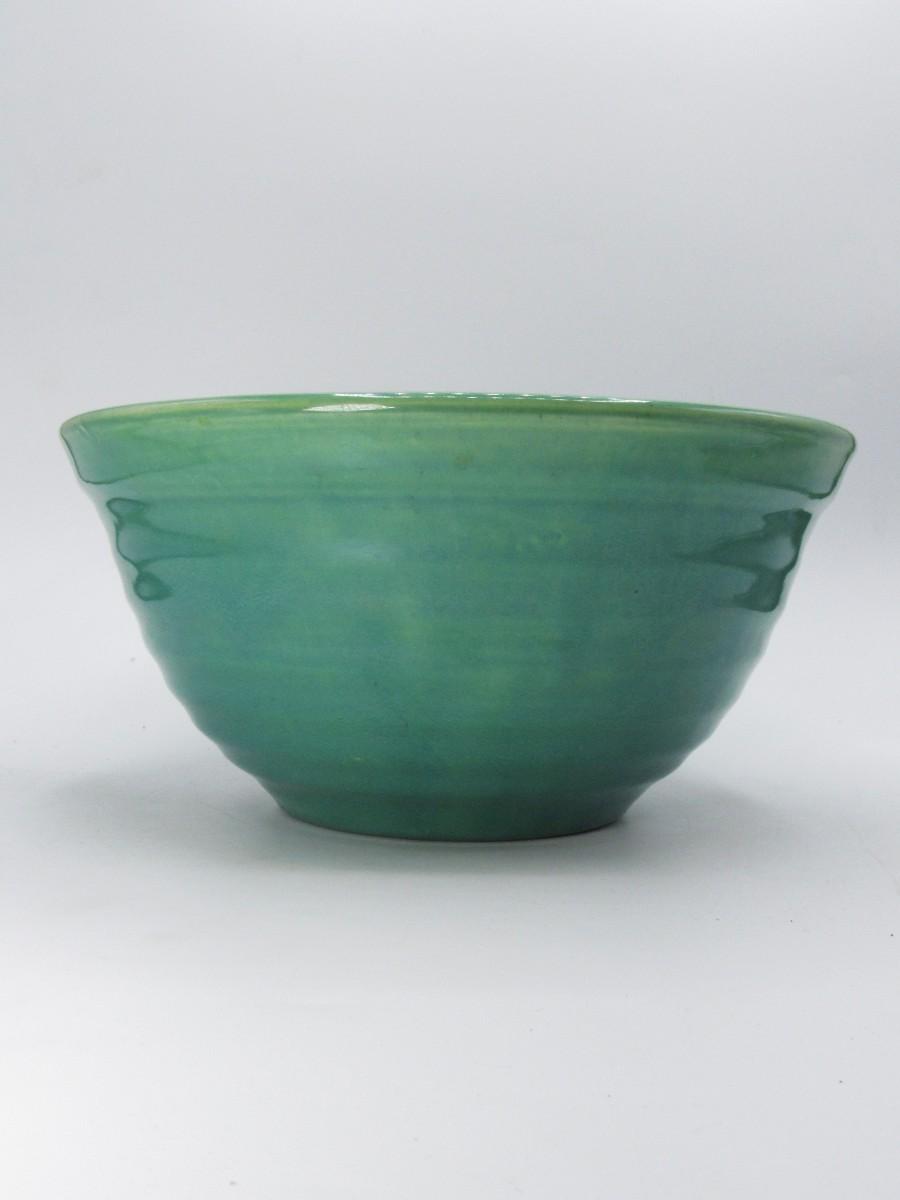 Jade green / mint green ringware #12 ceramic bowl by AJ Bauer Pottery. Made in Los Angeles c. 1930-1940s. In good to very good condition. One chip on side of the bowl, see photos. Signs of normal wear. Approx. 9" across.