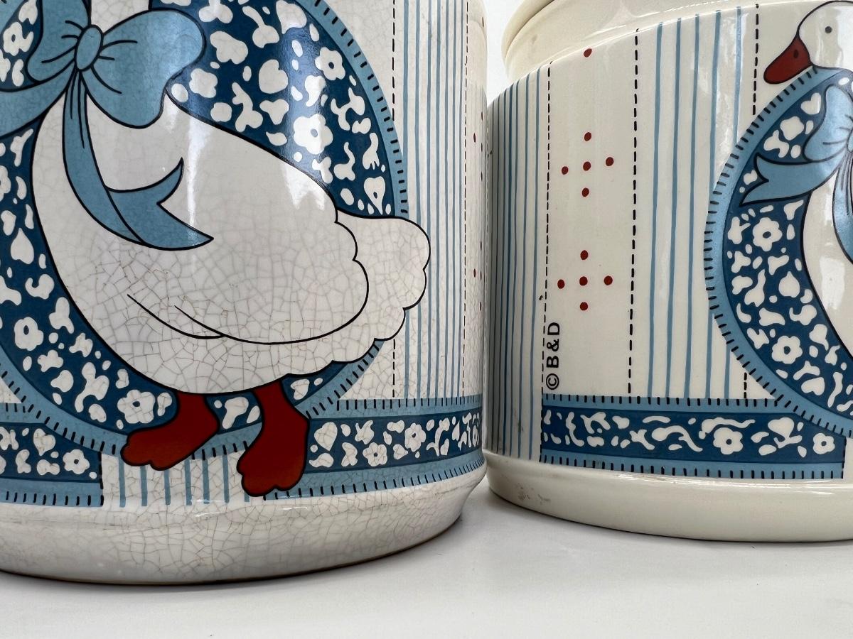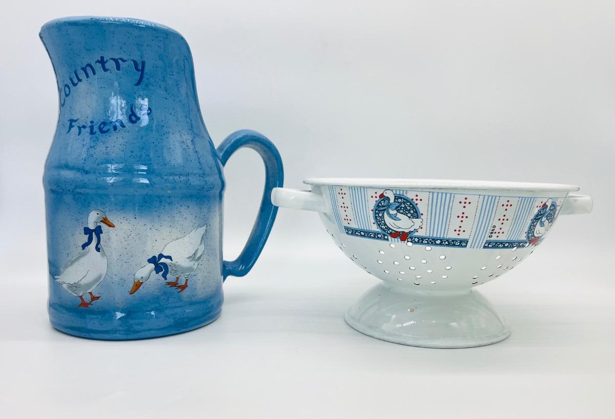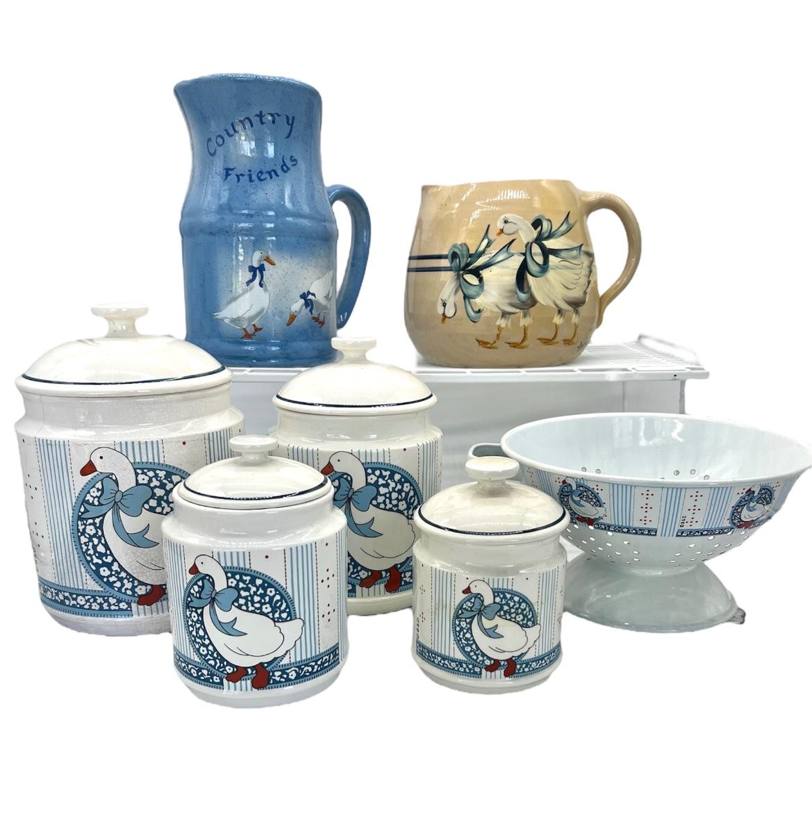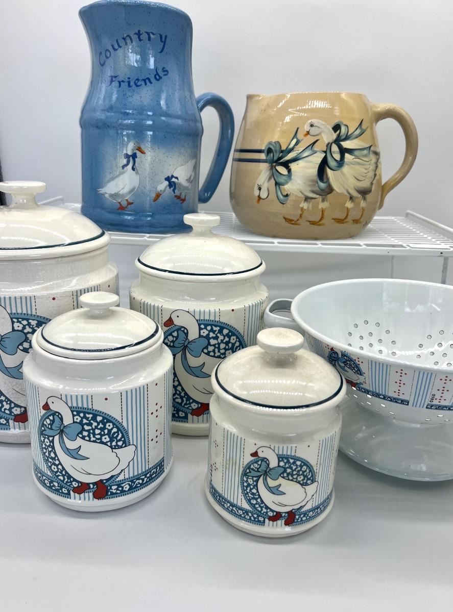 Bringing it back! Vintage B&D Ceramic Goose Canister set Japan measures from tallest at 10 inches tall smallest at 6 inches tall. B&D Colander. Painted geese signed pottery measures 7 inches tall, blue country friends pitcher pottery Measures 9 1/2 inches tall. Some crazing on the canister.