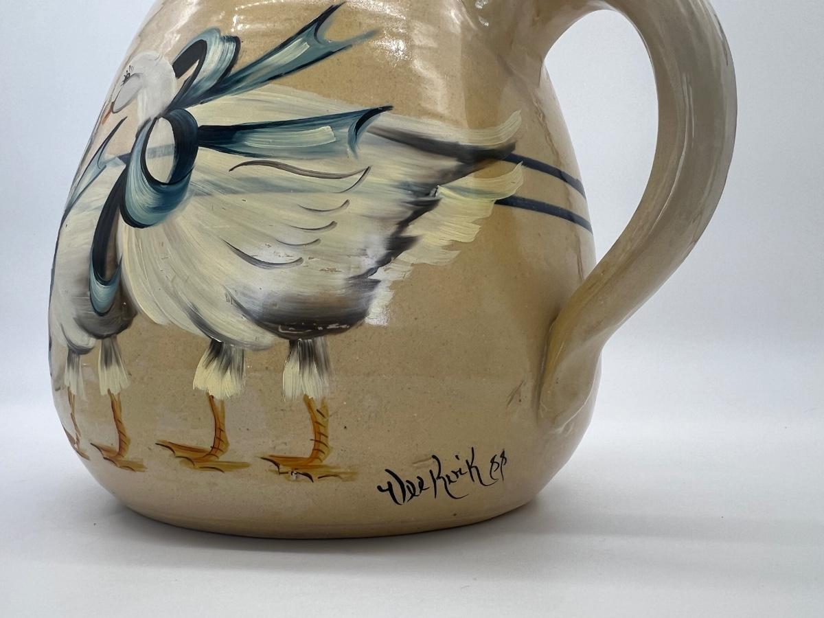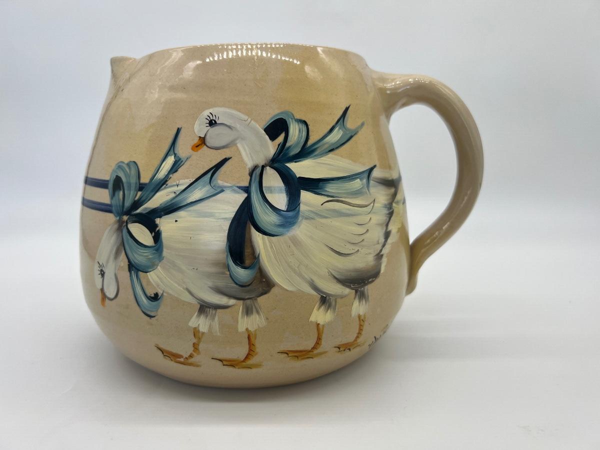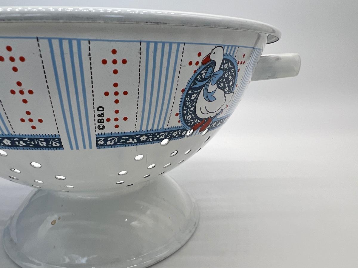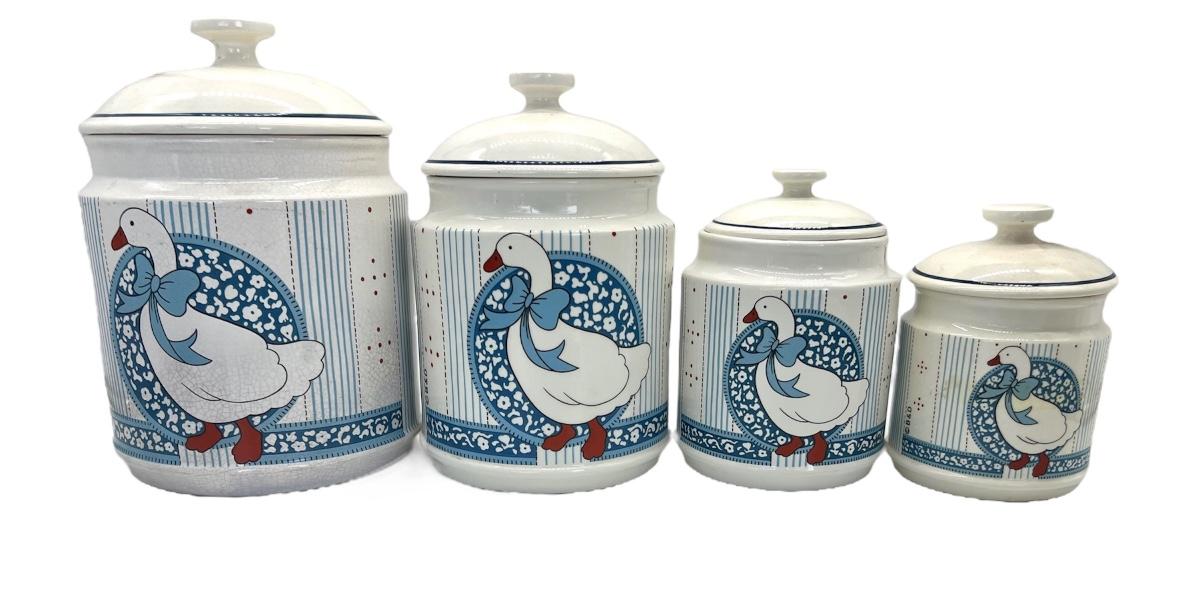 Bringing it back! Vintage B&D Ceramic Goose Canister set Japan measures from tallest at 10 inches tall smallest at 6 inches tall. B&D Colander. Painted geese signed pottery measures 7 inches tall, blue country friends pitcher pottery Measures 9 1/2 inches tall. Some crazing on the canister.