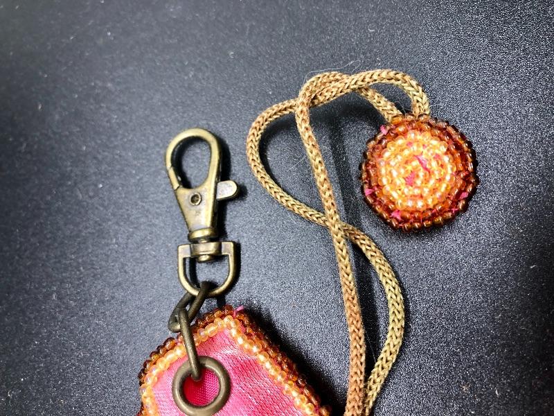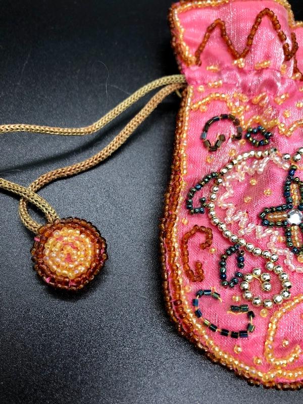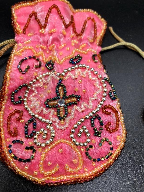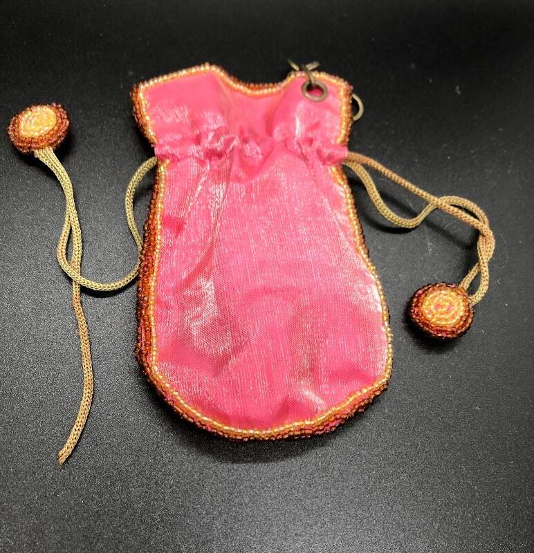 Vintage bead embellished drawstring trinket coin purse. Bead design on one side. Has a clip on the corner to attach to a belt or purse. Origin and age unknown.