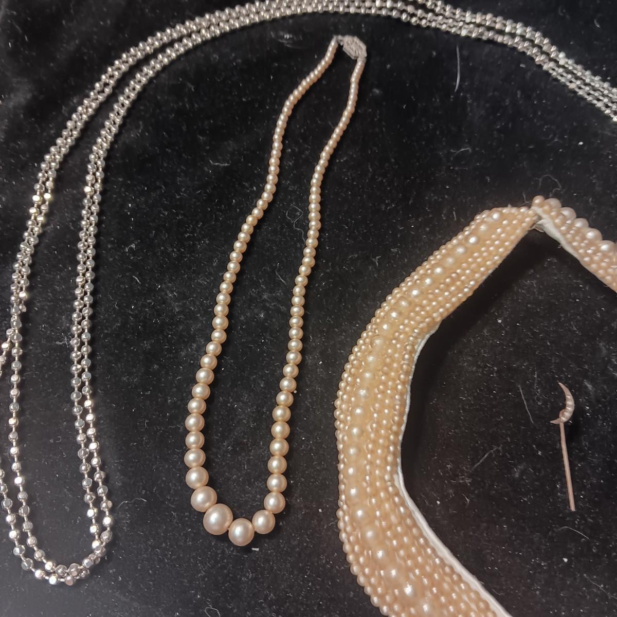 VINTAGE BEADED COLLAR, VERY LONG SILVER TONE CHAIN AND FAUX PEARL NECKLACE