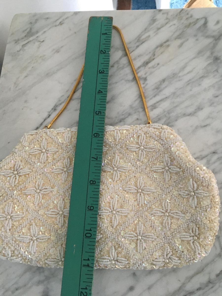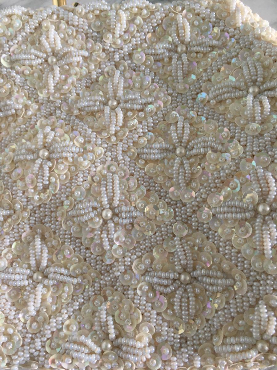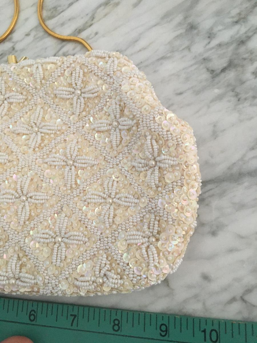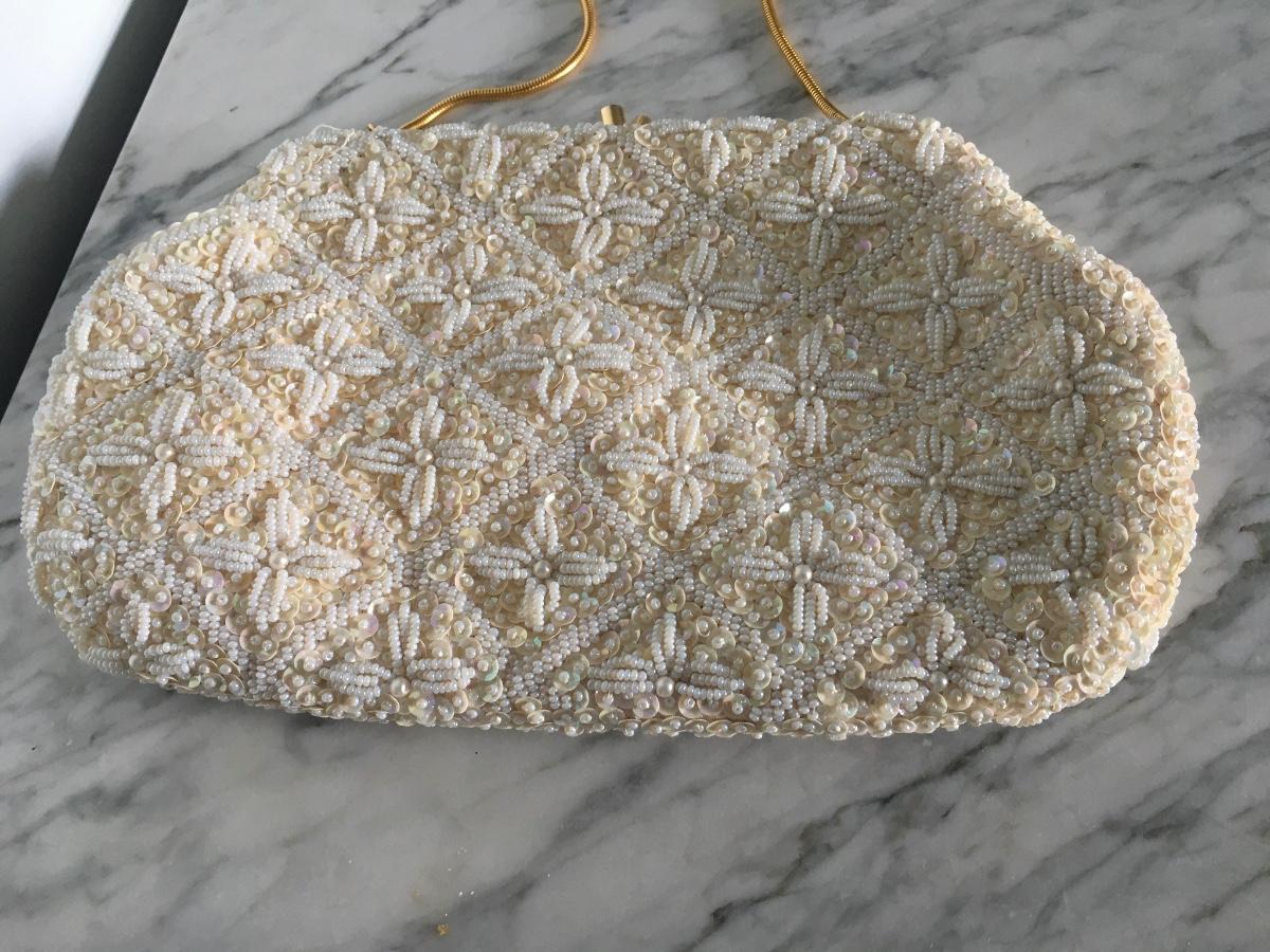Vintage evening bag with delicate floral pattern, clutch or you can you gold colored metal strap.