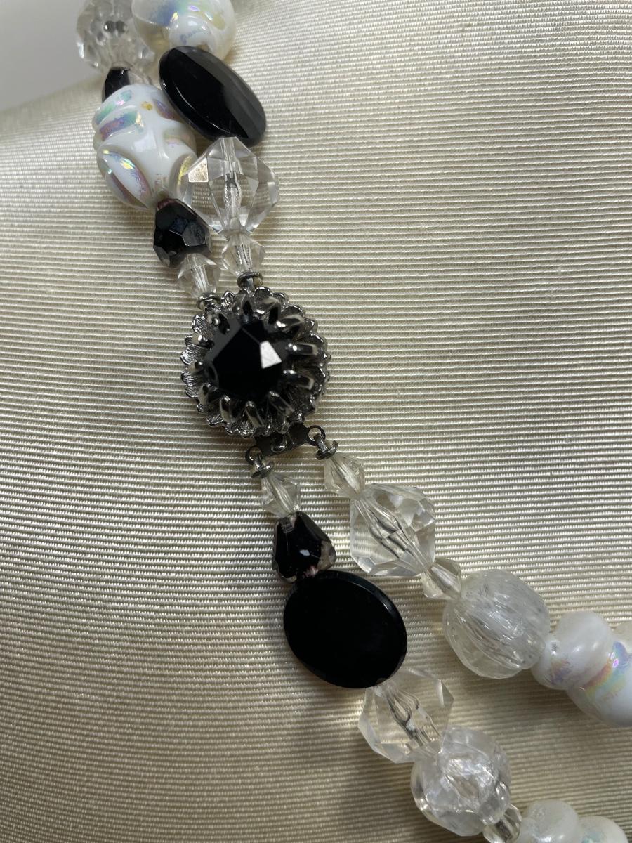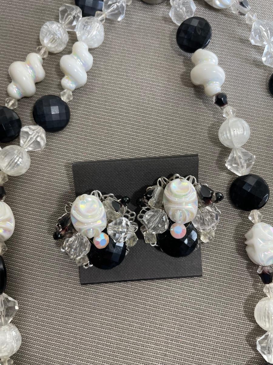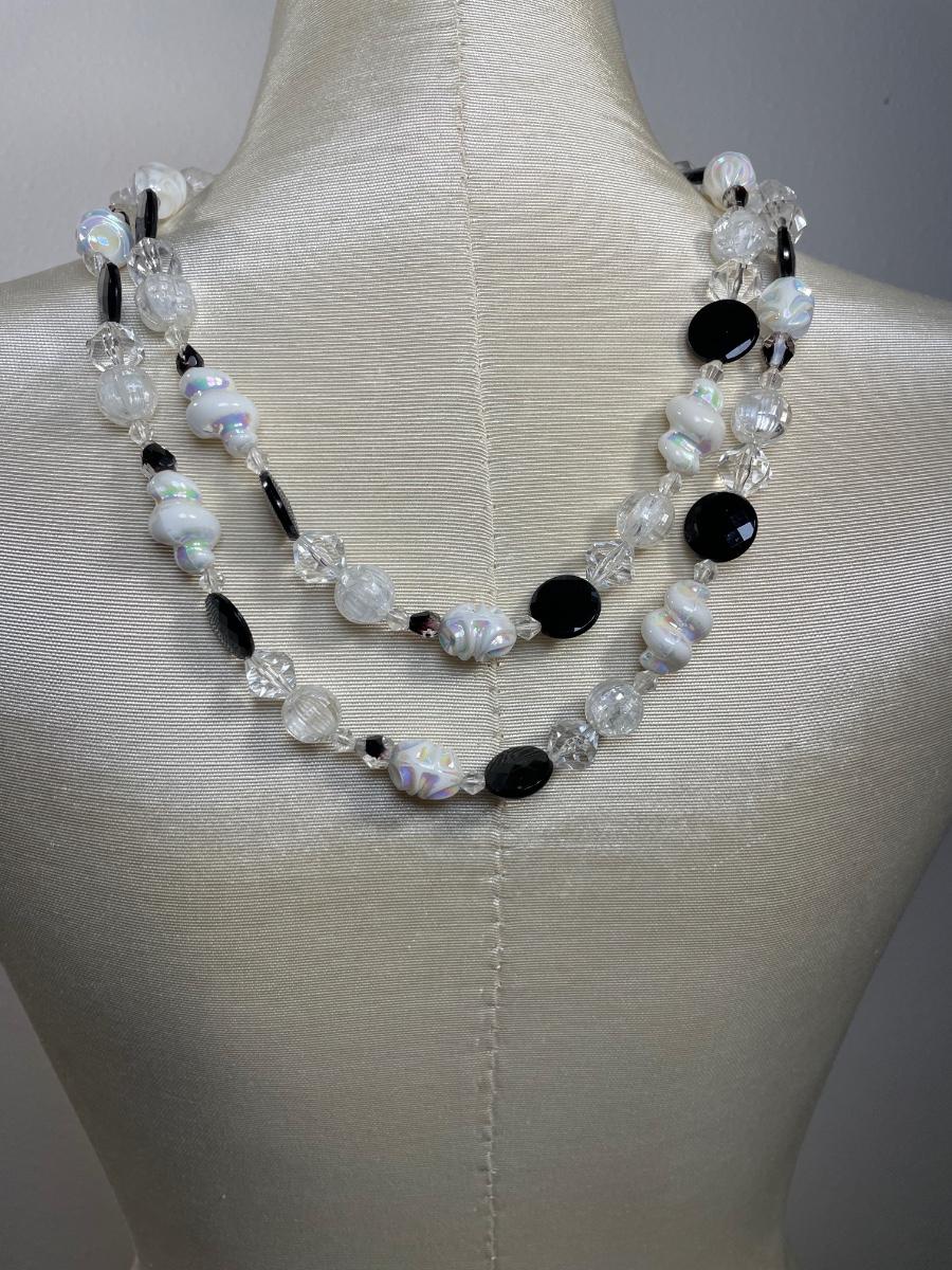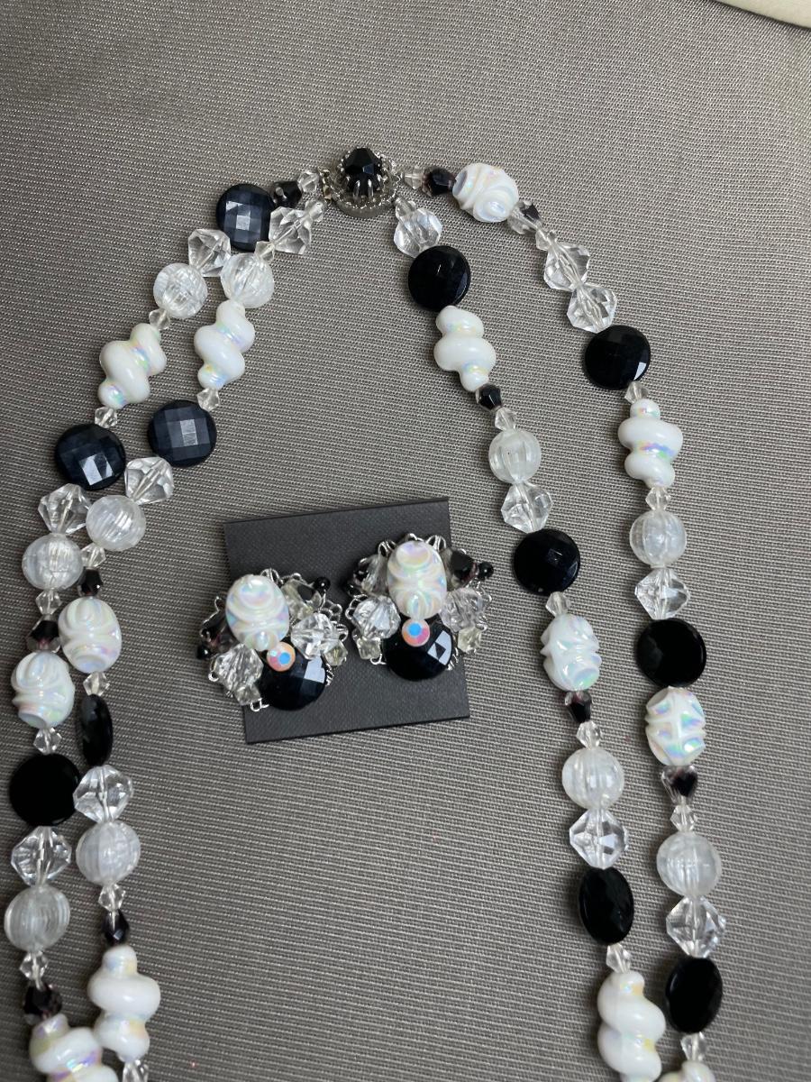 24 inches long 2 strand necklace. With black and white plastic or acrylic beads and clear faceted glass beads. Matching clip earrings.