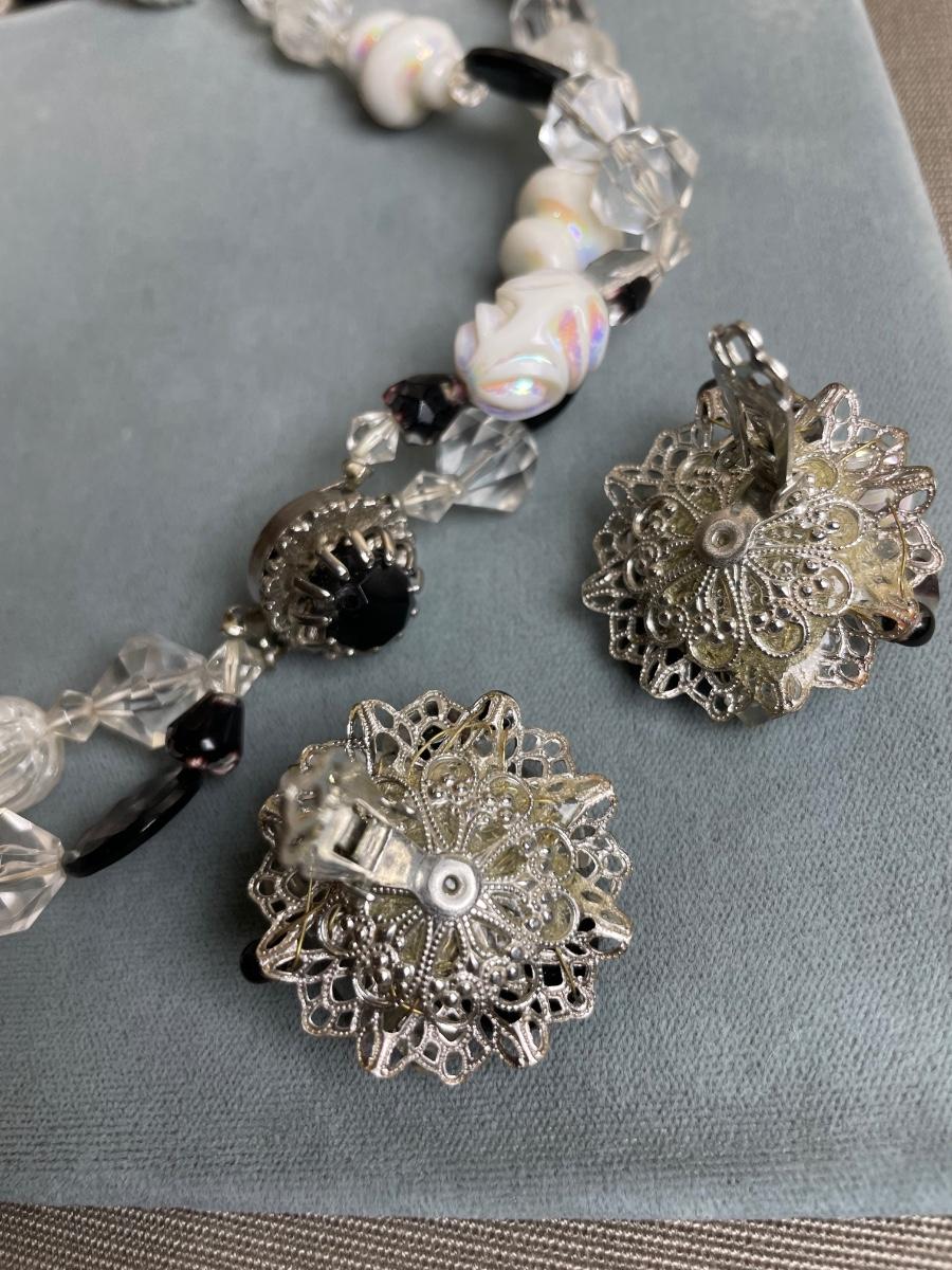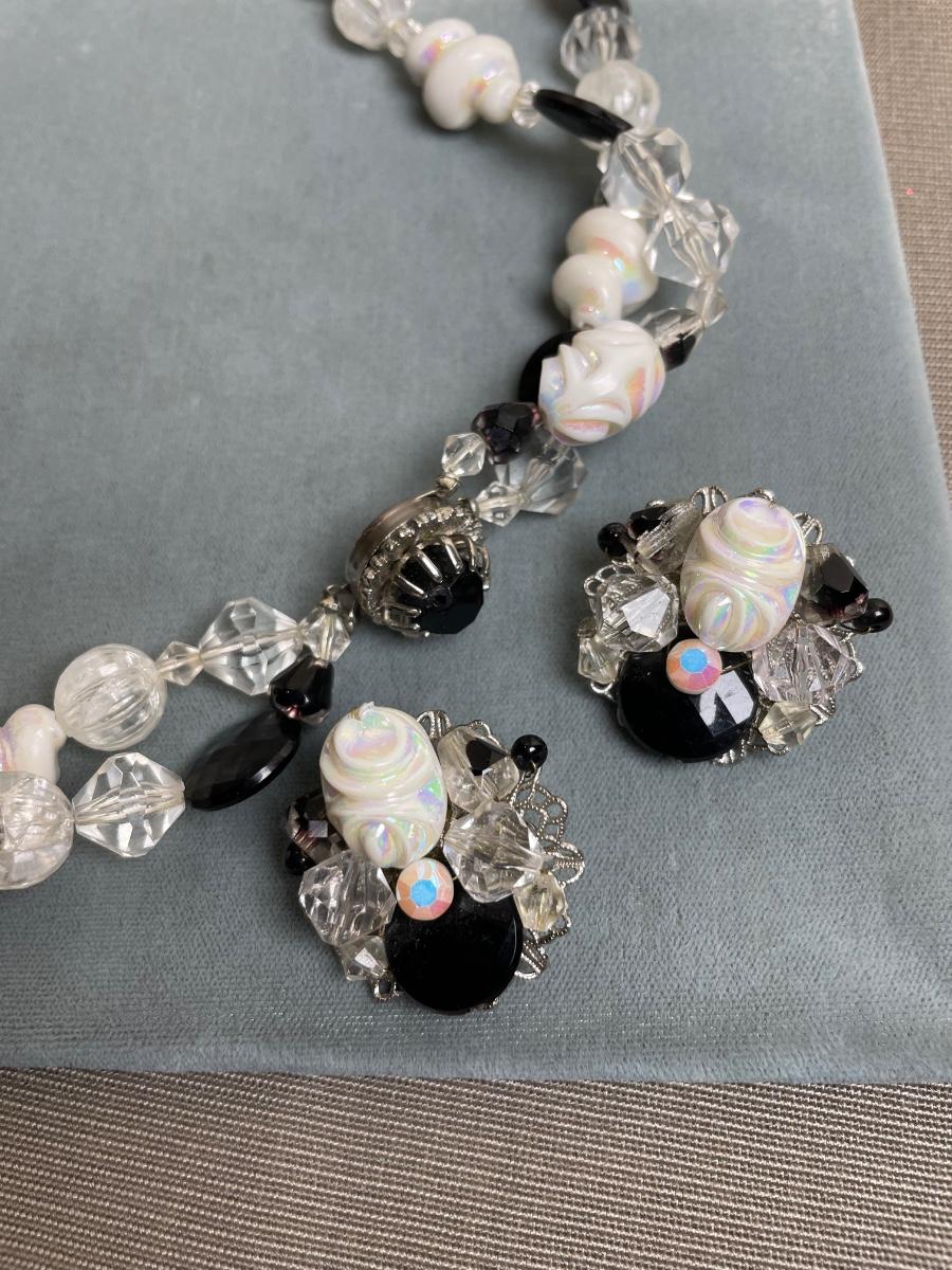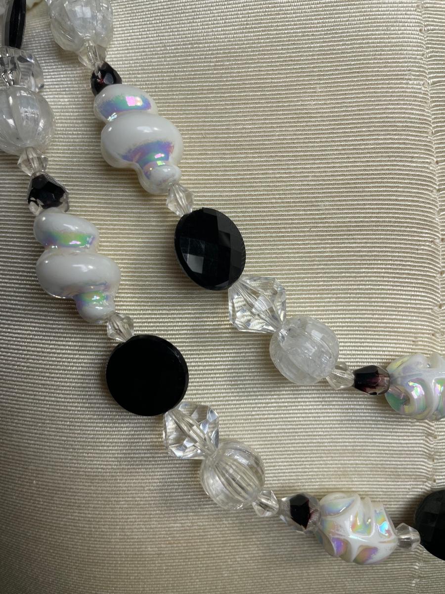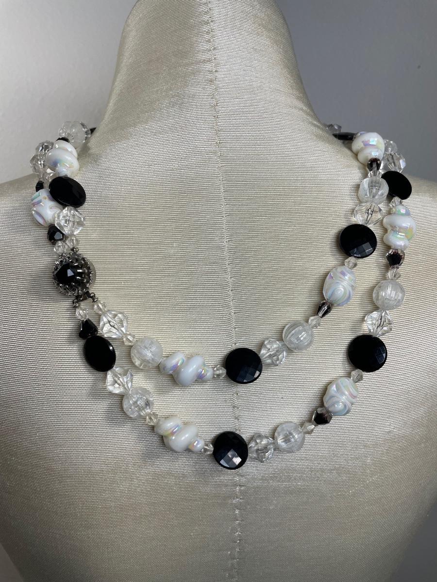 24 inches long 2 strand necklace. With black and white plastic or acrylic beads and clear faceted glass beads. Matching clip earrings.
