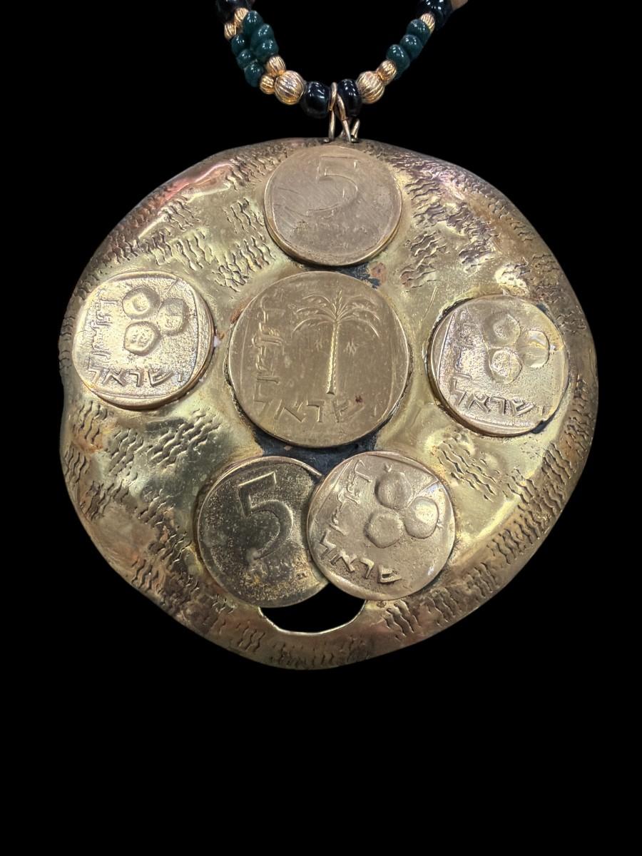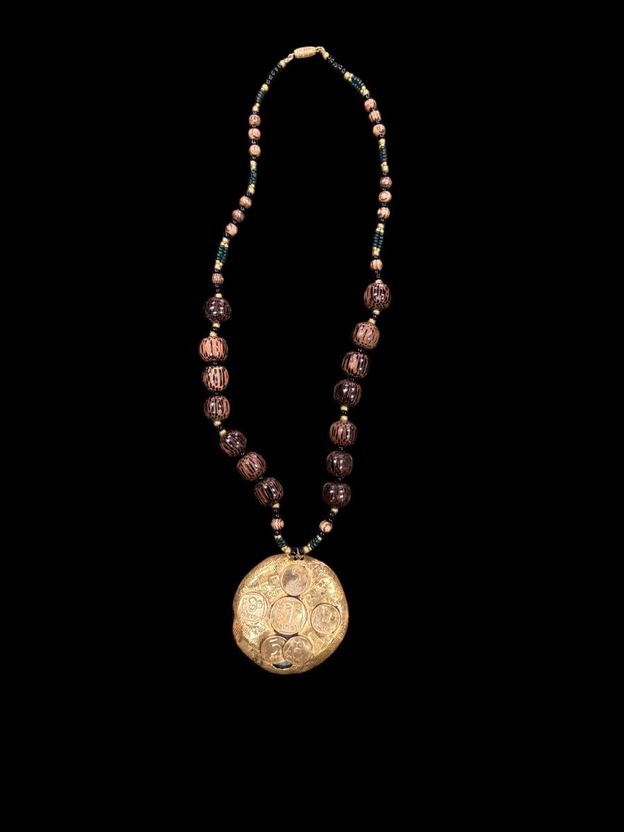 Vintage Beaded Necklace with A Large Ornate Replica Coin Medallion Pendant