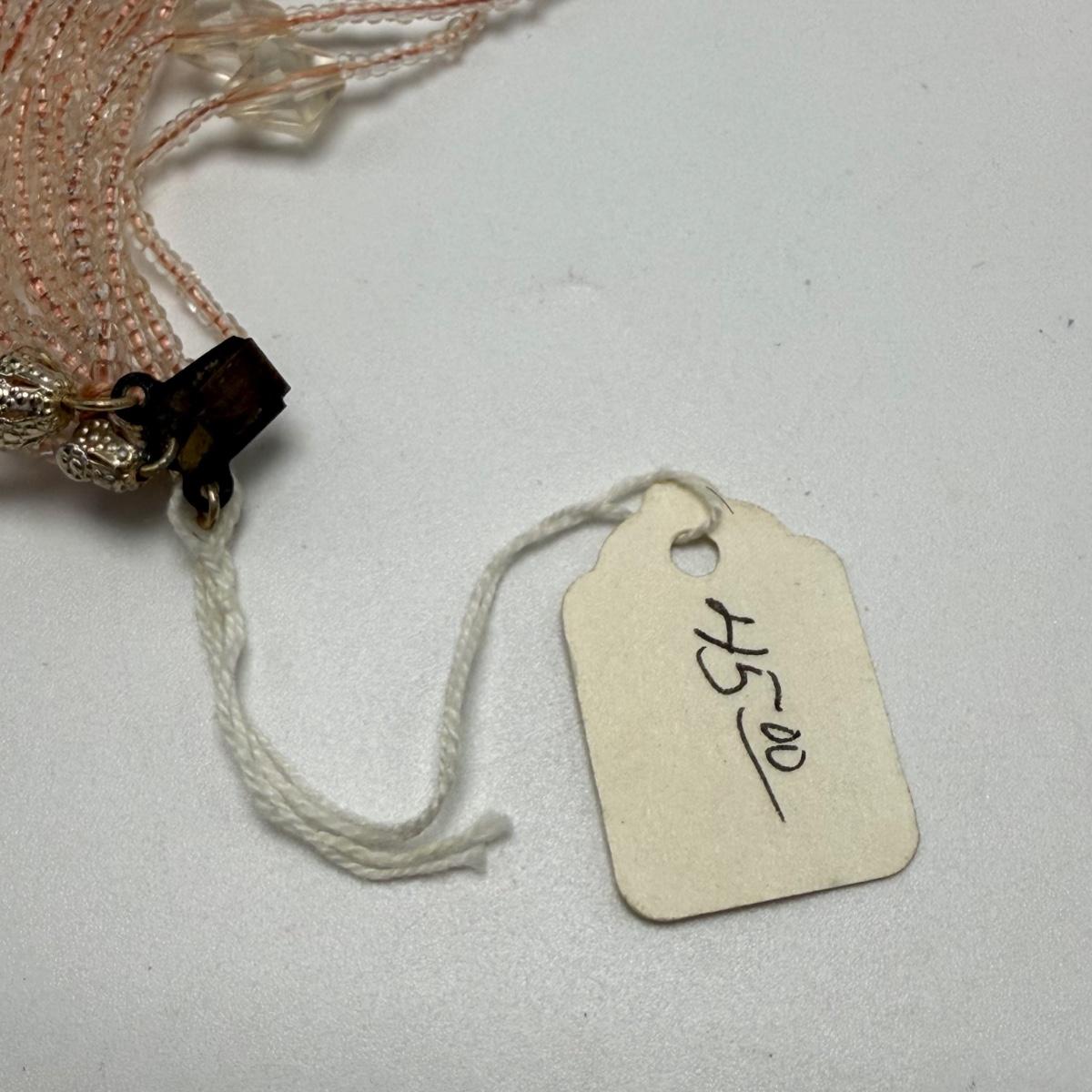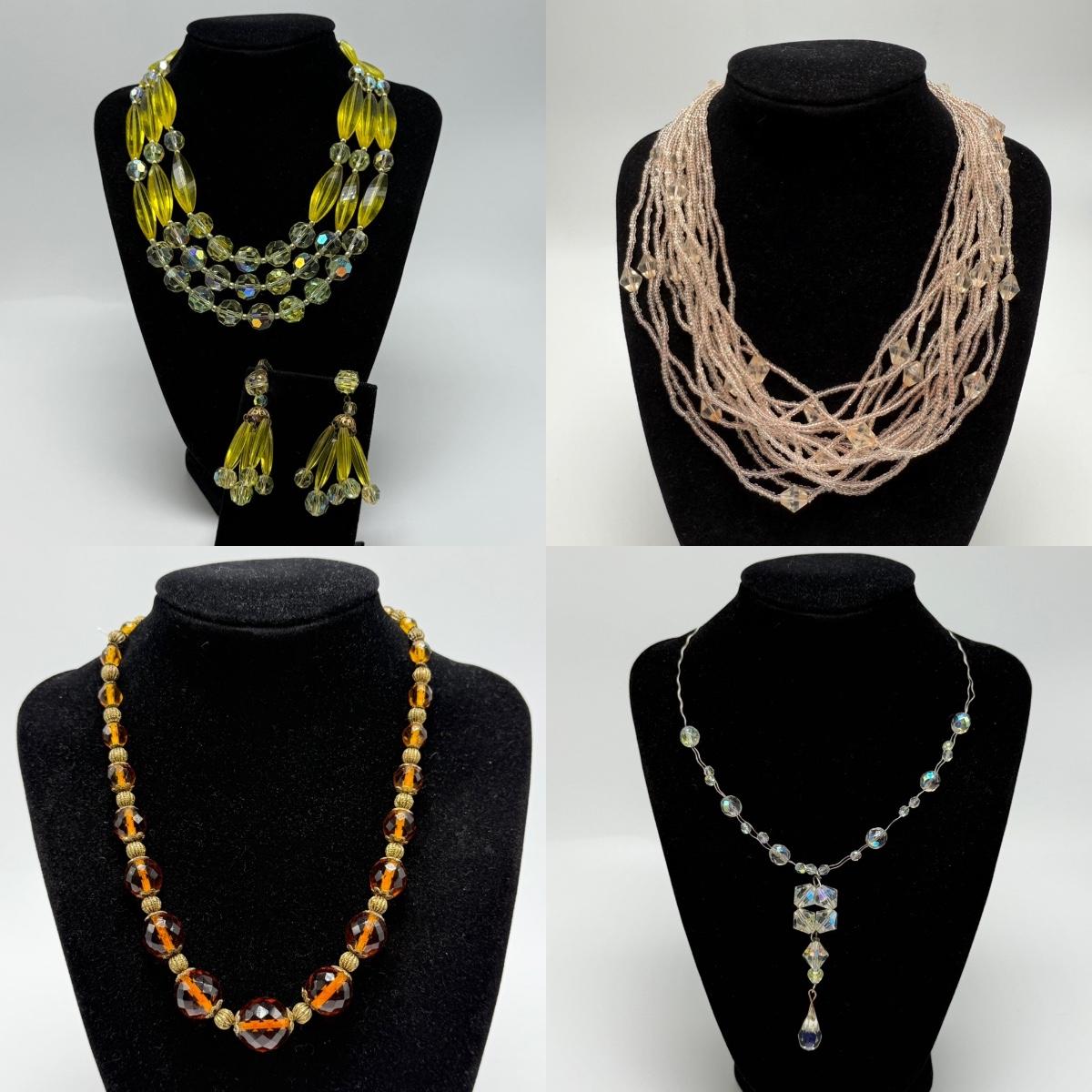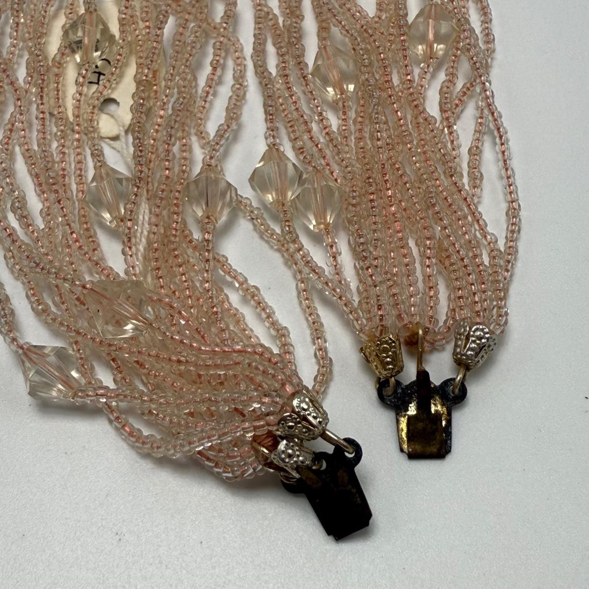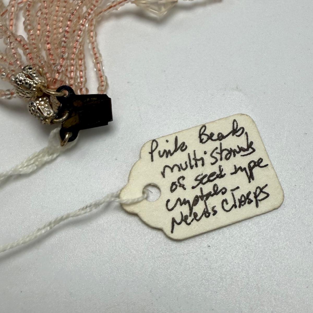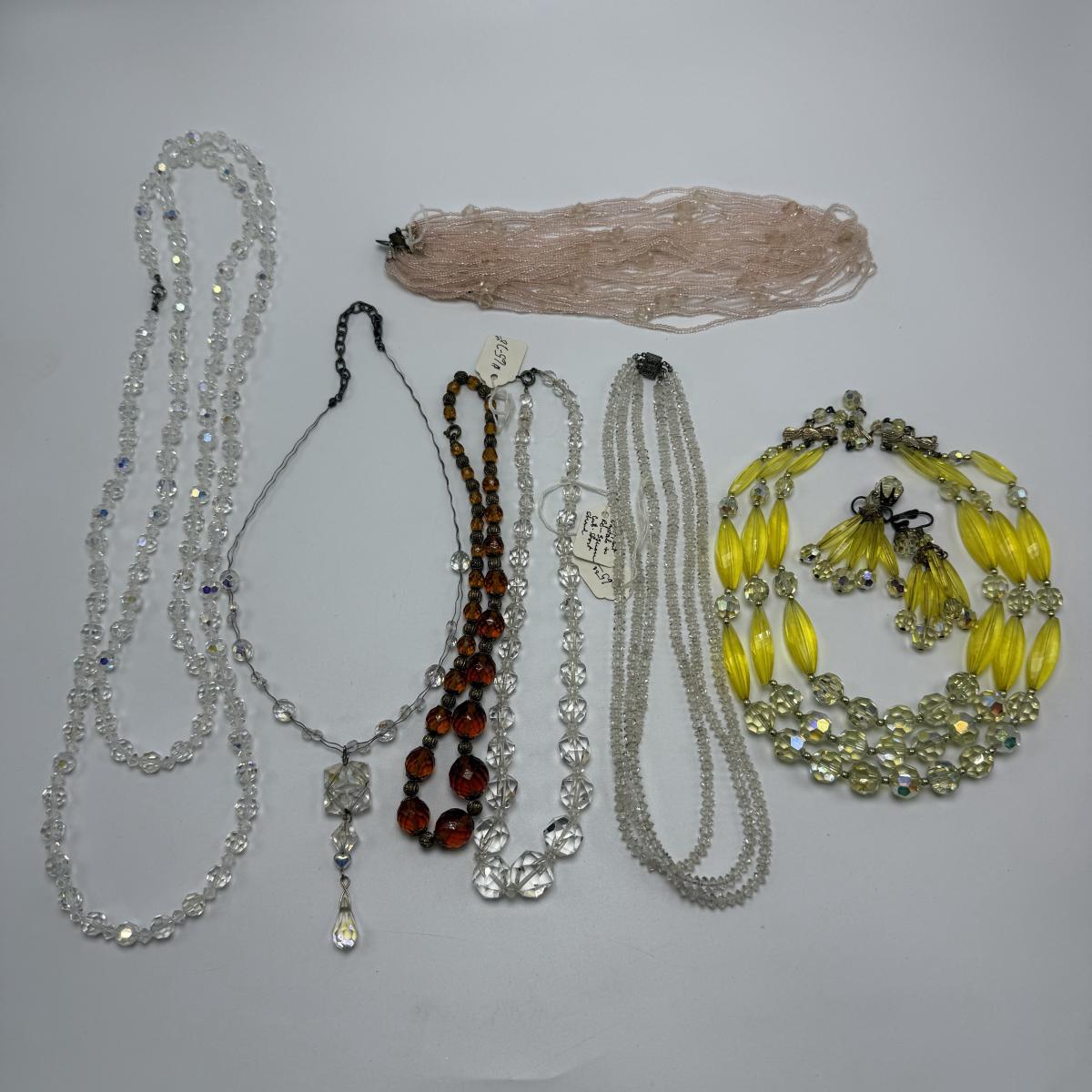 Seven vintage beaded necklaces. One has a matching pair of clip-on earrings. A few of the necklaces have previous price tags with descriptions attached. We cannot verify the information on the tags. One clasp is stamped “Sterling”. The longest necklace, showed doubled up, is approximately 54“. The pink multi-strand necklace needs a new clasp.