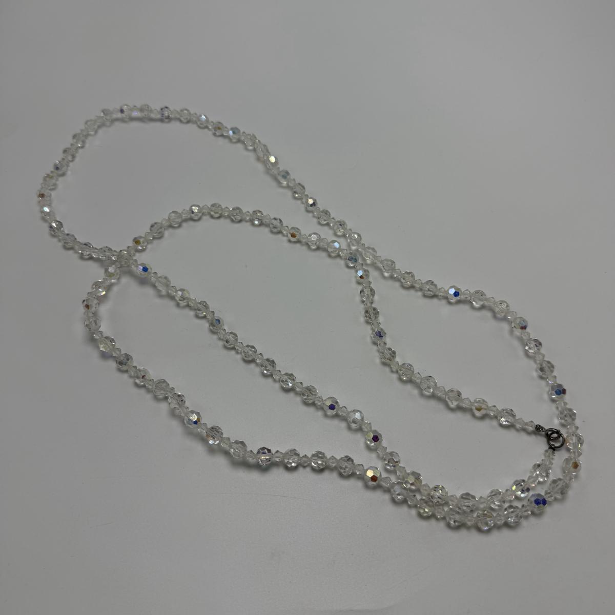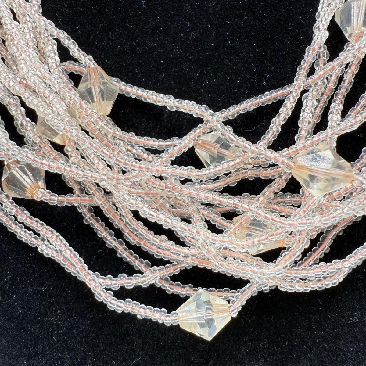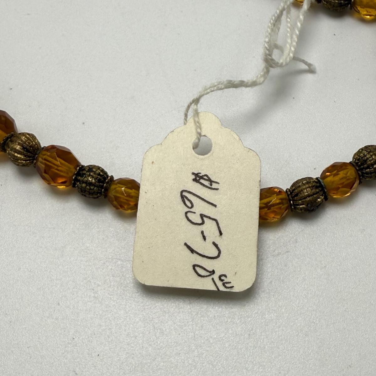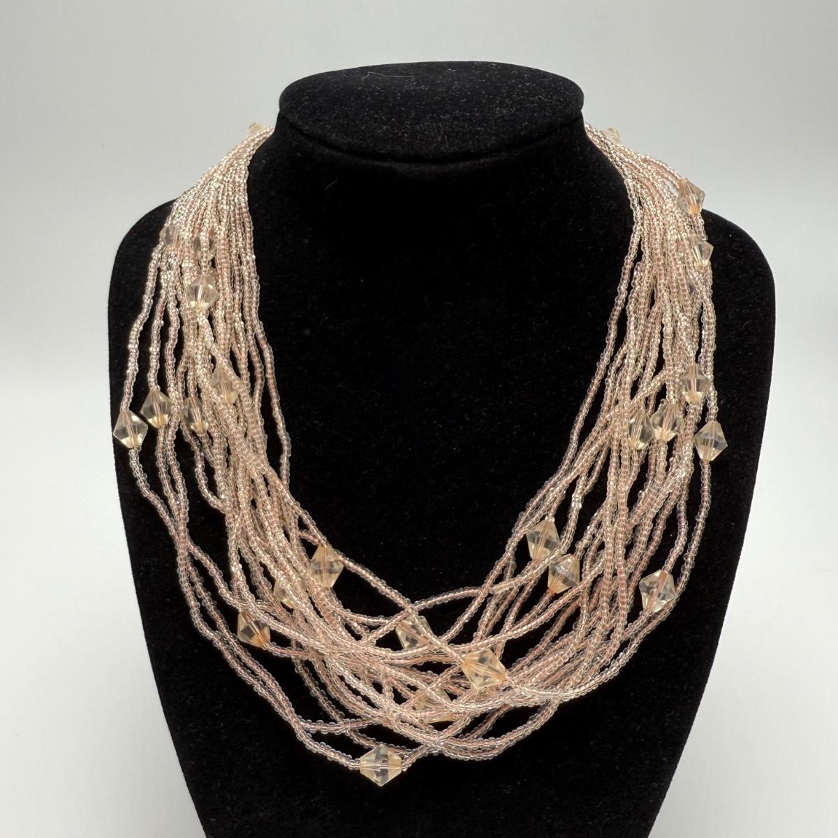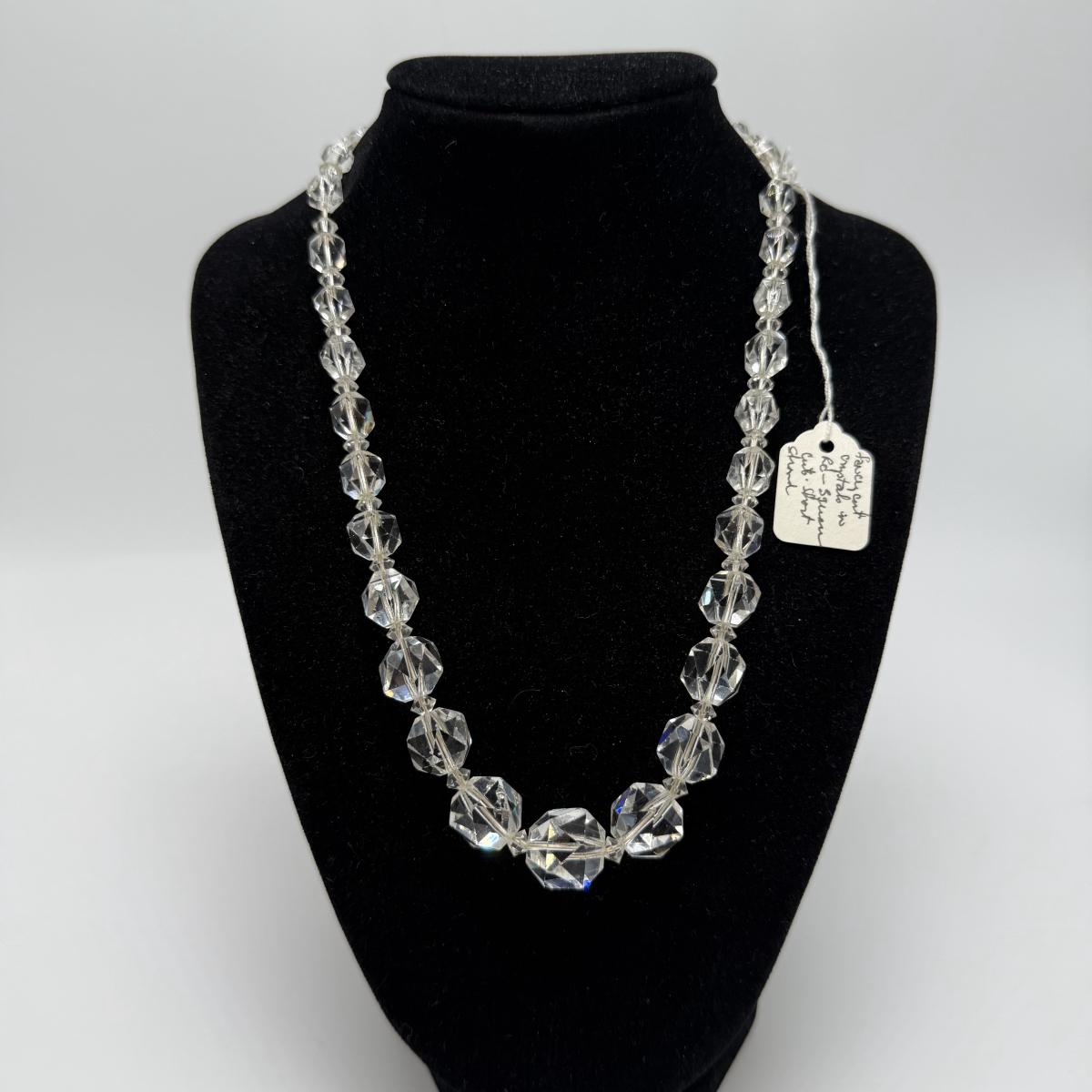 Seven vintage beaded necklaces. One has a matching pair of clip-on earrings. A few of the necklaces have previous price tags with descriptions attached. We cannot verify the information on the tags. One clasp is stamped “Sterling”. The longest necklace, showed doubled up, is approximately 54“. The pink multi-strand necklace needs a new clasp.