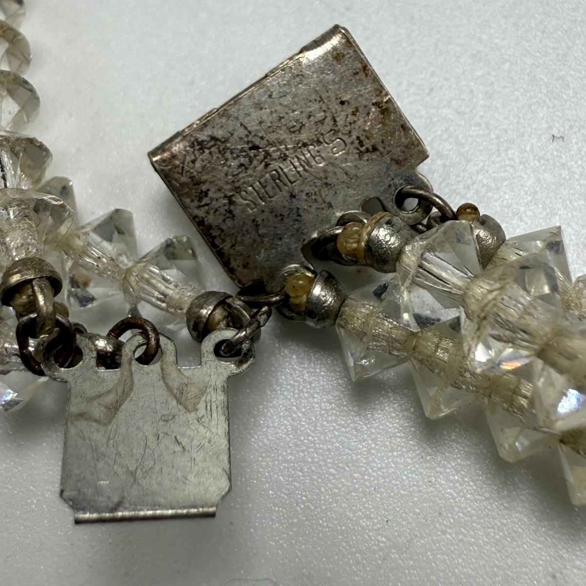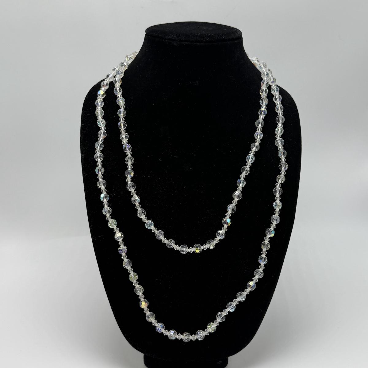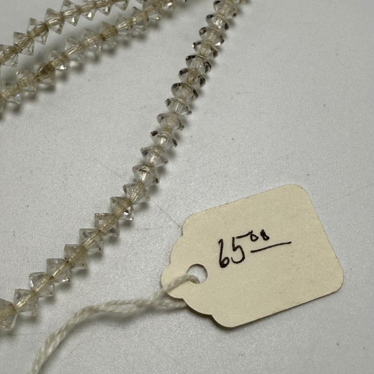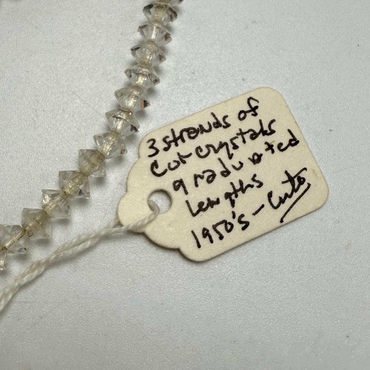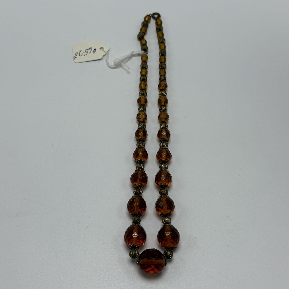 Seven vintage beaded necklaces. One has a matching pair of clip-on earrings. A few of the necklaces have previous price tags with descriptions attached. We cannot verify the information on the tags. One clasp is stamped “Sterling”. The longest necklace, showed doubled up, is approximately 54“. The pink multi-strand necklace needs a new clasp.
