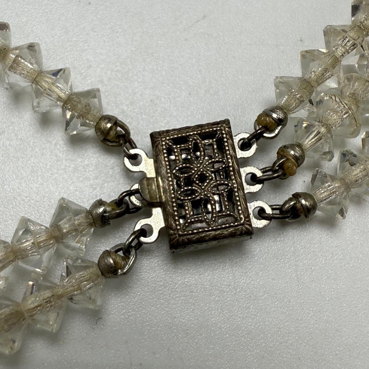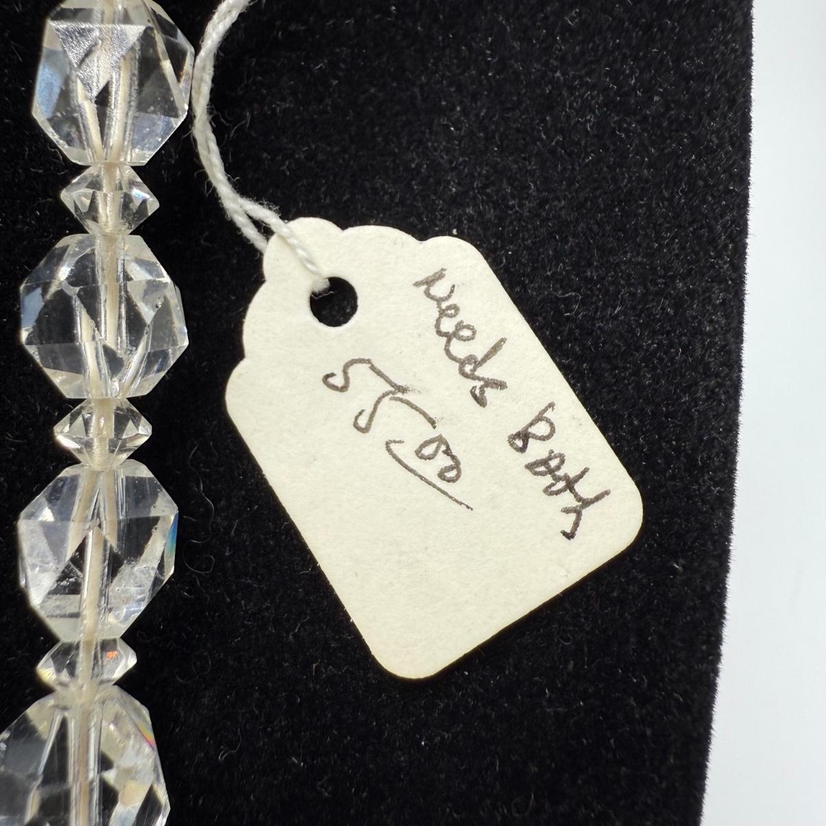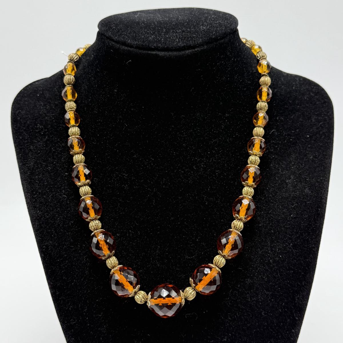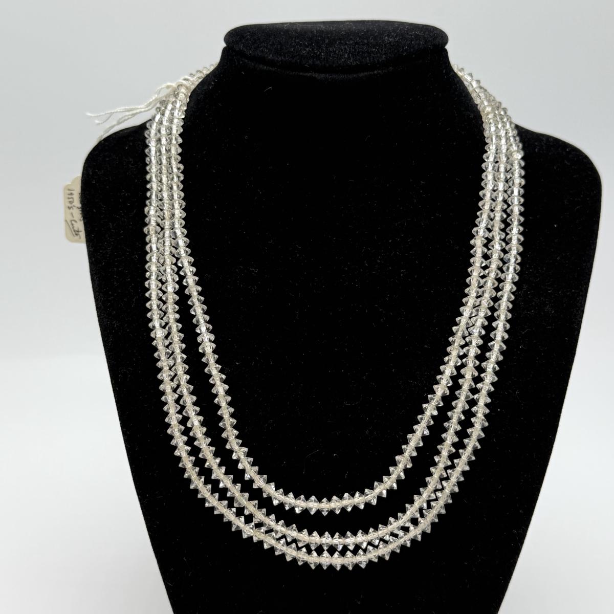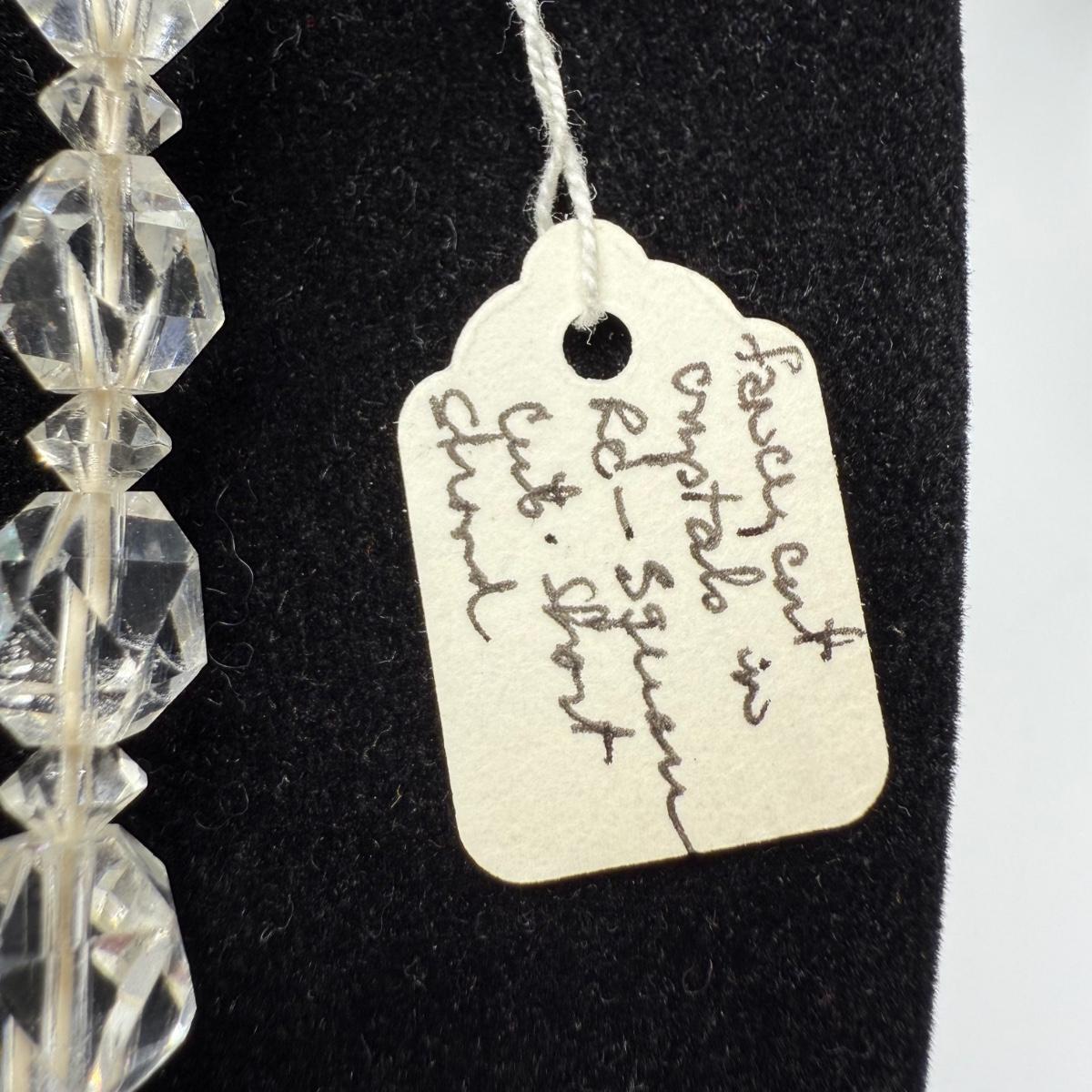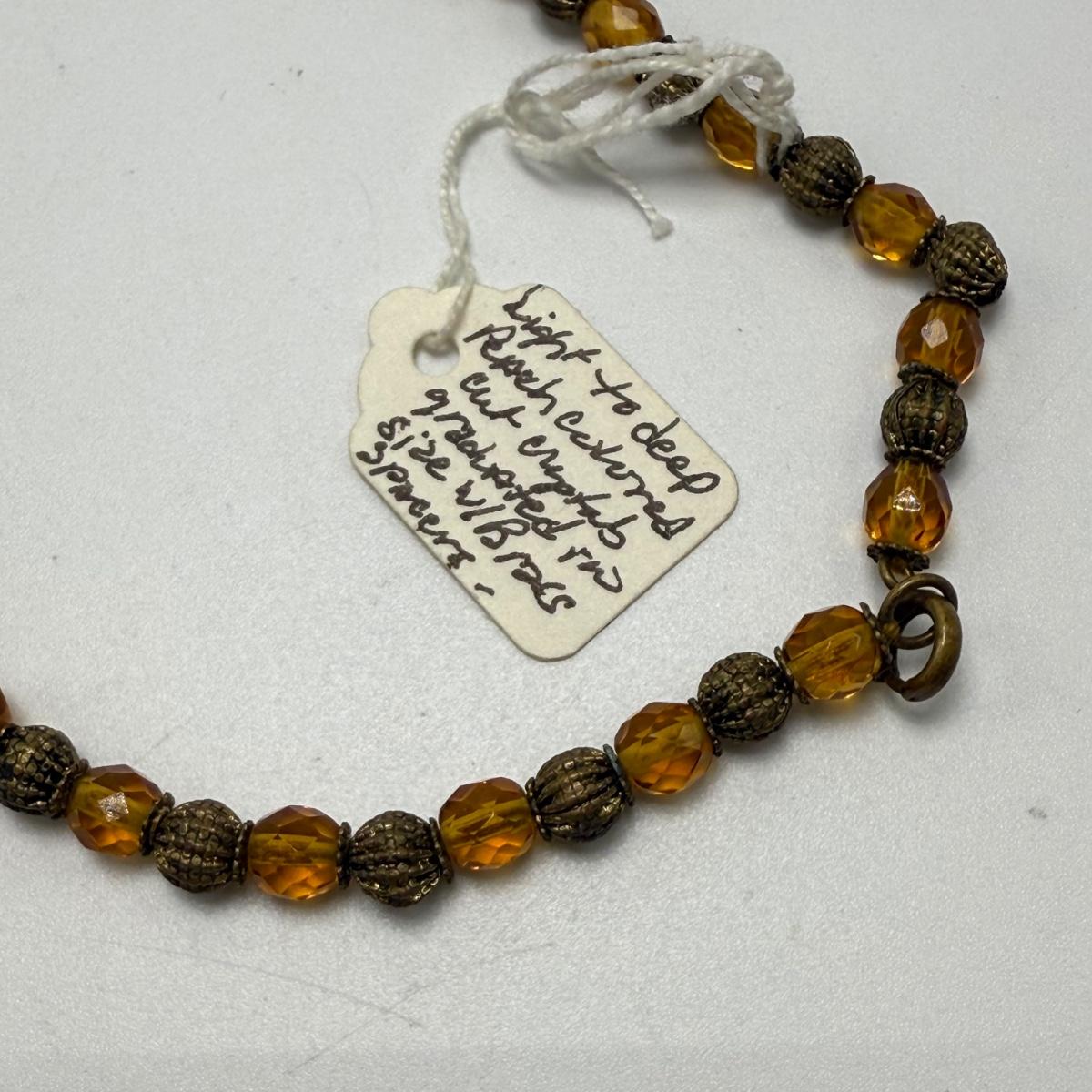 Seven vintage beaded necklaces. One has a matching pair of clip-on earrings. A few of the necklaces have previous price tags with descriptions attached. We cannot verify the information on the tags. One clasp is stamped “Sterling”. The longest necklace, showed doubled up, is approximately 54“. The pink multi-strand necklace needs a new clasp.