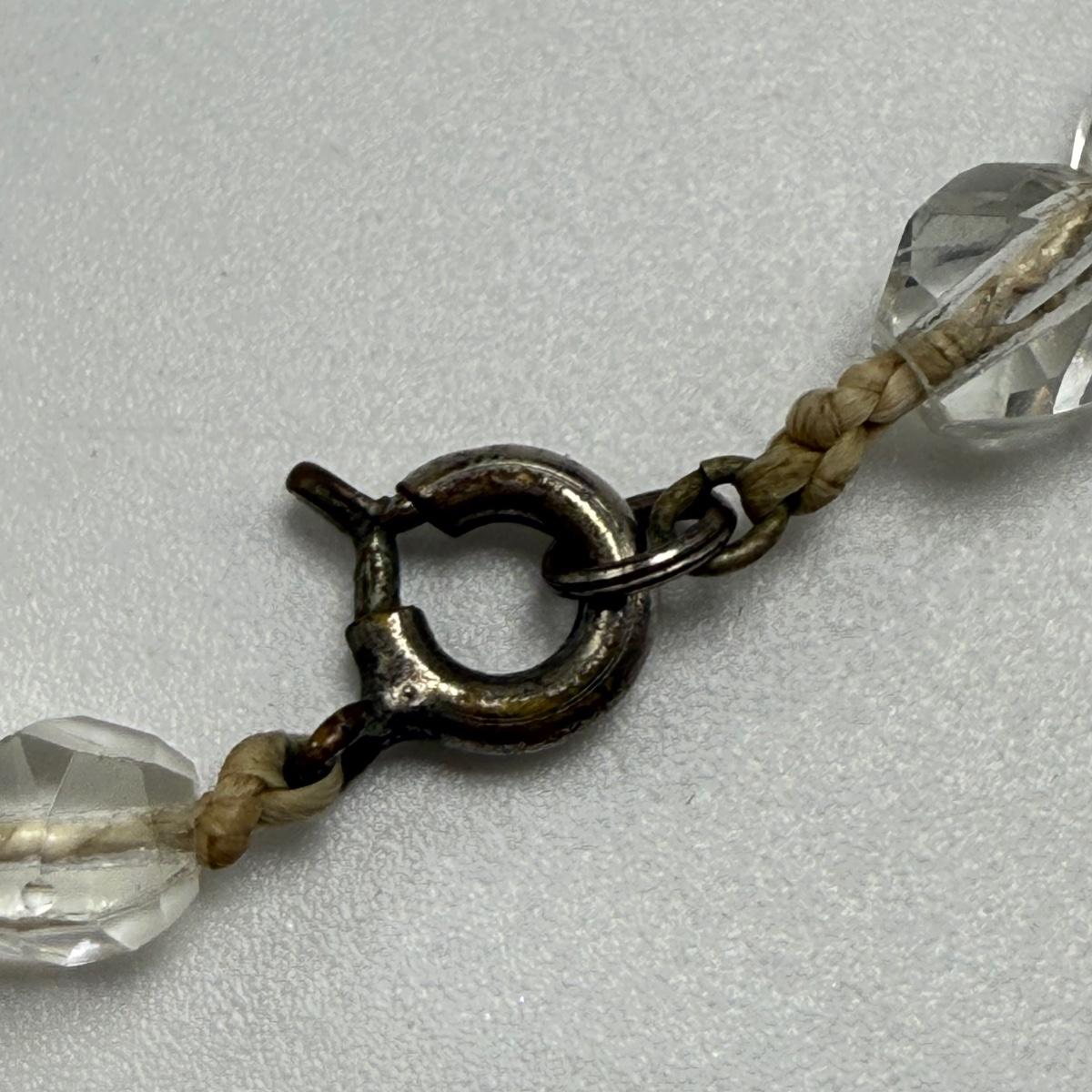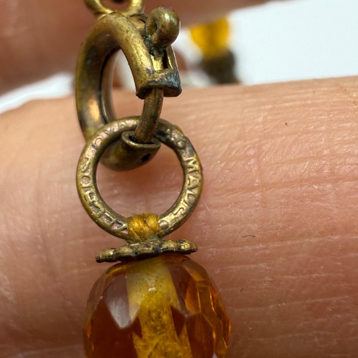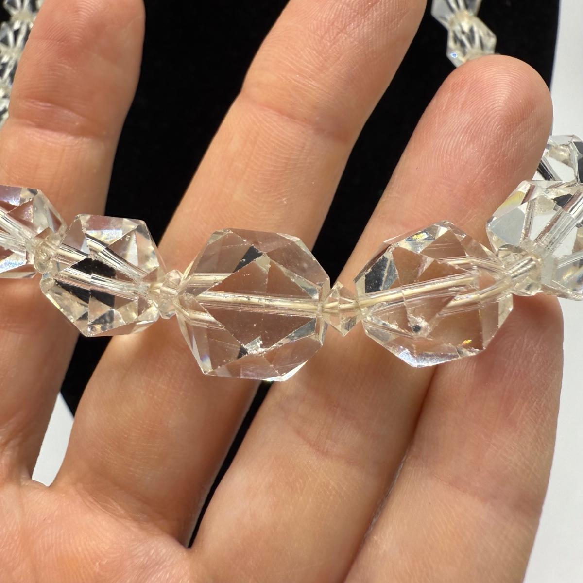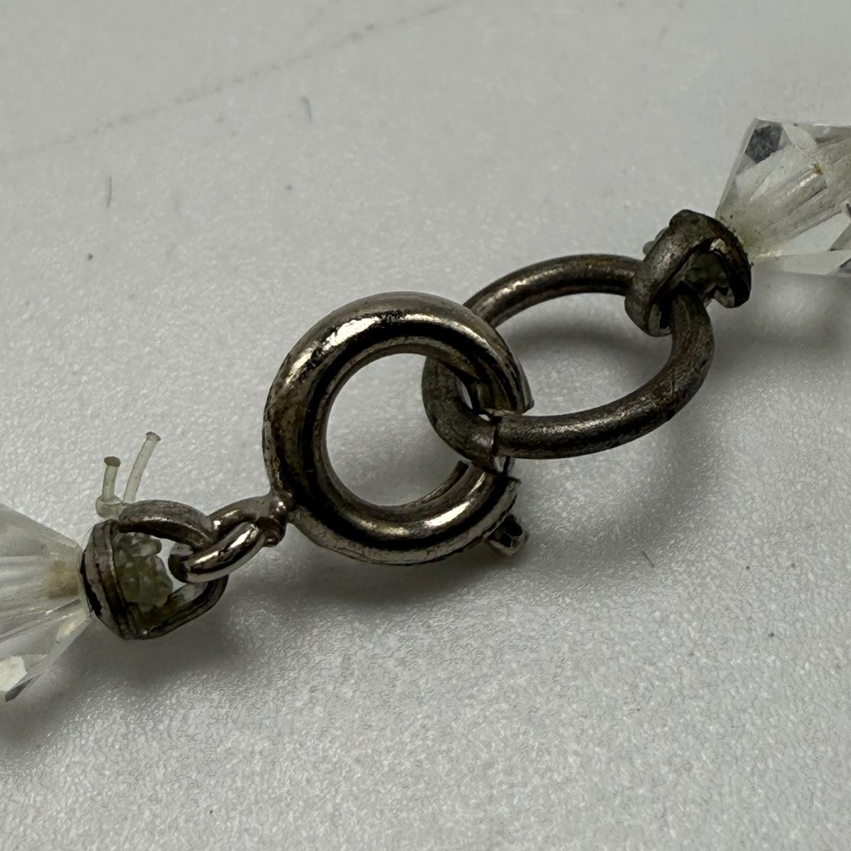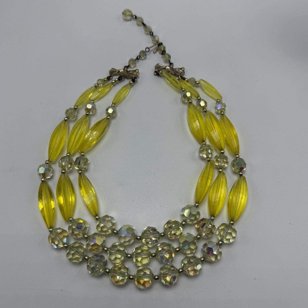 Seven vintage beaded necklaces. One has a matching pair of clip-on earrings. A few of the necklaces have previous price tags with descriptions attached. We cannot verify the information on the tags. One clasp is stamped “Sterling”. The longest necklace, showed doubled up, is approximately 54“. The pink multi-strand necklace needs a new clasp.